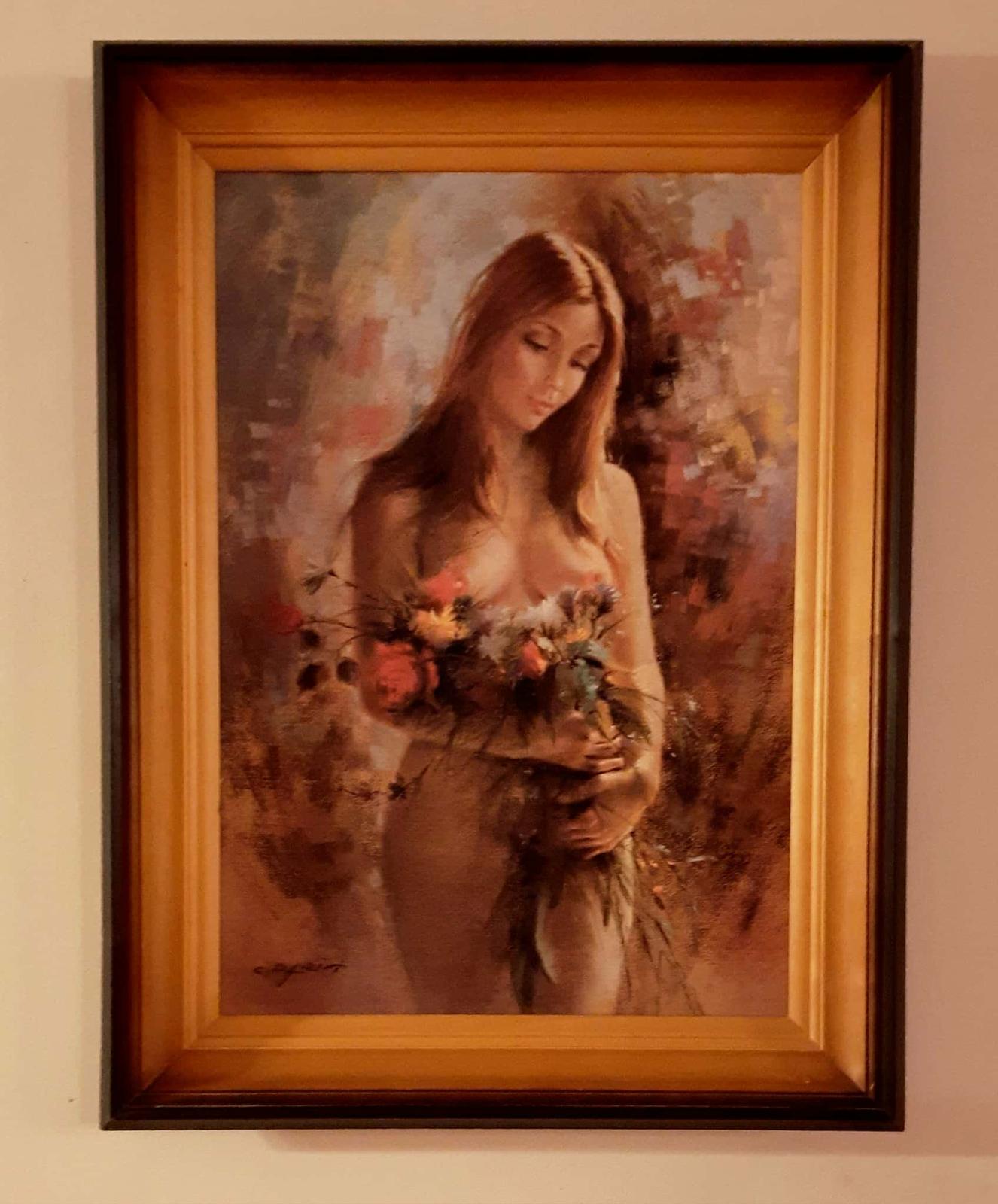 Predám obraz-olejomaľba-akt ženy s kvetmi v drevenom ráme