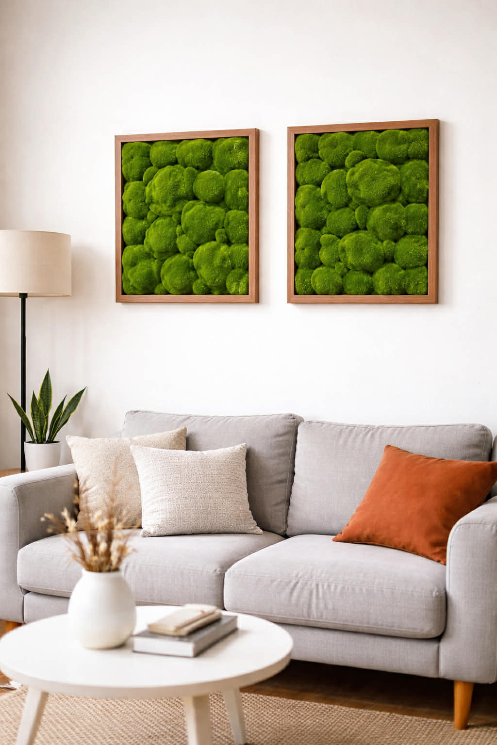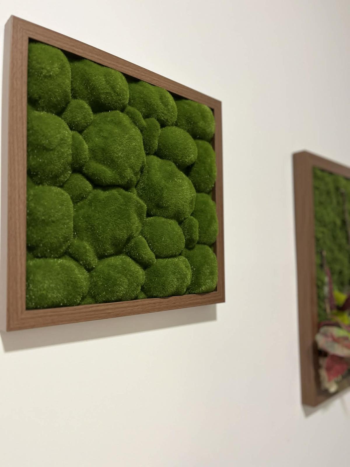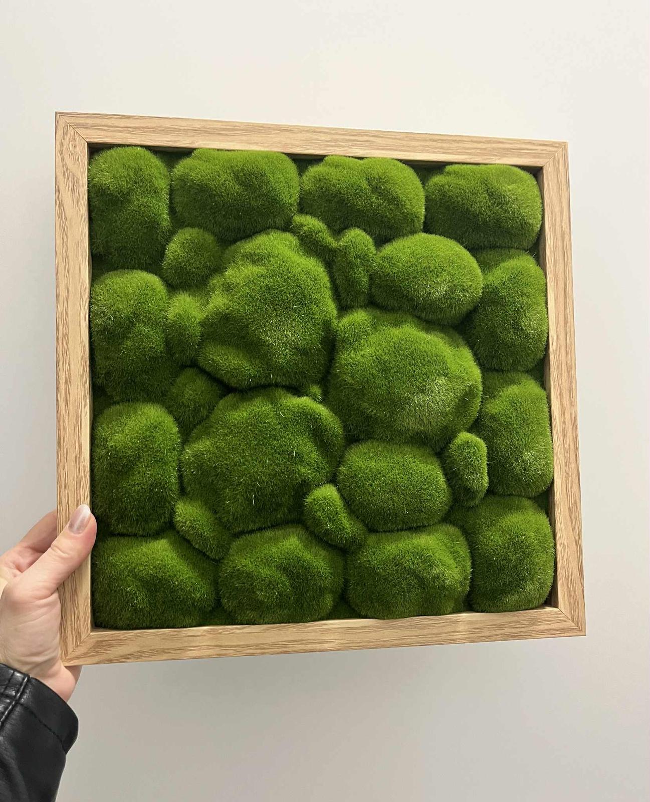 Tento jedinečný 3D obraz je vytvorený z kvalitného umelého machu s výrazným plastickým efektom. Mach tvorí mäkké, zaoblené „vankúšiky“, ktoré pripomínajú prírodné machové ostrovčeky. Vďaka tomu obraz pôsobí živo, priestorovo a dodáva interiéru príjemný biologický charakter. Rám v teplom hnedom odtieni krásne kontrastuje so sýto zeleným machom a podčiarkuje jeho organický vzhľad.