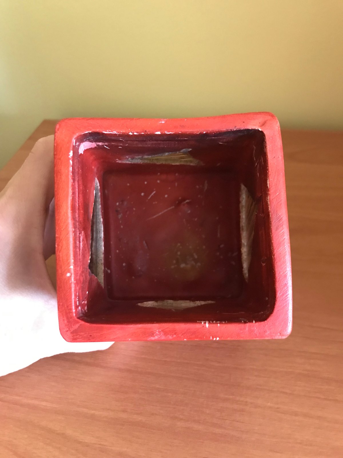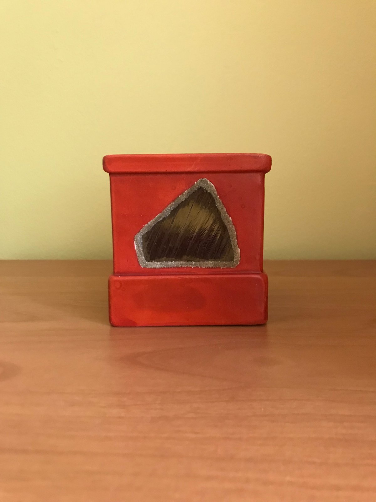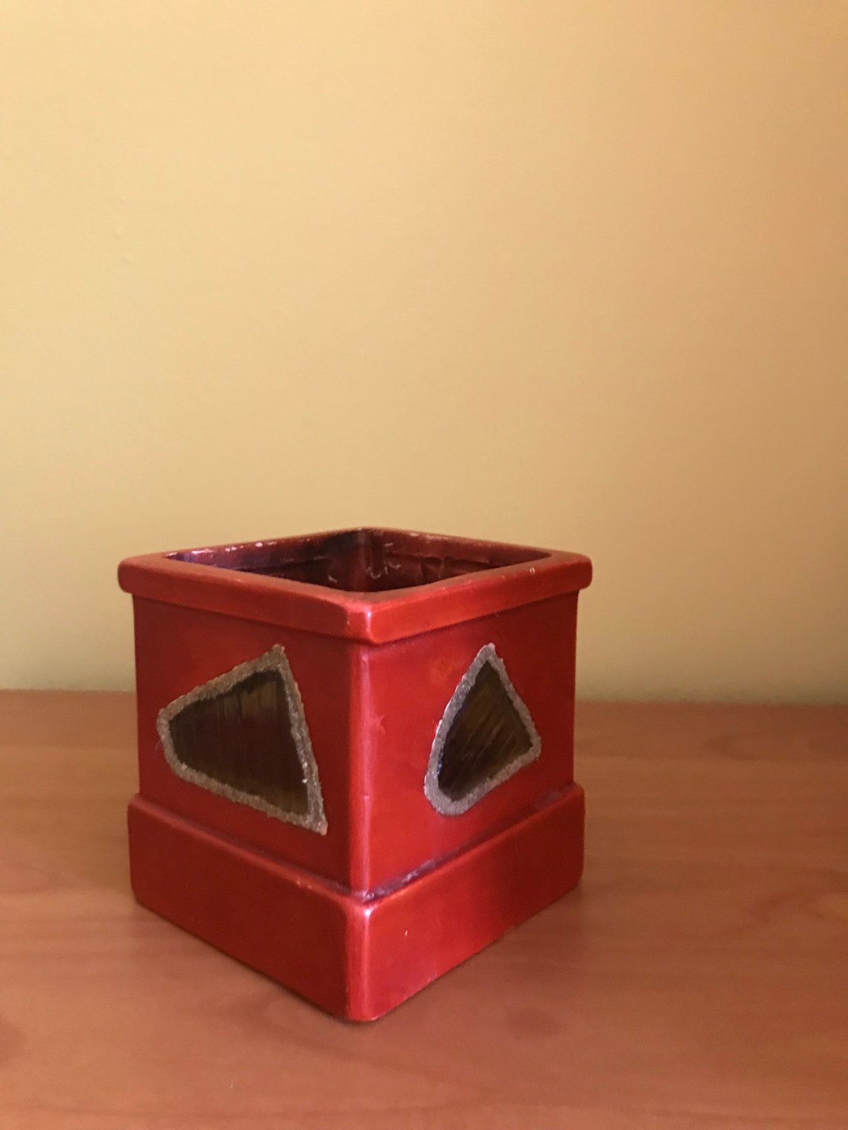 Dekoračný keramický svietnik na čajovú sviečku - farba tmavá tehla; okienka z dekoračného ("voda") priehľadného skla. Používaný, veľmi dobrý stav. Rozmery: 8,5 x 8,5 x 9 cm.