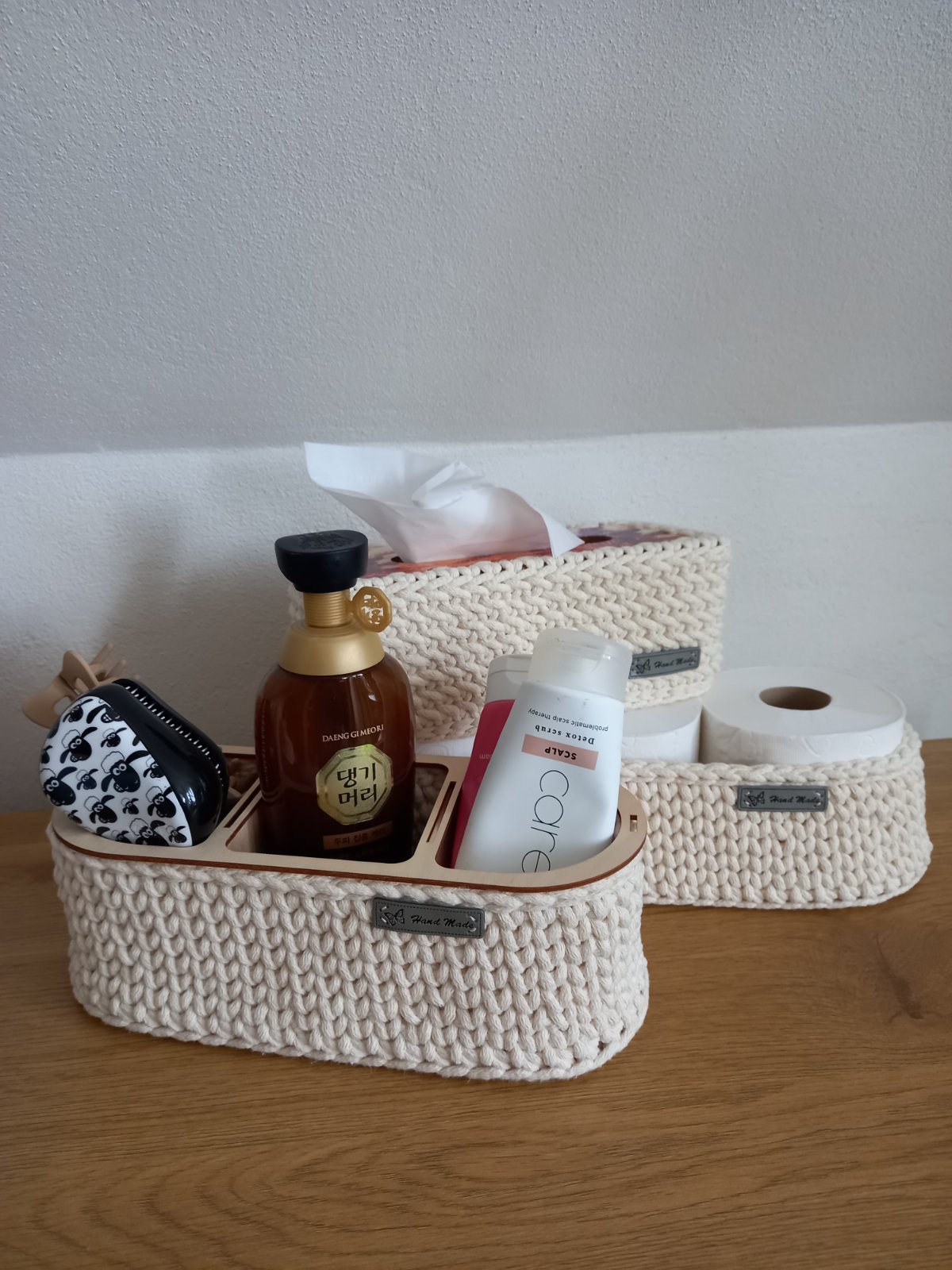 Predam hackovane kosiky s drevenym dnom v bezovej farbe. Rozmer kosika 40x14cm, kosik s organizerom30x12cm. Plus vreckovnik s malovanym vrskom. Vhodne aj ako darcek. Cena 35eur