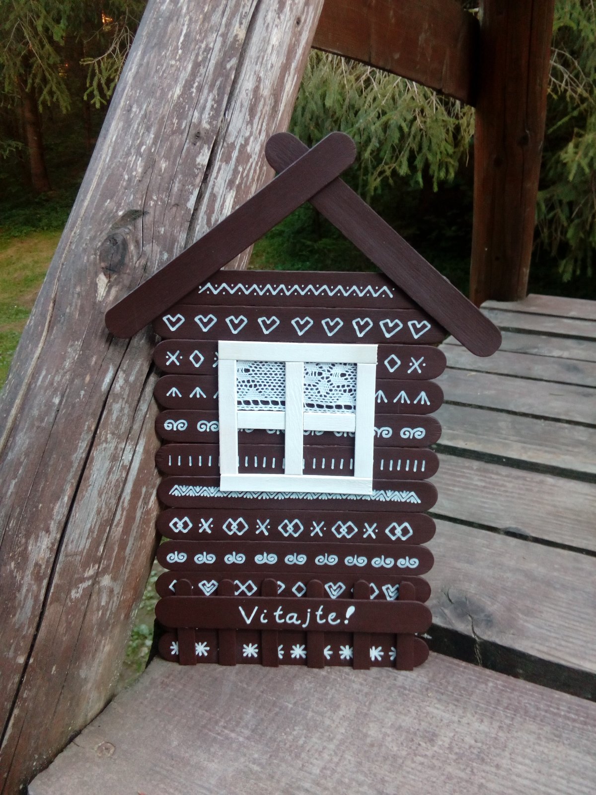 Domček vyrobený z drevených paličiek..maľovaný akrylovými farbami..vzory ručne kreslené..dekorované textilnou čipkou..vyrobím do týždňa..na zavesenie