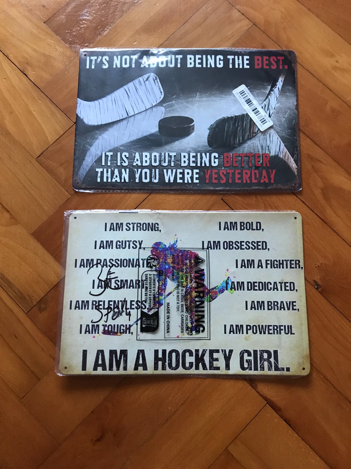 druhá tabuľka: motivačné heslá a nápis "I am a hockey girl."