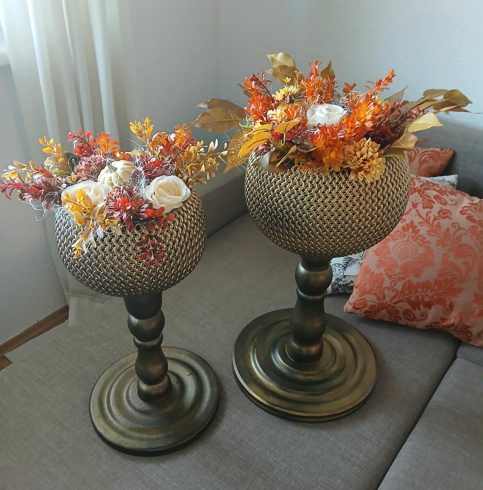 Krásne, nové, jesenné dekorácie na drevených stojanoch. Nižšia dekorácia je vysoká 53cm a jej priemer je 27cm. Cena je 25e. Vyššia dekorácia je vysoká 58cm a jej priemer je 32cm. Cena je 35e.