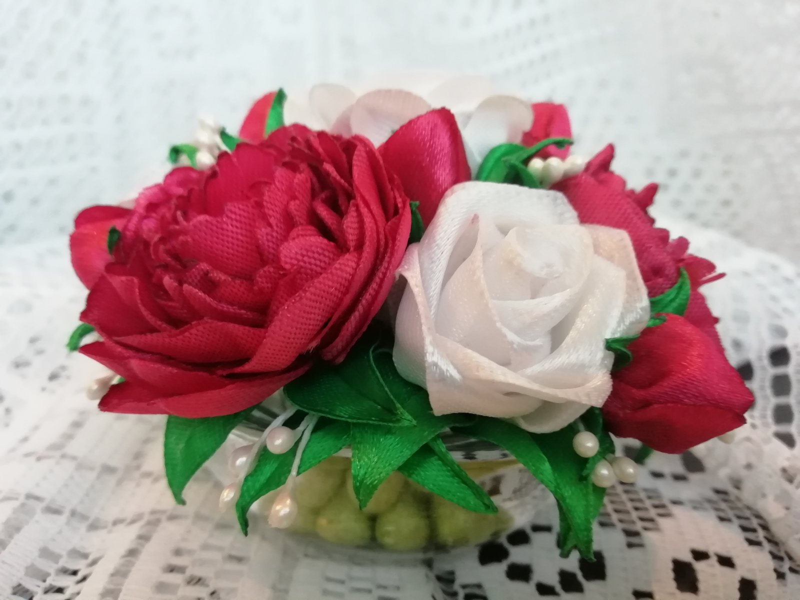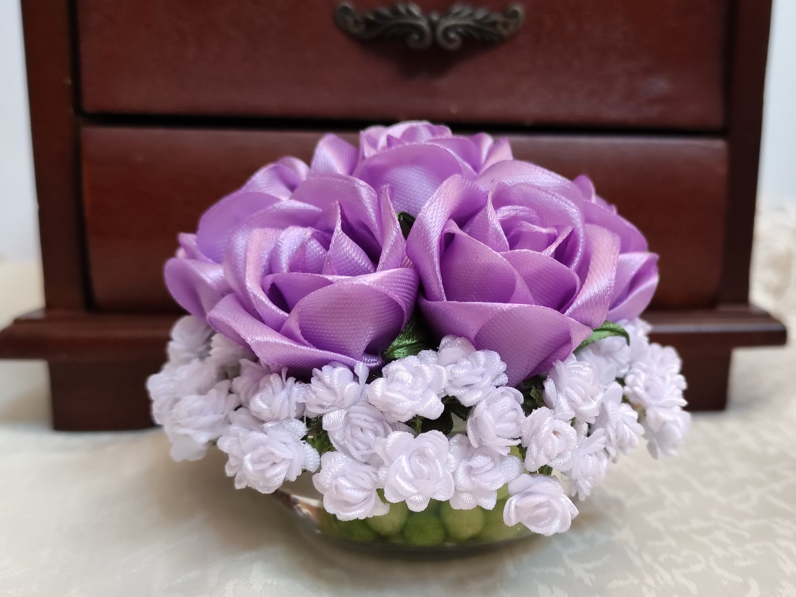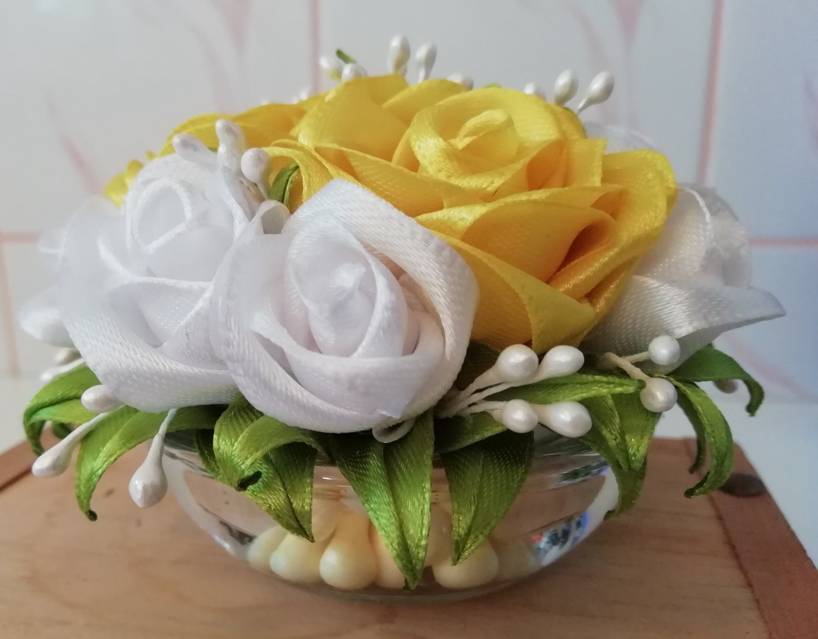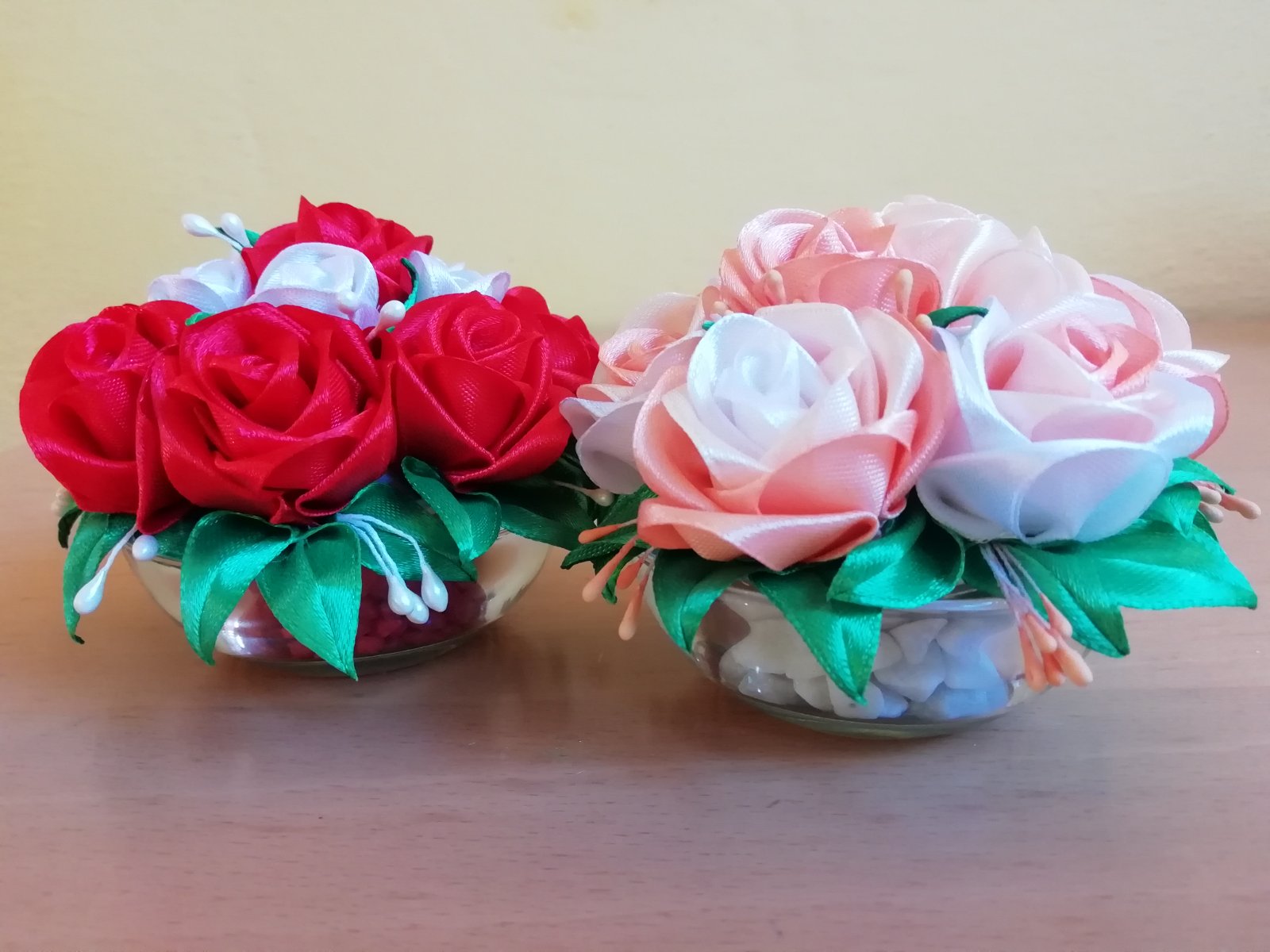 Aranžmán z kvetov zo saténovej stuhy v sklenenej nádobe naplnenej polystyrénovými guľôčkami alebo kamienkami. Farby a druhy kvetov podľa želania zákazníka. Šírka cca 10 cm, výška cca 7 cm