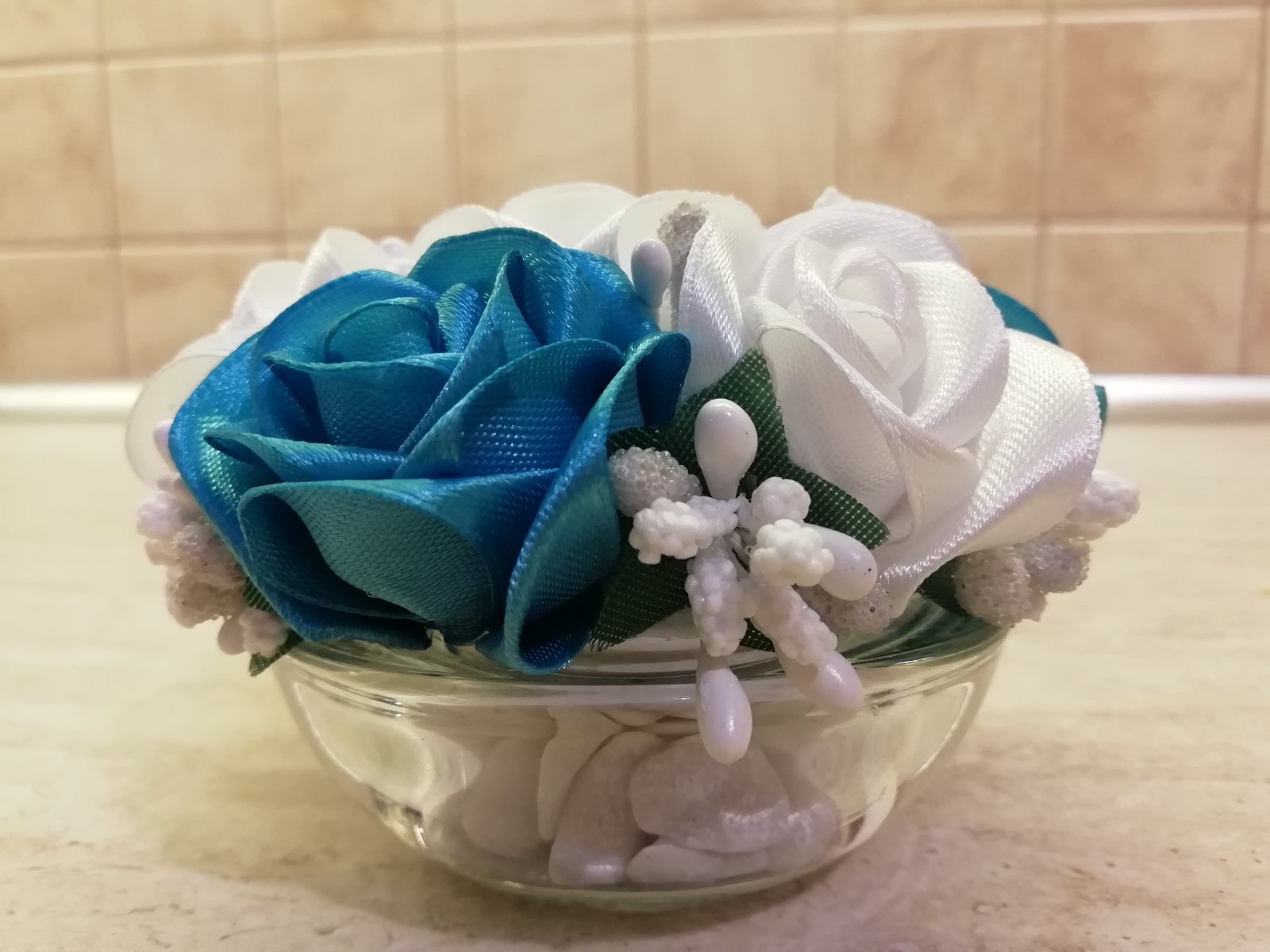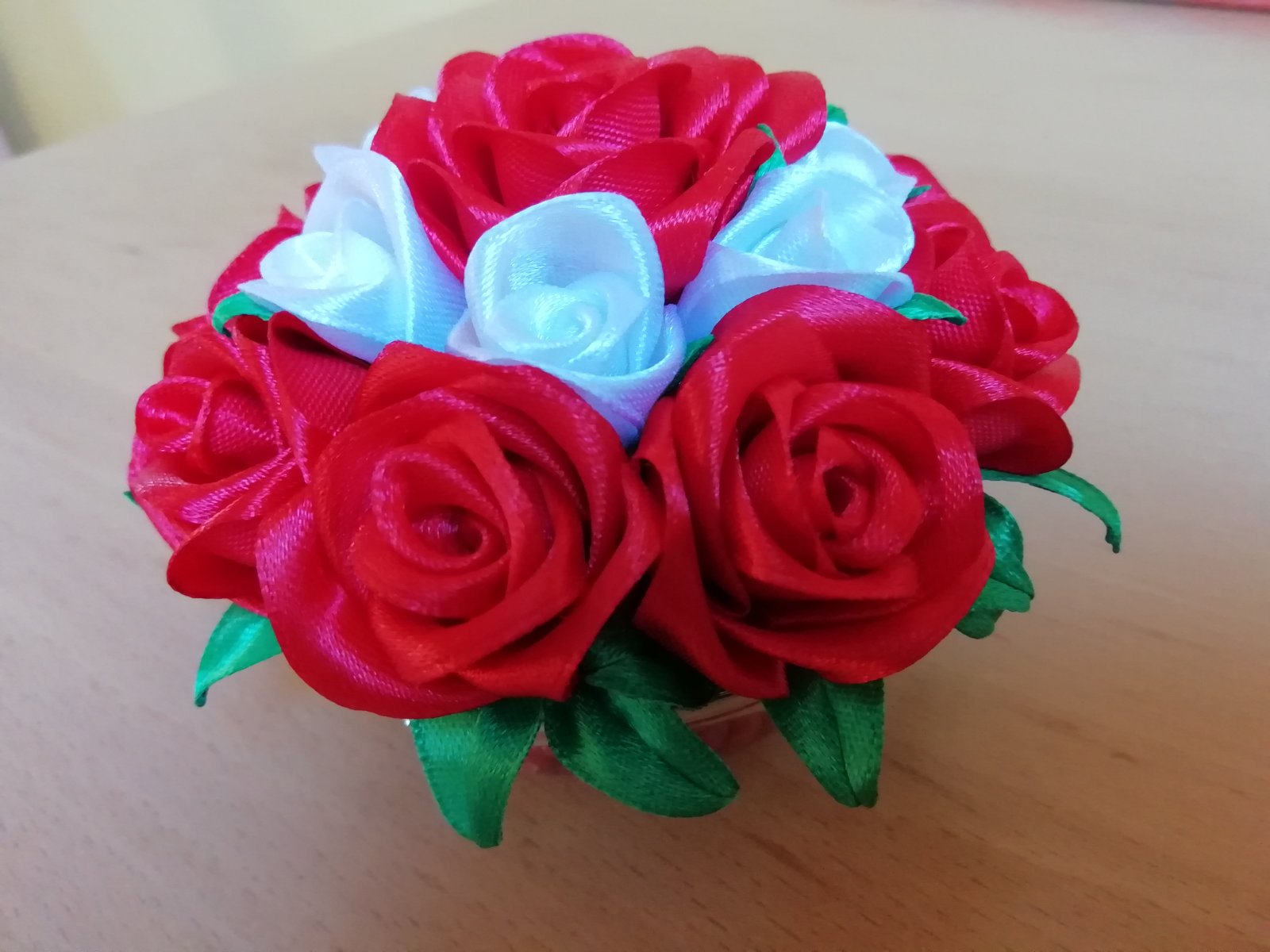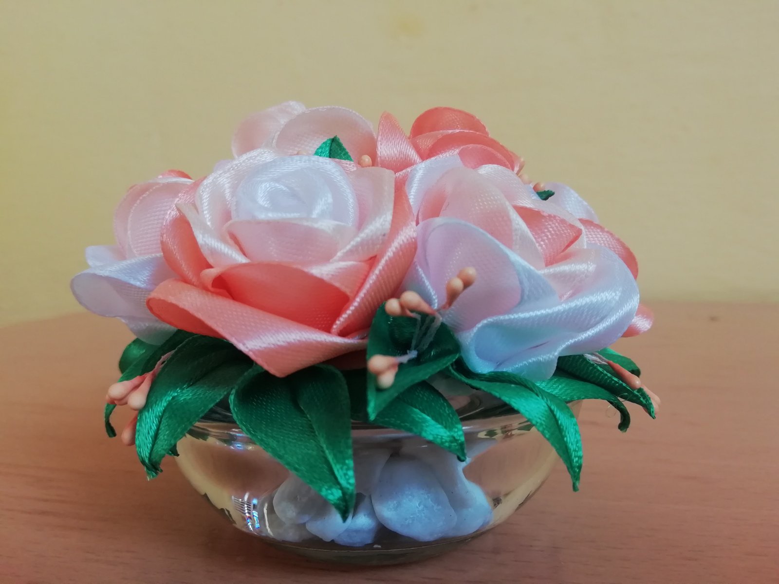 Aranžmán z kvetov zo saténovej stuhy v sklenenej nádobe naplnenej polystyrénovými guľôčkami alebo kamienkami. Farby a druhy kvetov podľa želania zákazníka. Šírka cca 10 cm, výška cca 7 cm