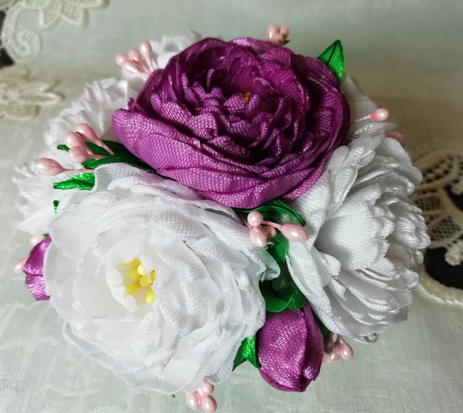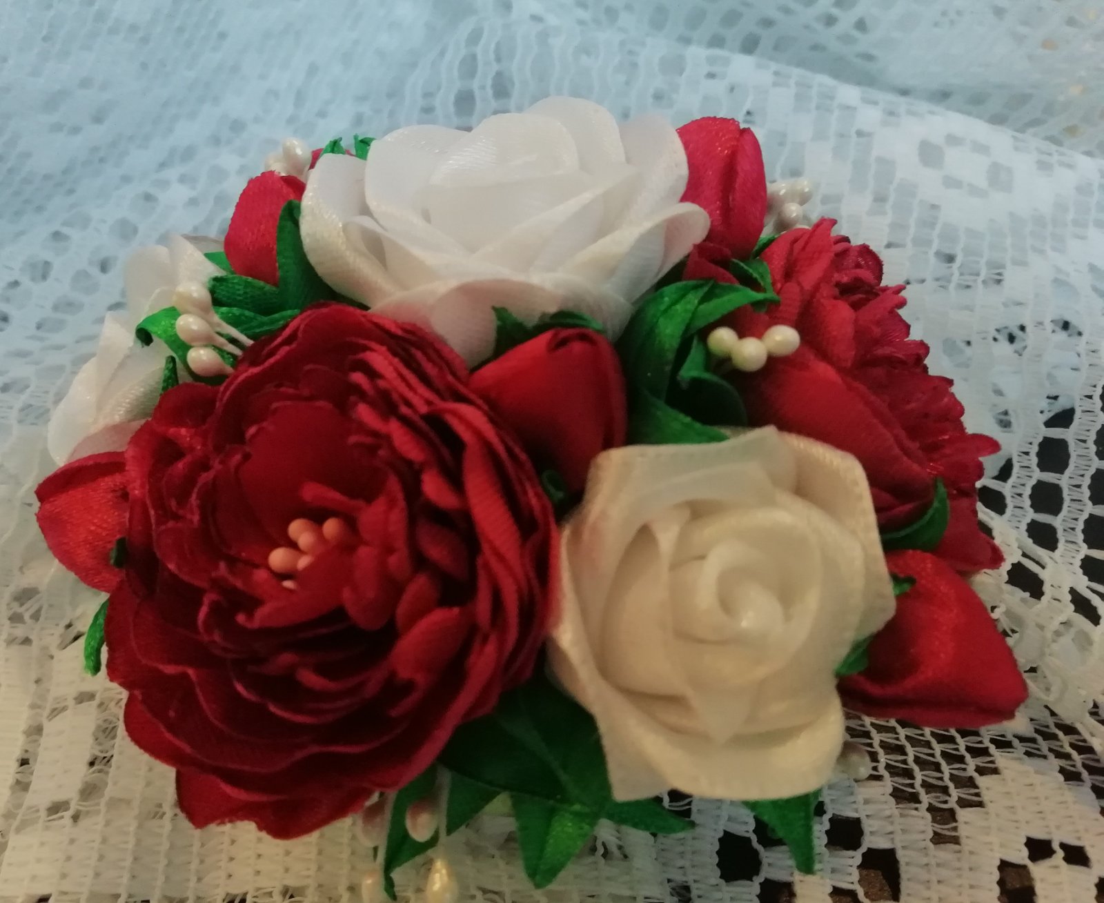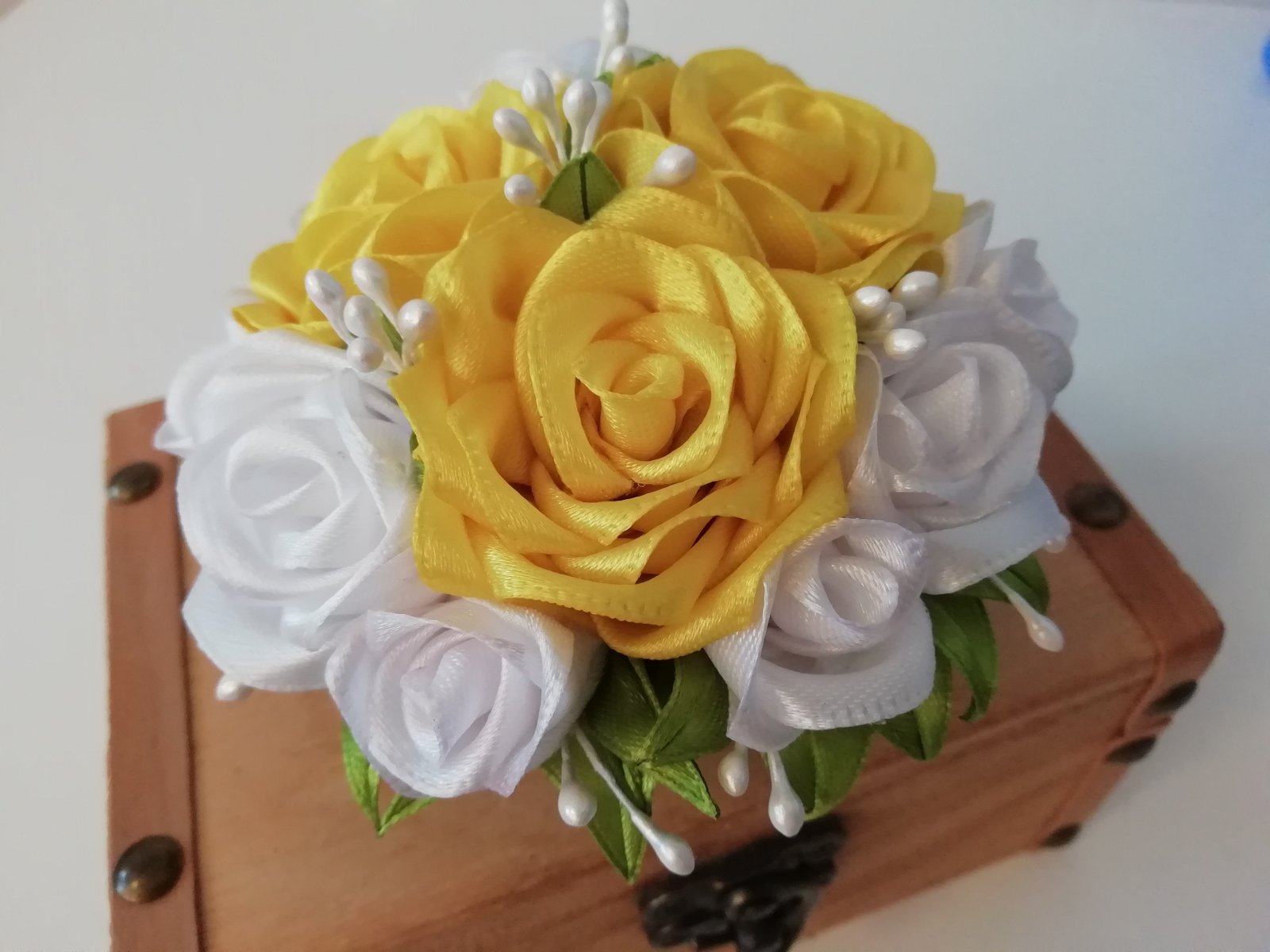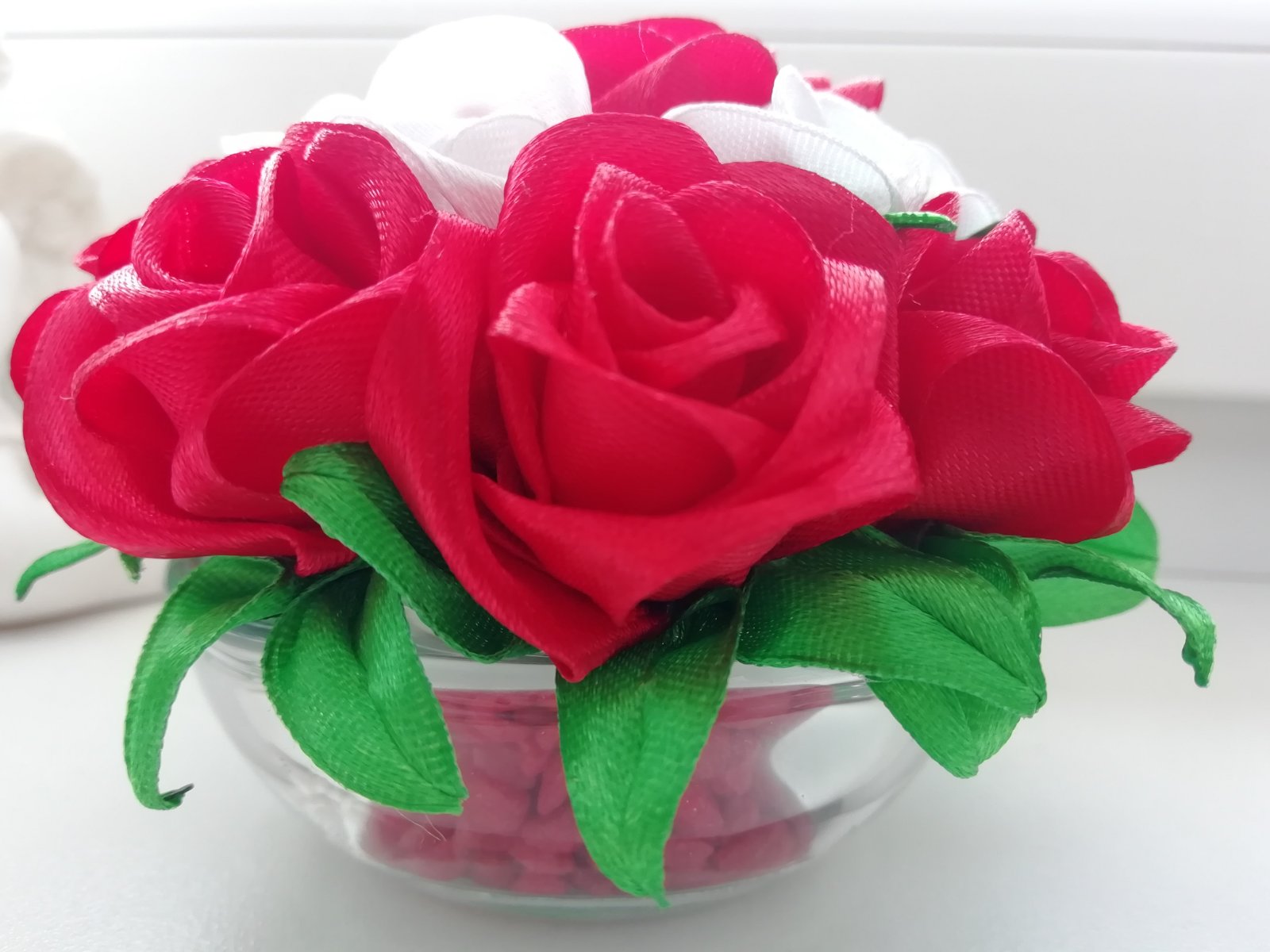 Aranžmán z kvetov zo saténovej stuhy v sklenenej nádobe naplnenej polystyrénovými guľôčkami alebo kamienkami. Farby a druhy kvetov podľa želania zákazníka. Šírka cca 10 cm, výška cca 7 cm