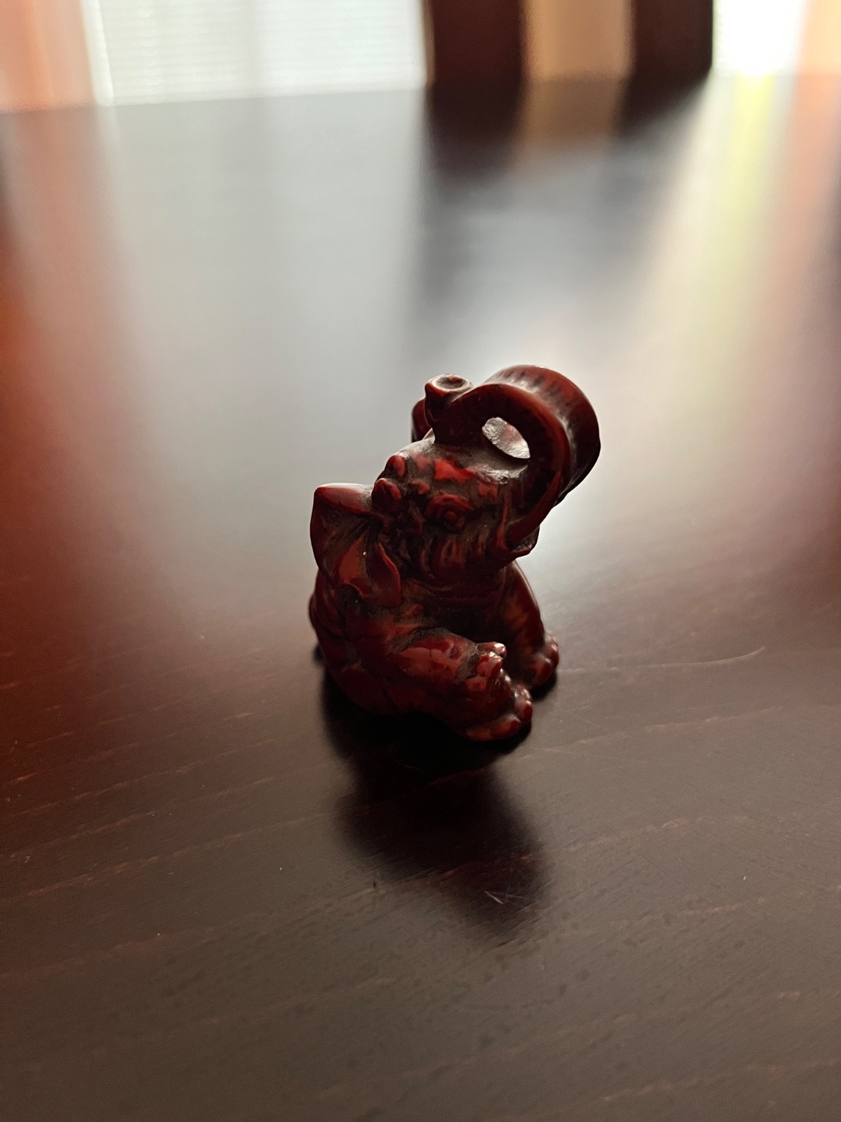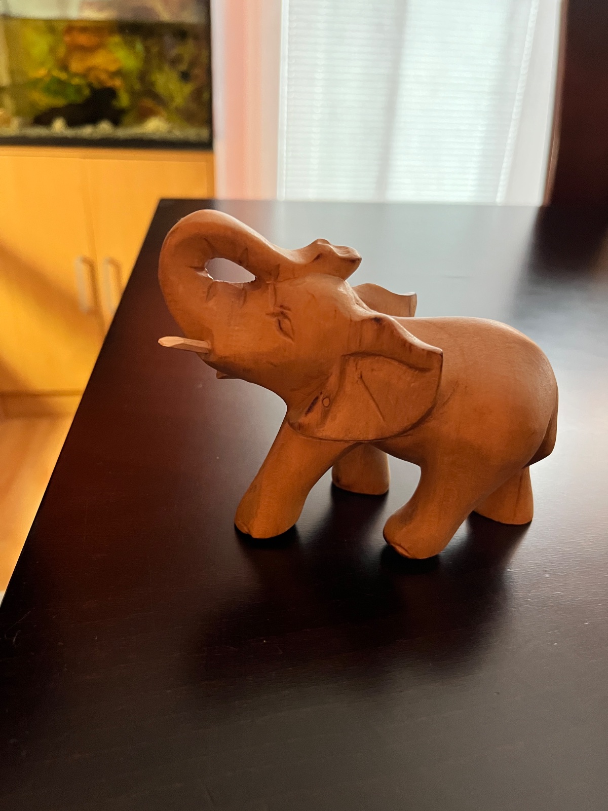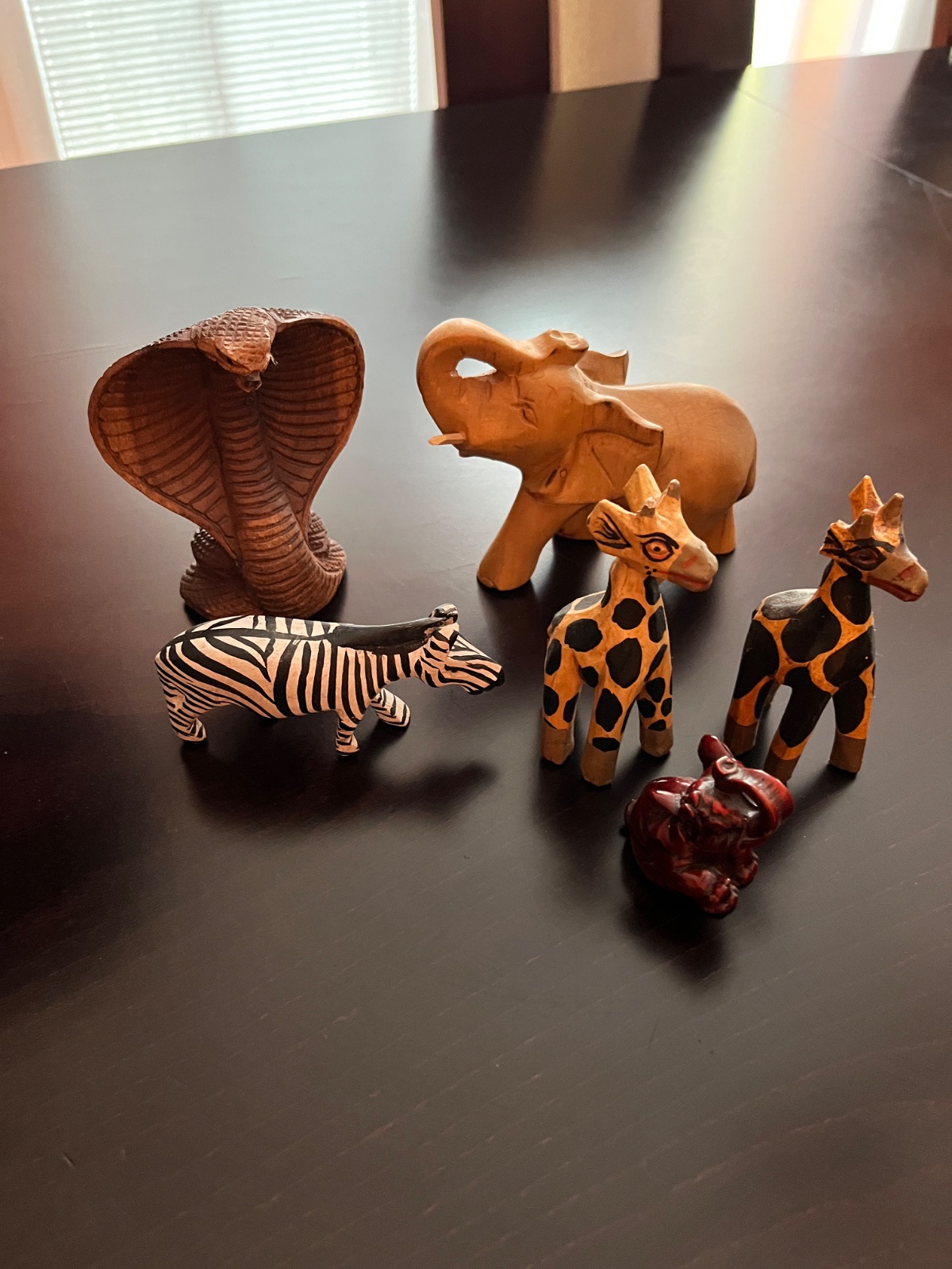 Súprava ručne vyrezávaných drevených figúrok afrických zvierat. Tradičné drevené umelecké rezbárske práce z Afriky. Malý sloník so zdvihnutým chobotom reprezentuje silu, ambície a moc. Cena za kus 5€