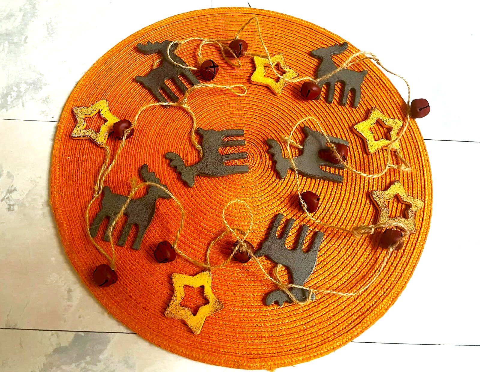 netuctová zvonkohra s roľničkami,vintage naturálny štýl, 180 cm, na naturálnom prírodnom jutovom špagáte,variabilné použitie, sobík cca 9 x 6 cm, v guličkách /zvončekoch ) sú korálky ktoré krásne zvonia,ručná práca,originál,použitá 1Vianoce