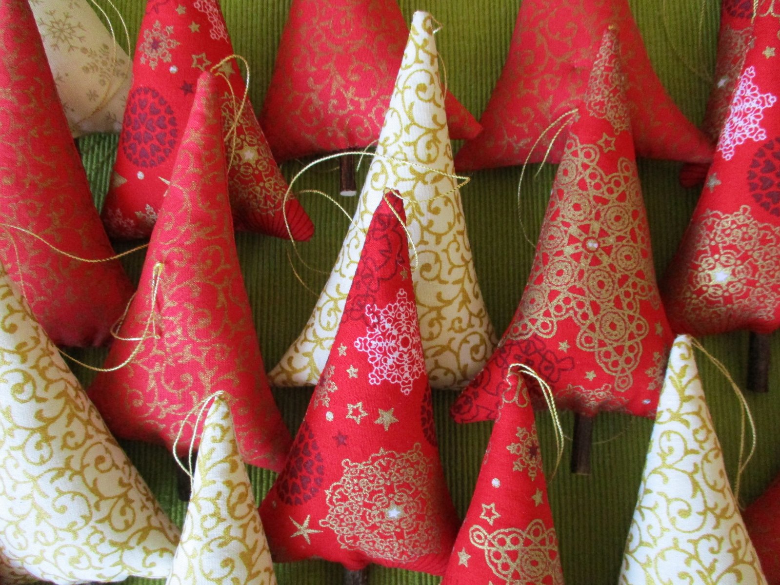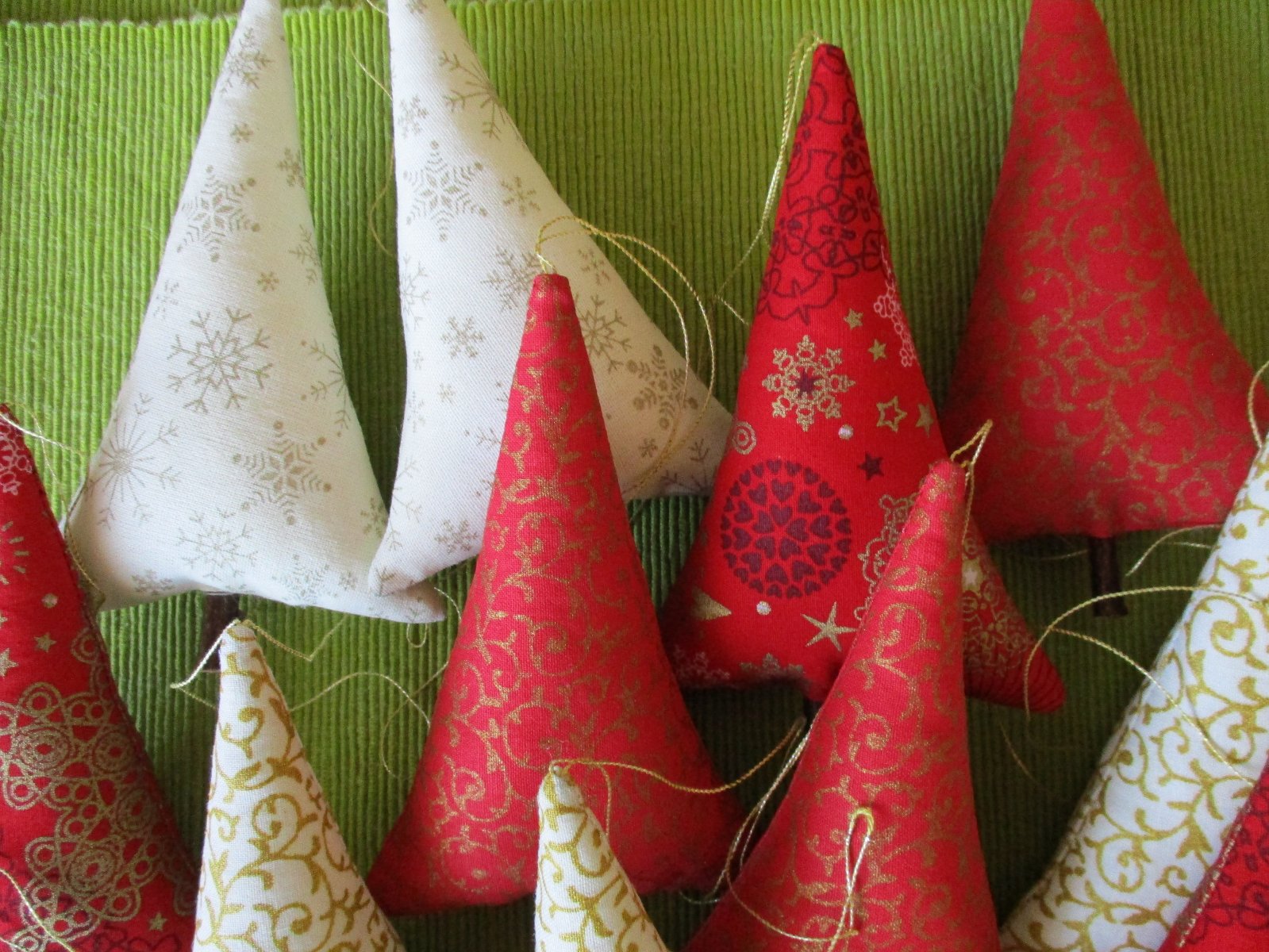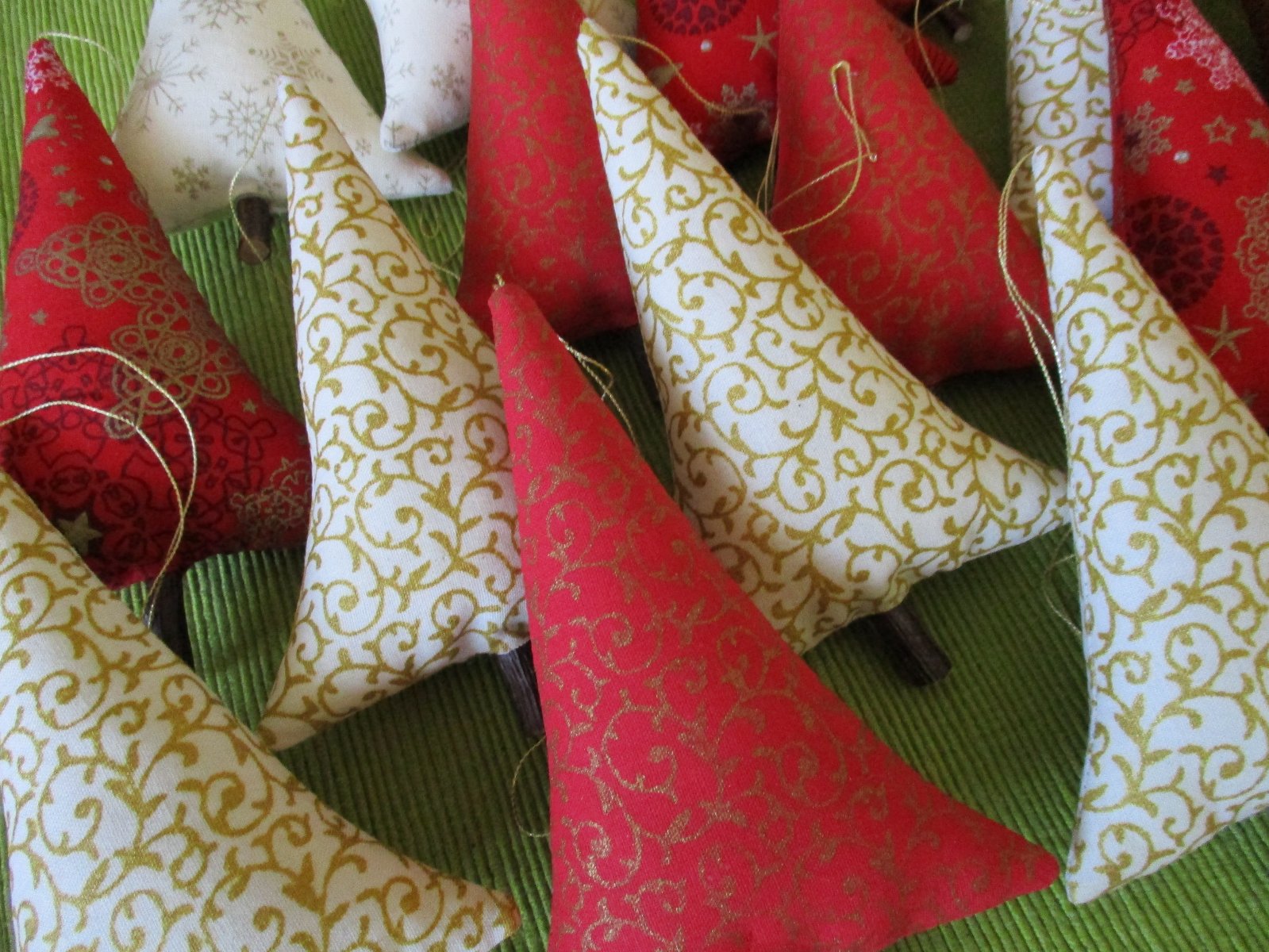 Vianočné stromčeky z bavlnených látok v kombinácii farieb červenej, krémovej a zlatej, vyplnené dutým vláknom, s dreveným kmienkom a so zlatým motúzikom na zavesenie.