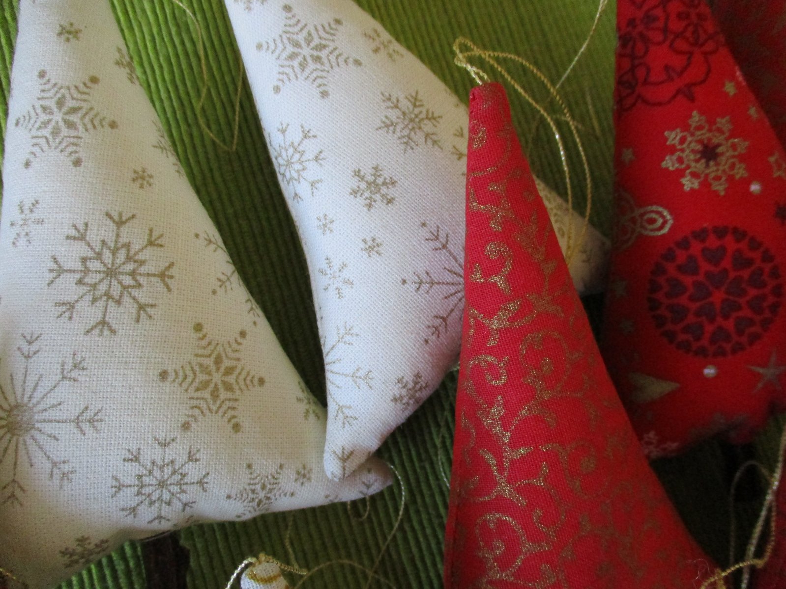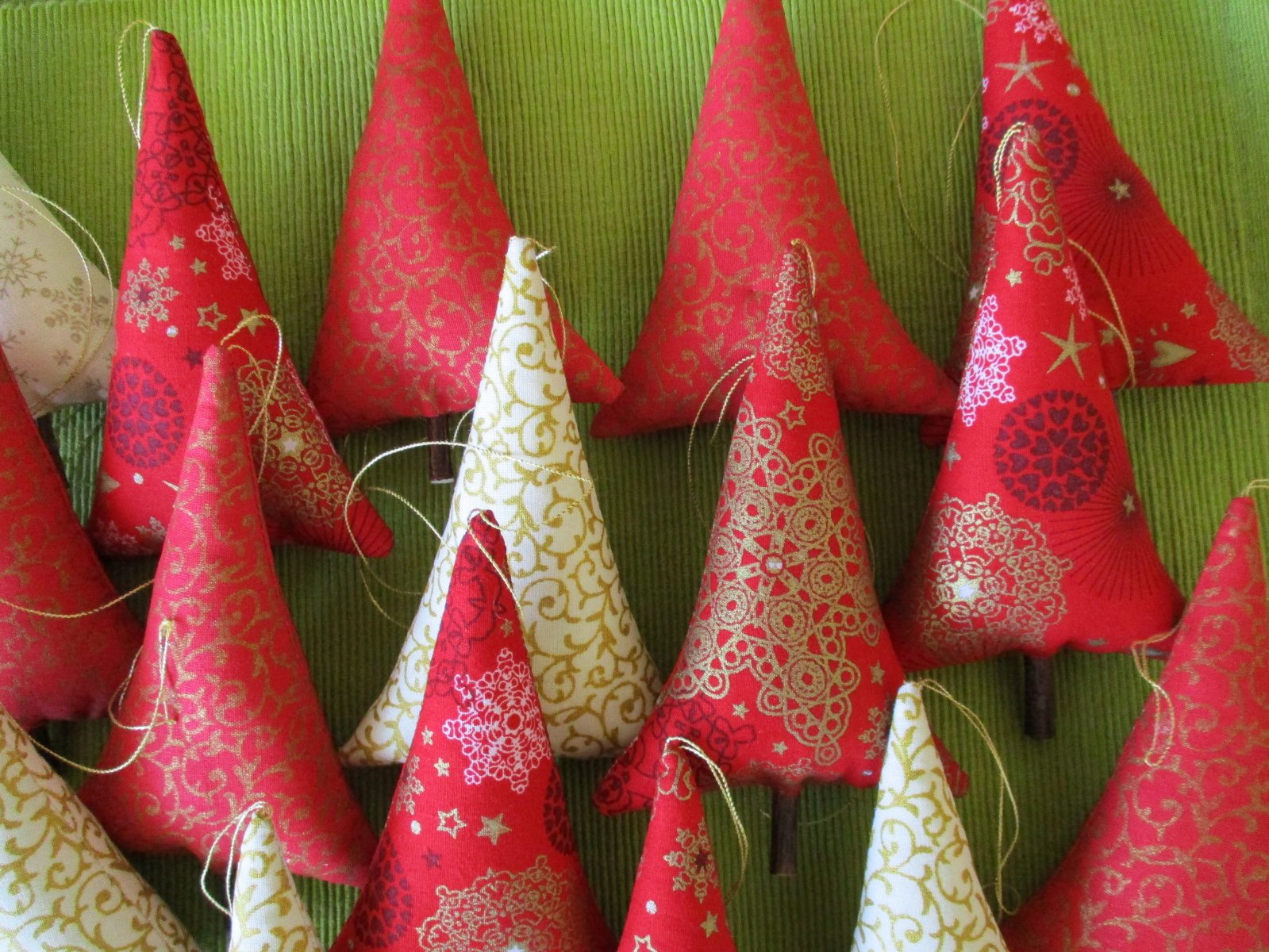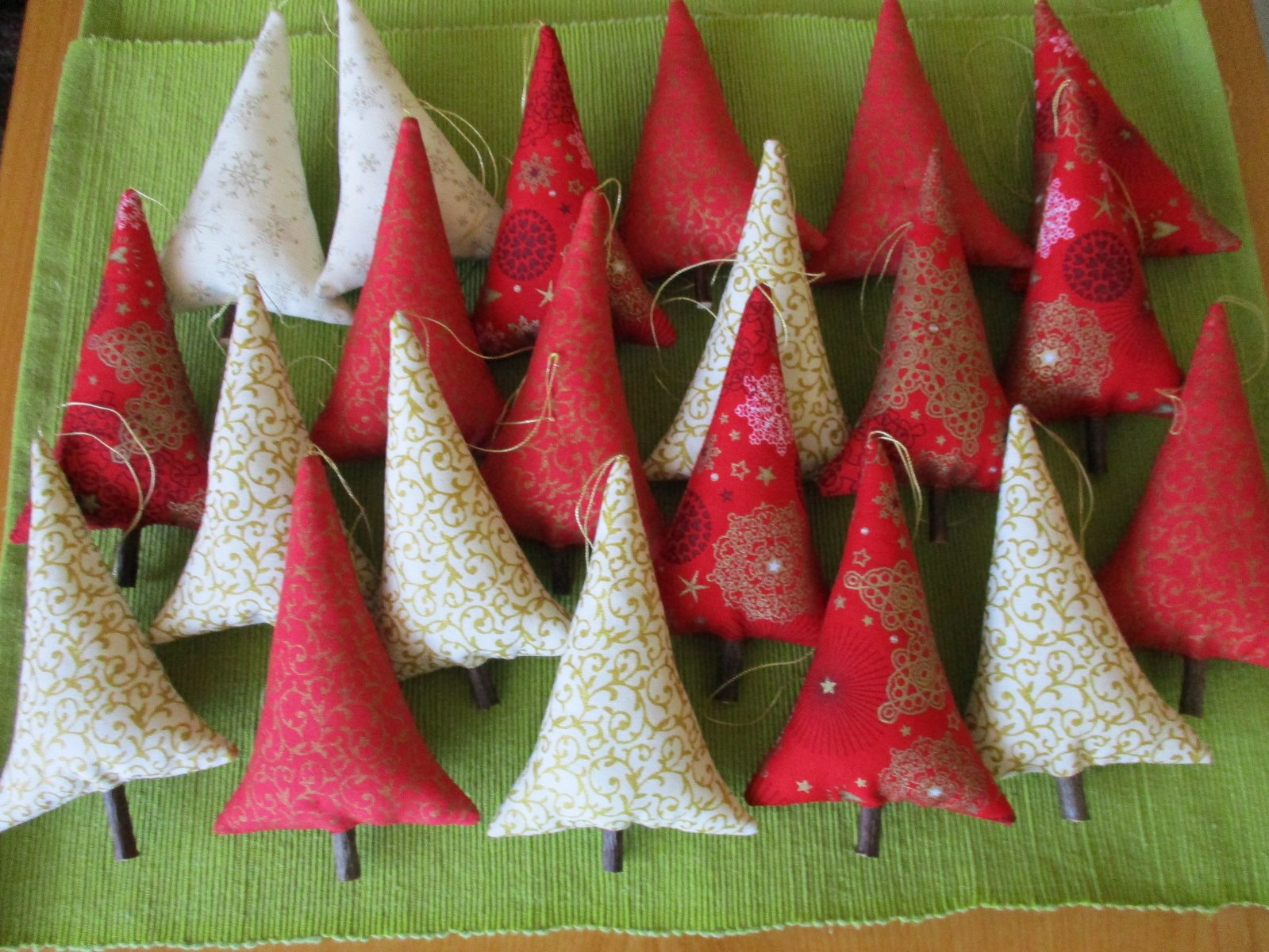 Vianočné stromčeky z bavlnených látok v kombinácii farieb červenej, krémovej a zlatej, vyplnené dutým vláknom, s dreveným kmienkom a so zlatým motúzikom na zavesenie.