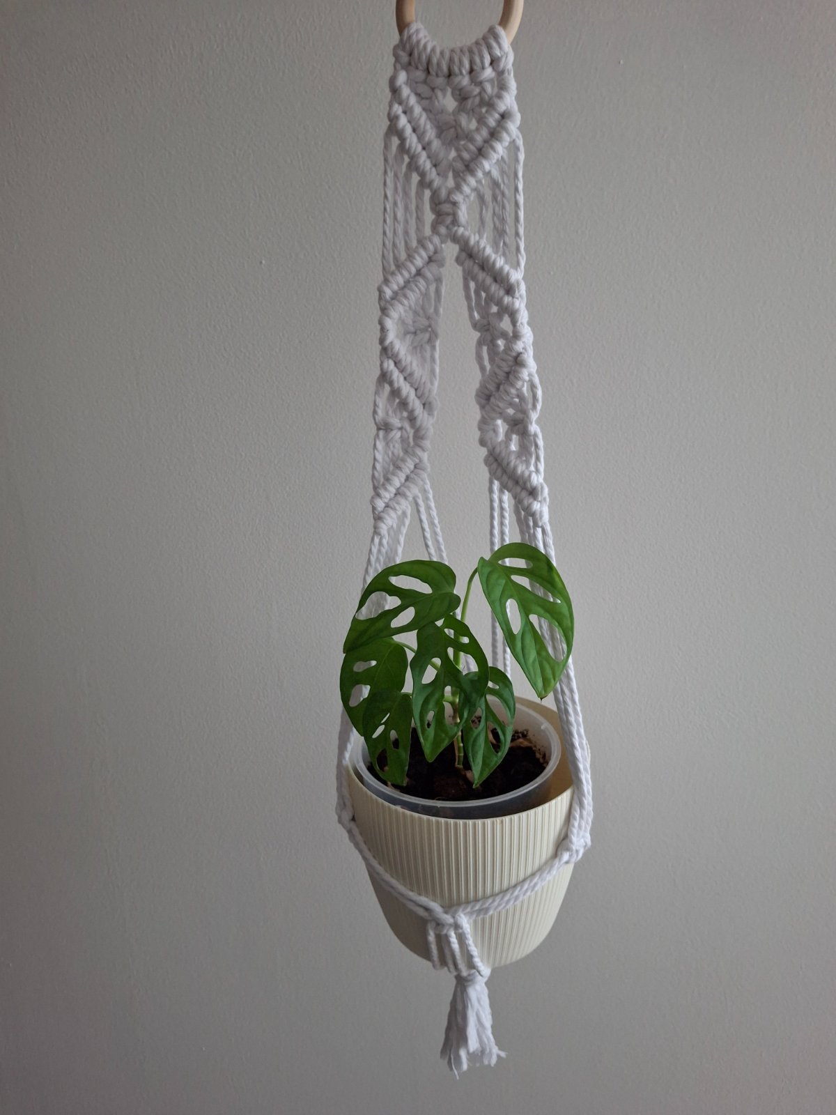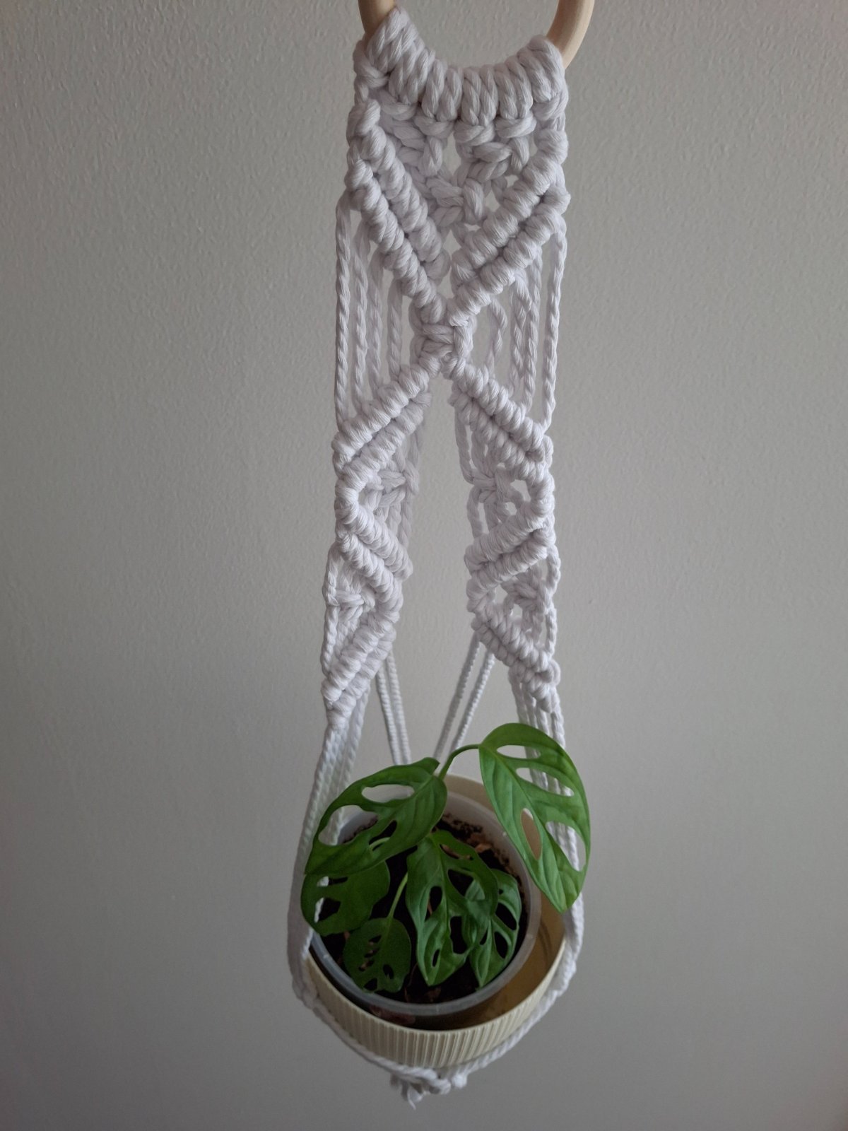Záves na kvetináč v bielej farbe je vyrobený technikou macramé. Celková dĺžka bez kvetináča vo vnútri je cca 77 cm. Záves sa vešia na drevený krúžok s vonkajším priemerom 7 cm a vnútorným priemerom 4,5 cm. Záves je určený do interiéru.