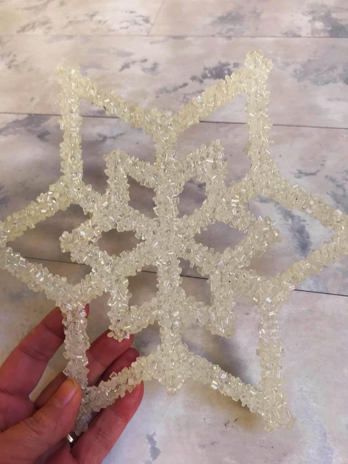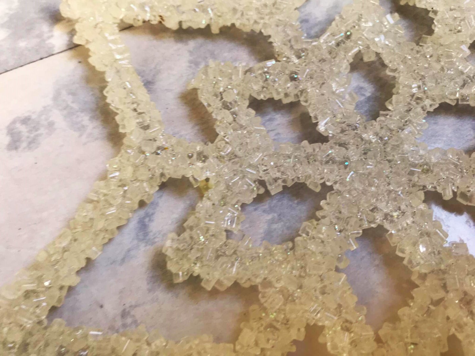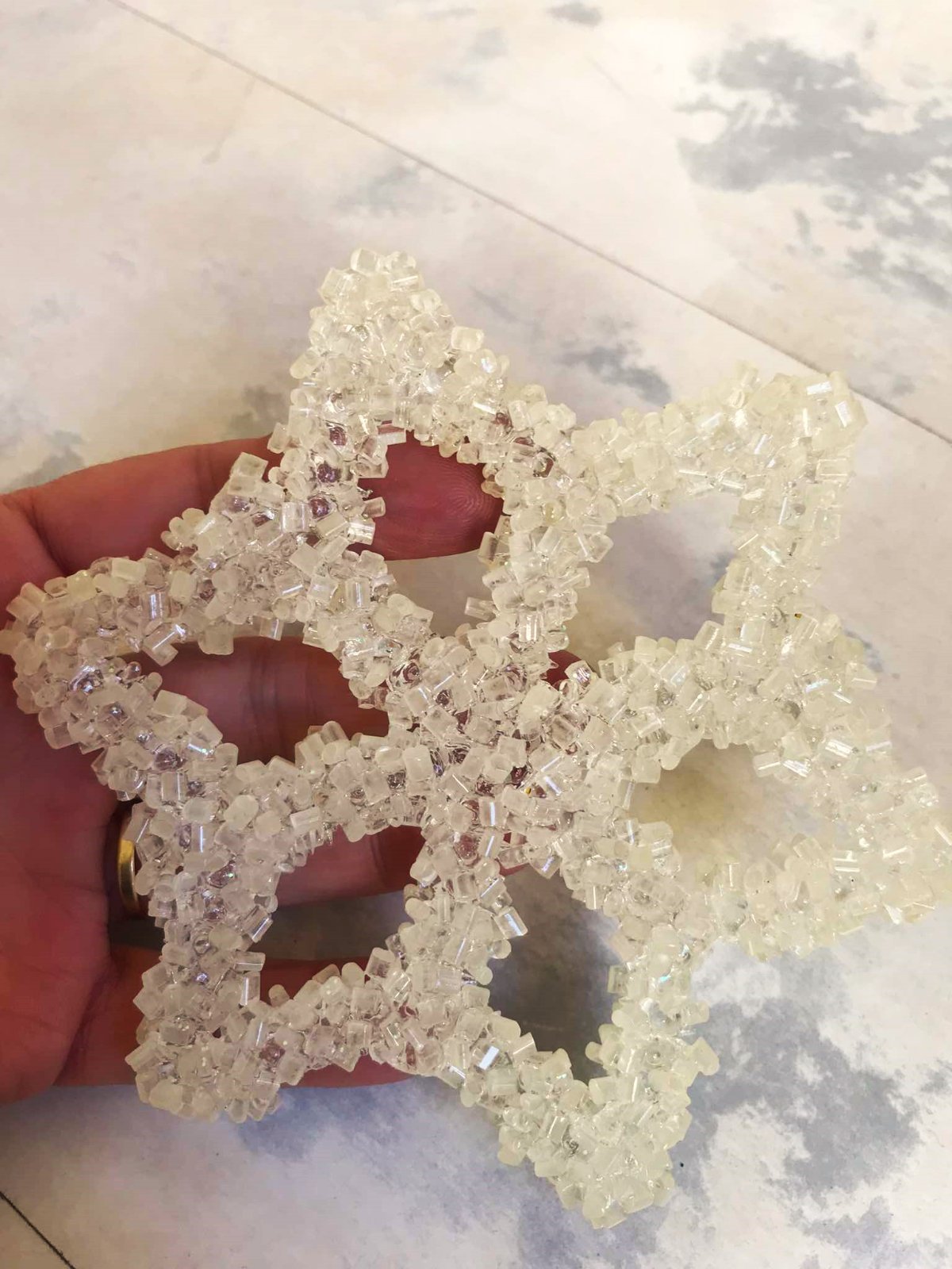 nádherná dekorácia vhodná na Vianoce - krehká,sklenená,vyzerá to,ako keby pocukrované kryštálmi,25 x 25 cm,13 x 13 cm,smotanovo biele priesvitné,top stav,min.použité,pekne to vyzerá aj ako zavesené na jemný silon,alebo na klinci,alebo opreté na polici ako stojatá dekorácia