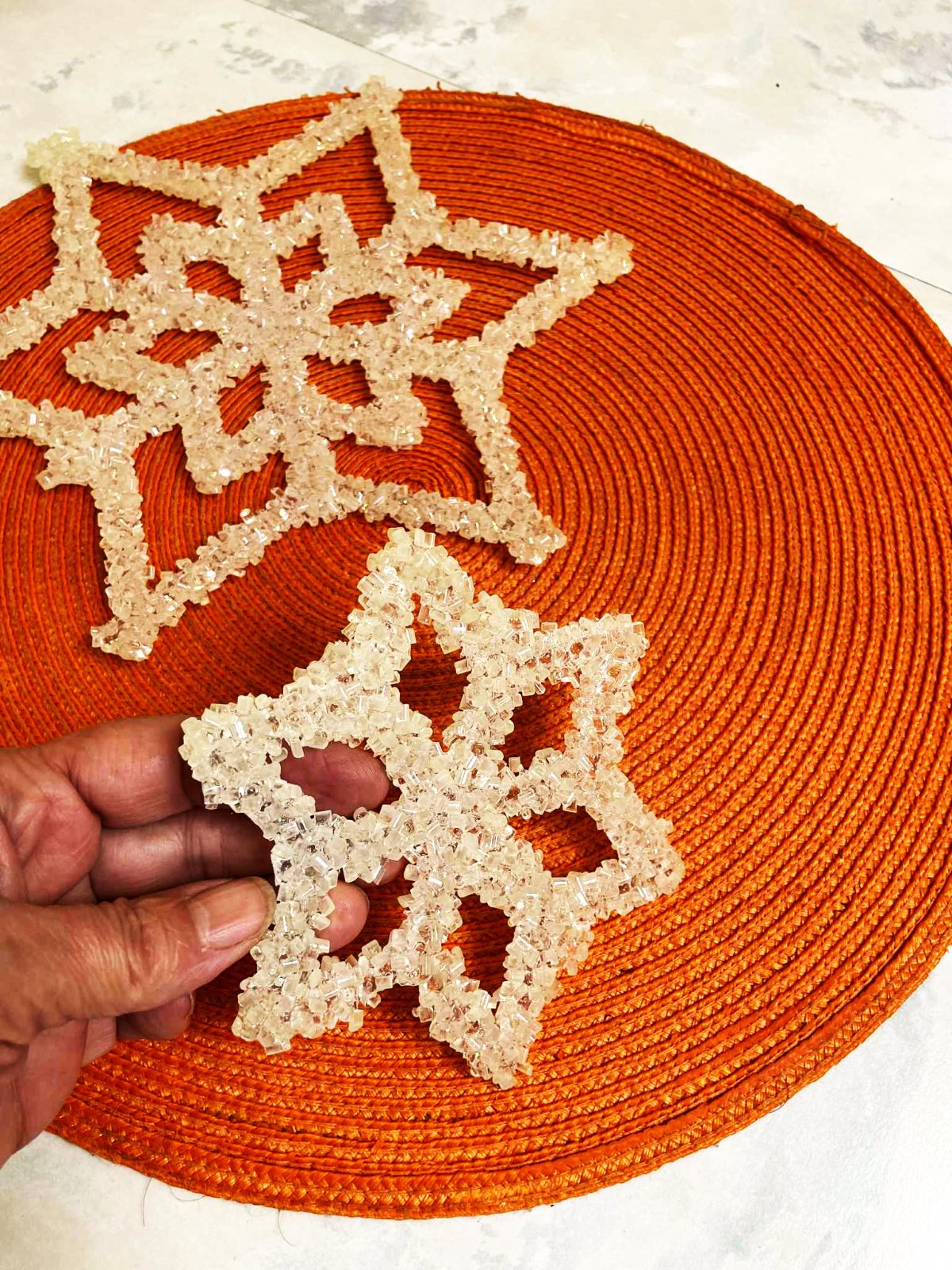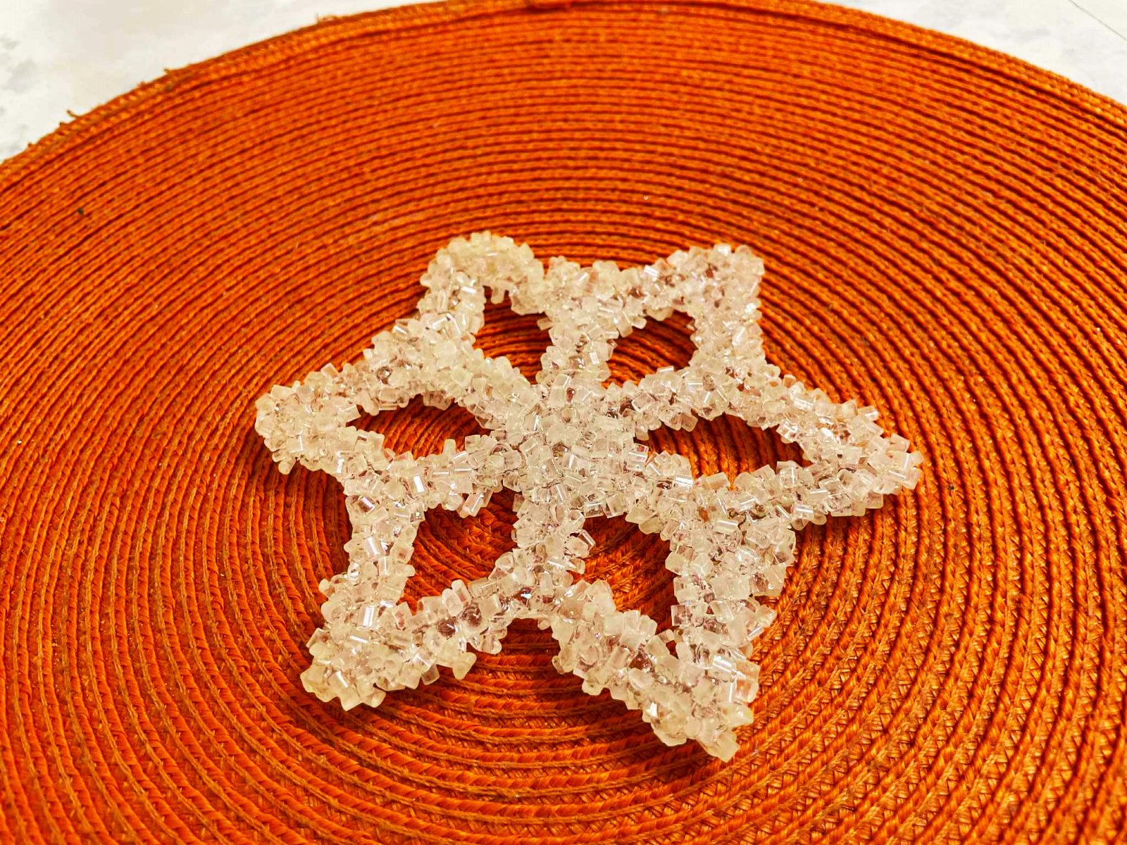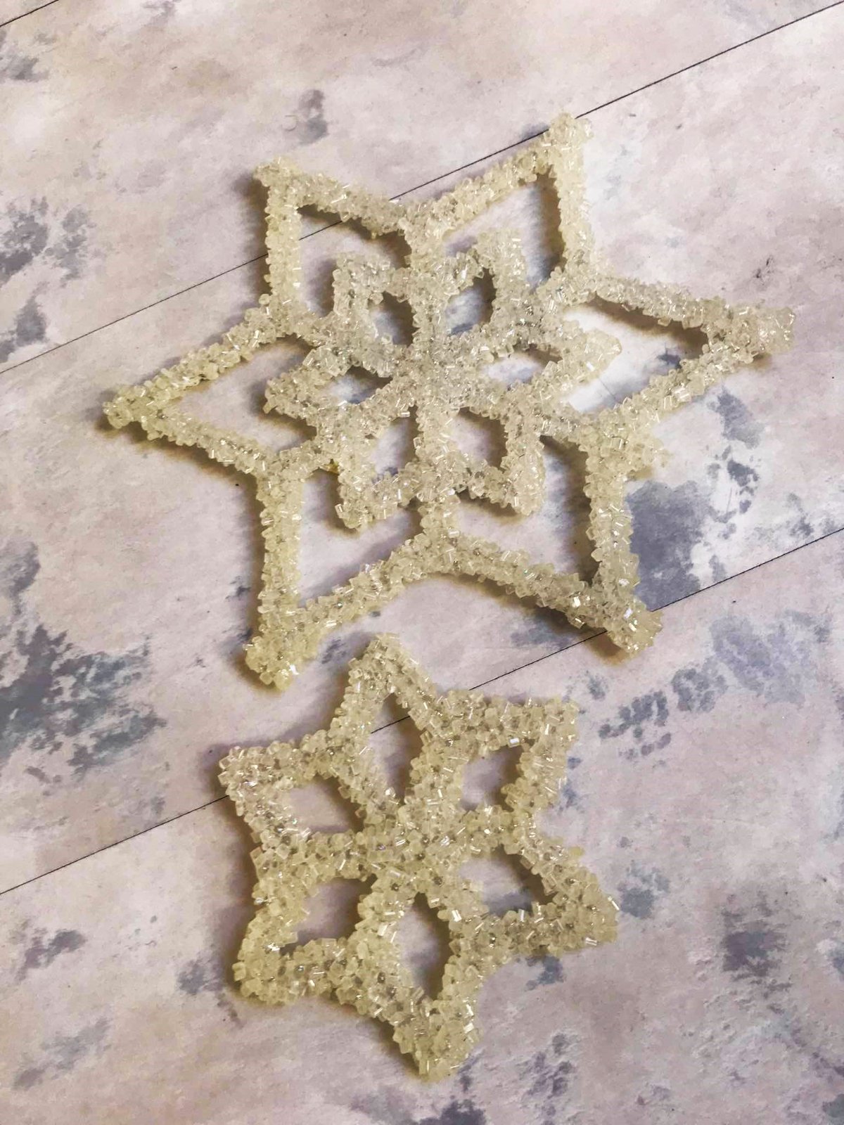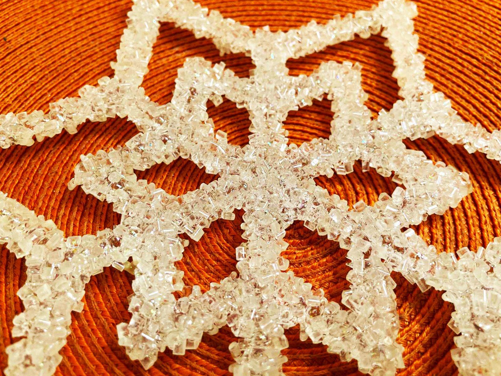 nádherná dekorácia vhodná na Vianoce - krehká,sklenená,vyzerá to,ako keby pocukrované kryštálmi,25 x 25 cm,13 x 13 cm,smotanovo biele priesvitné,top stav,min.použité,pekne to vyzerá aj ako zavesené na jemný silon,alebo na klinci,alebo opreté na polici ako stojatá dekorácia
