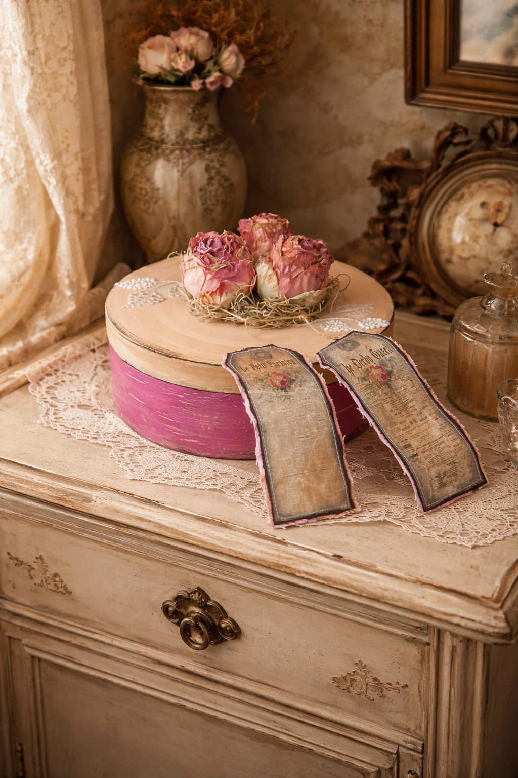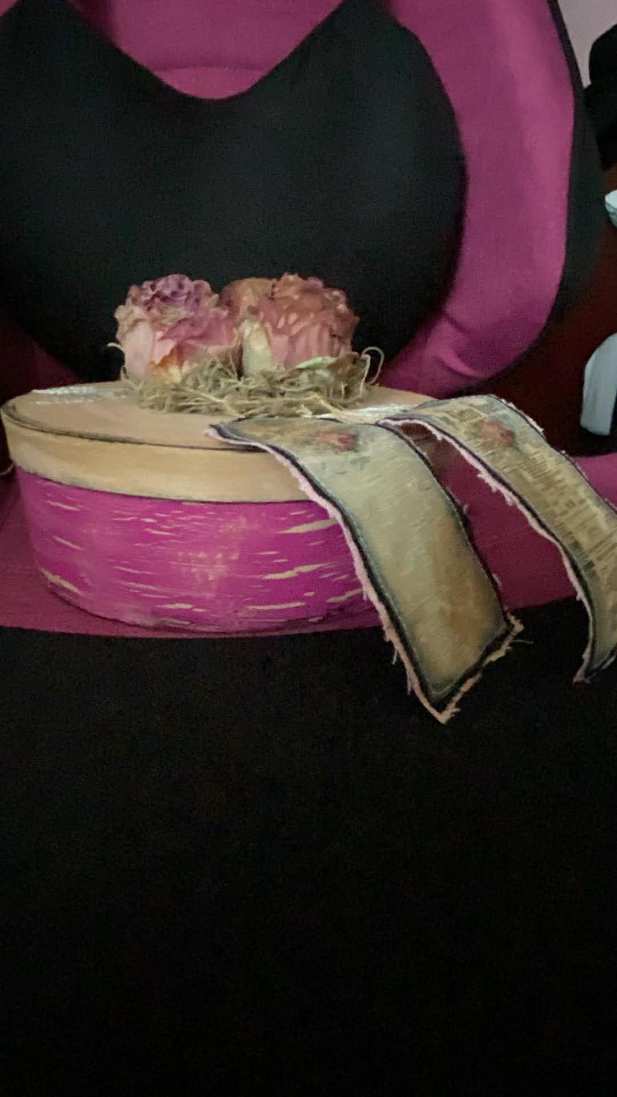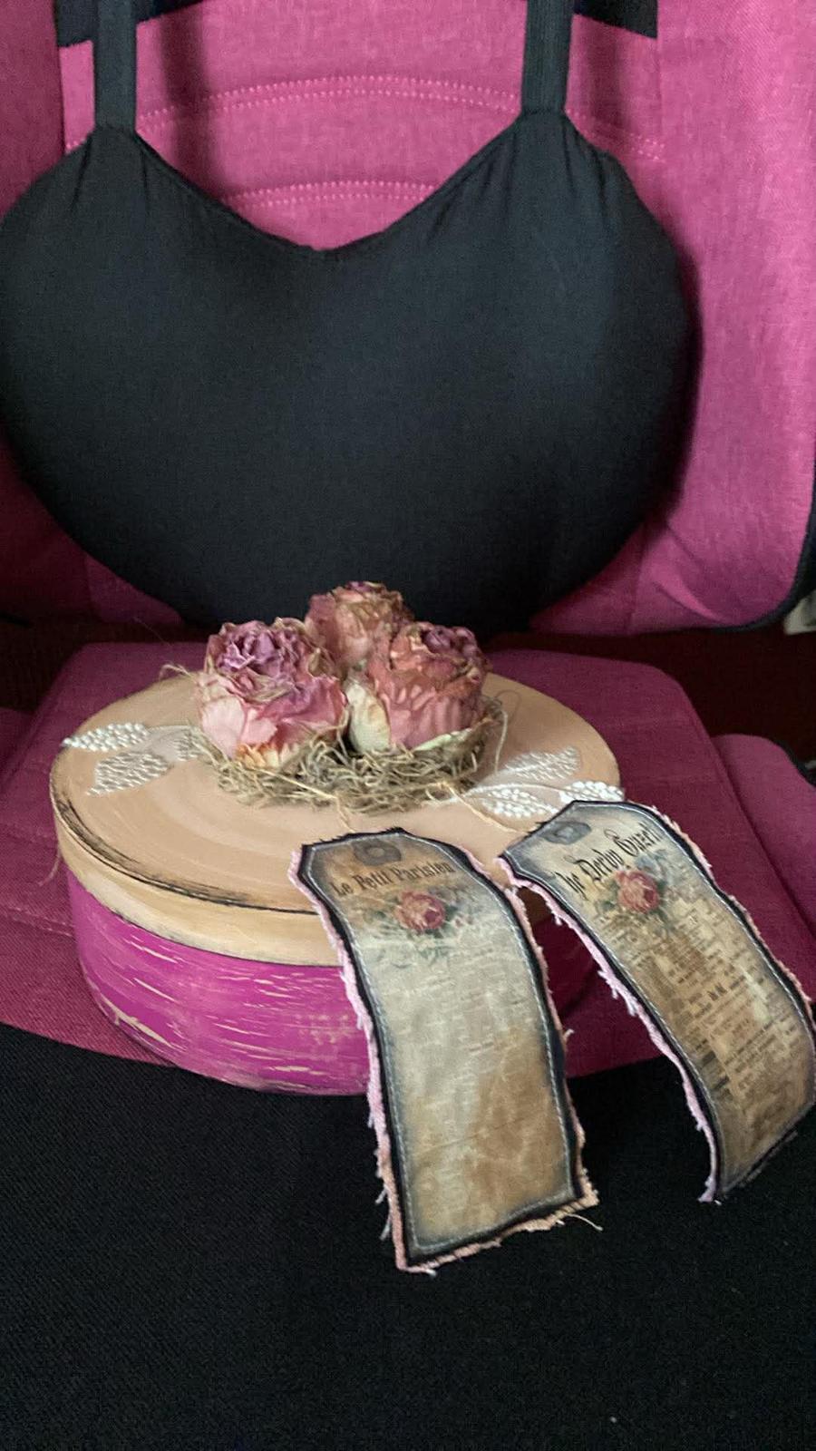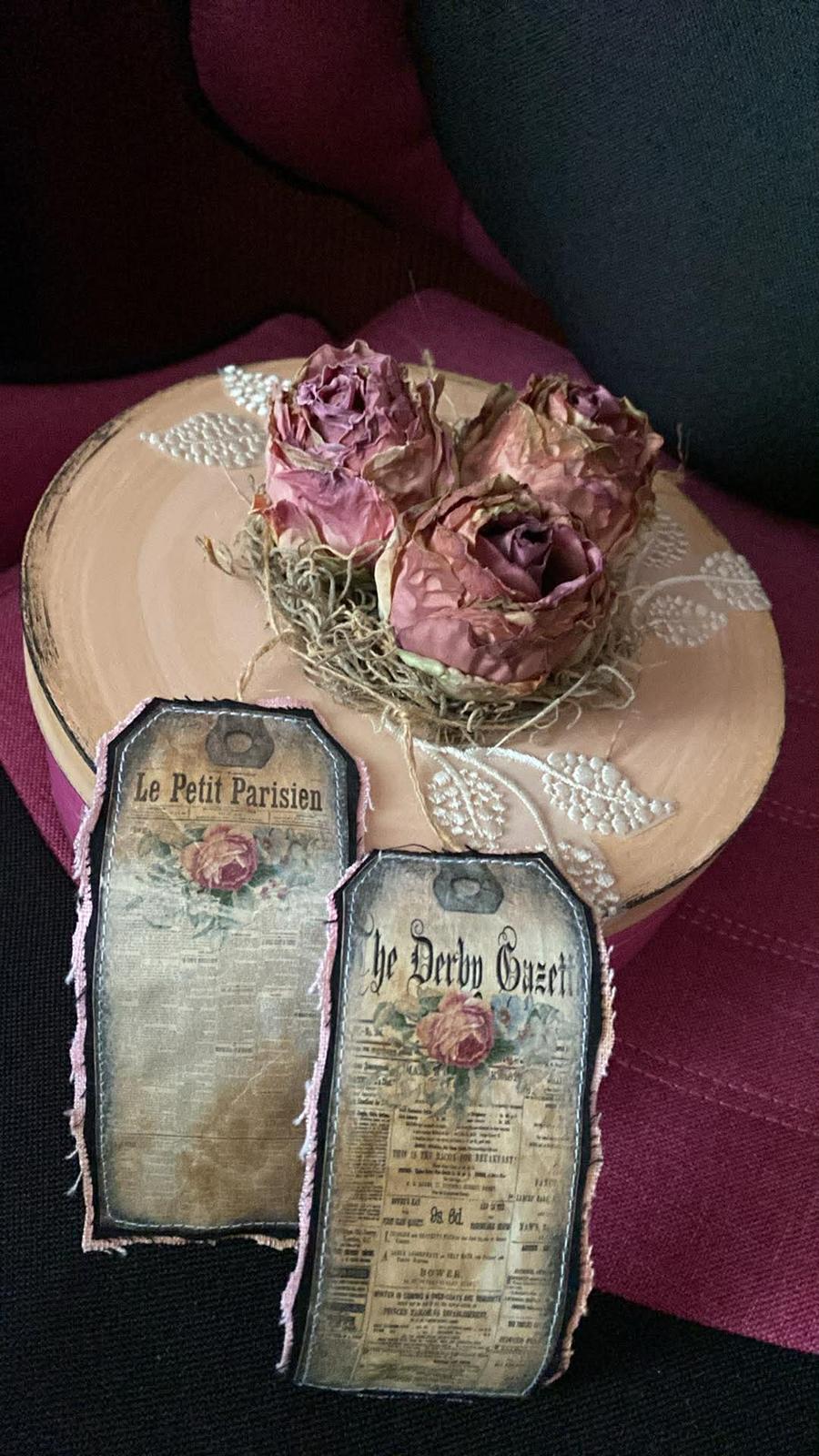 Predám túto nádhernú vintage krabičku s ružami a vintage etiketkami z lepenky, priemer 19,5 cm.