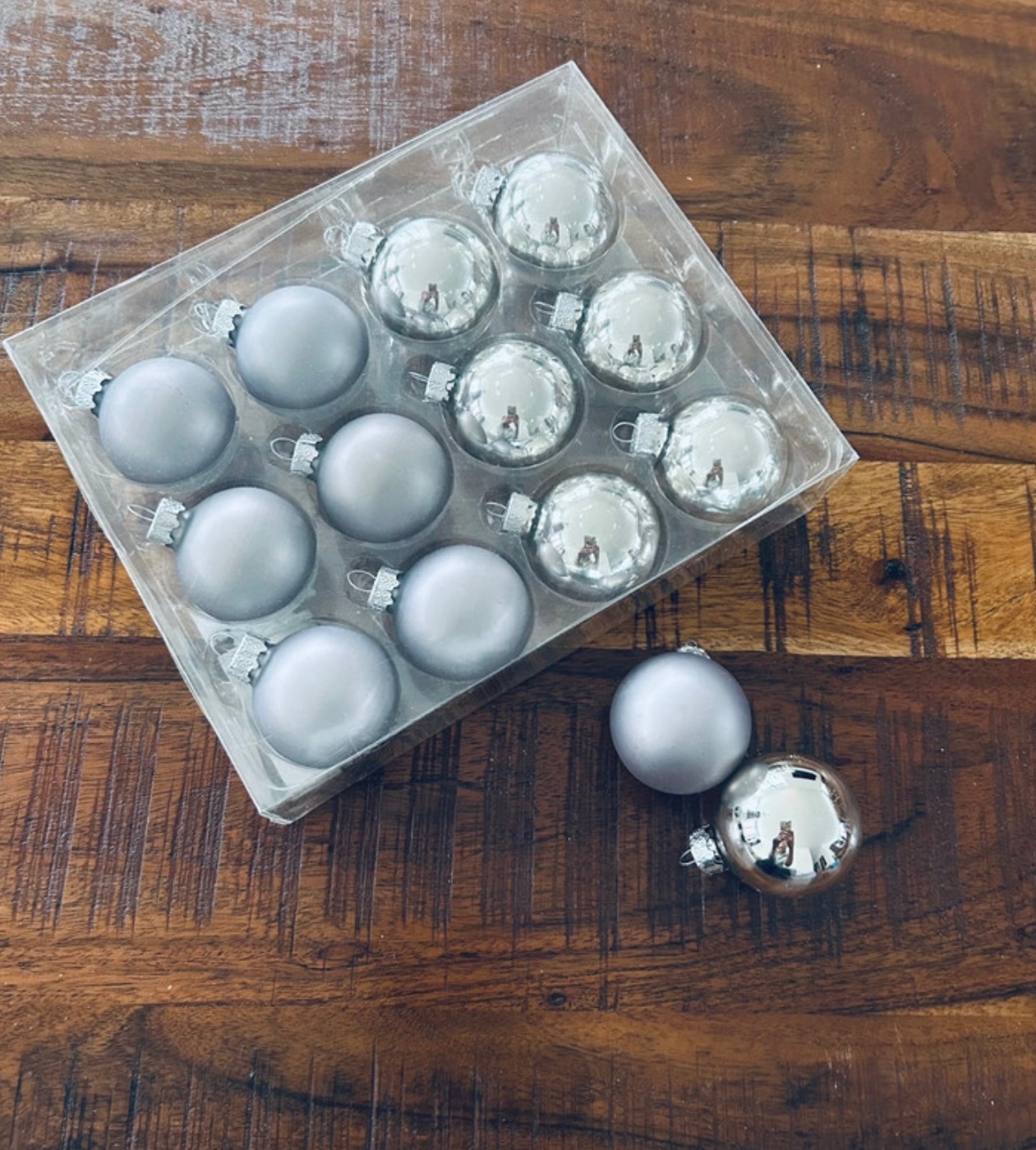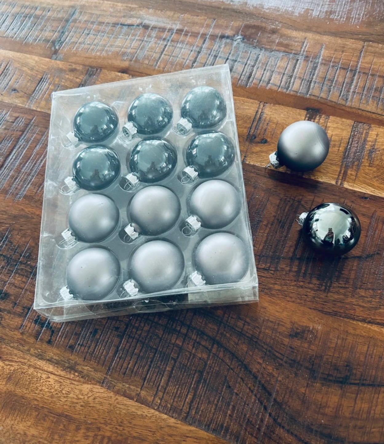 1-2. Fotka: Vianočné sklenené gule 12ks, priemer gule 4cm. Sada vo farbe strieborná a matné šedé gule alebo matné šedé a lesklé tmavozelené gule