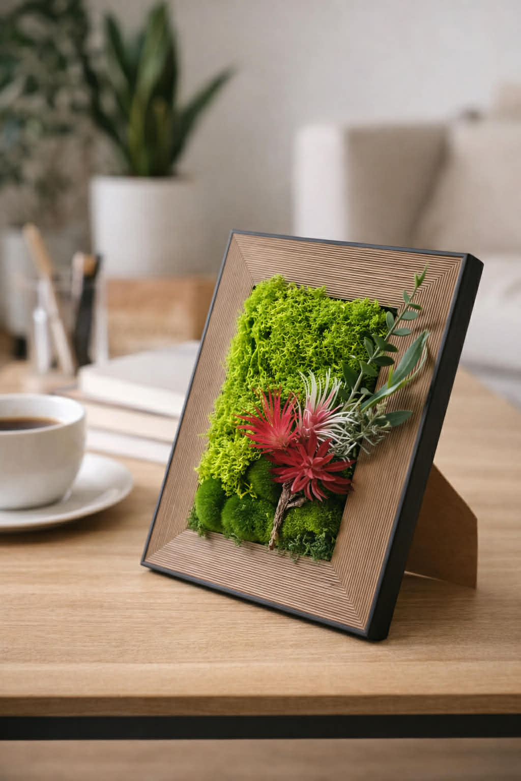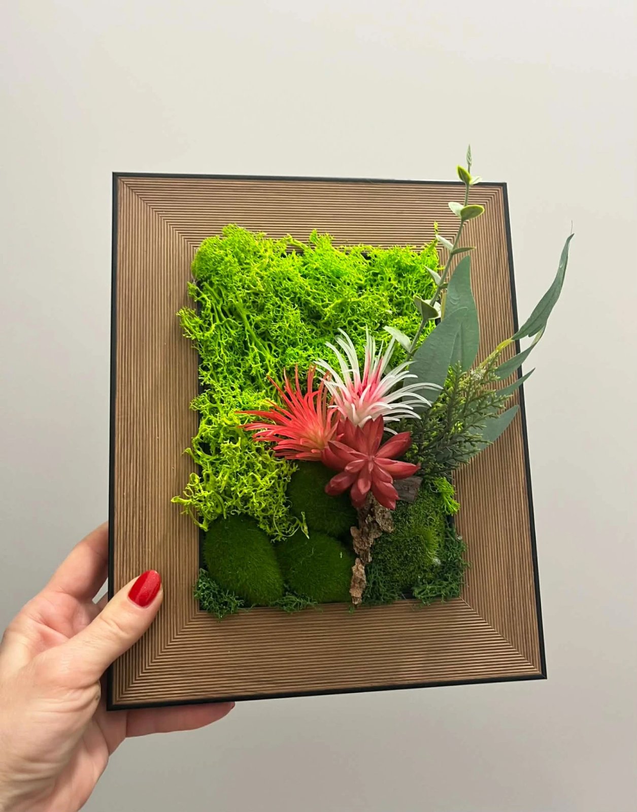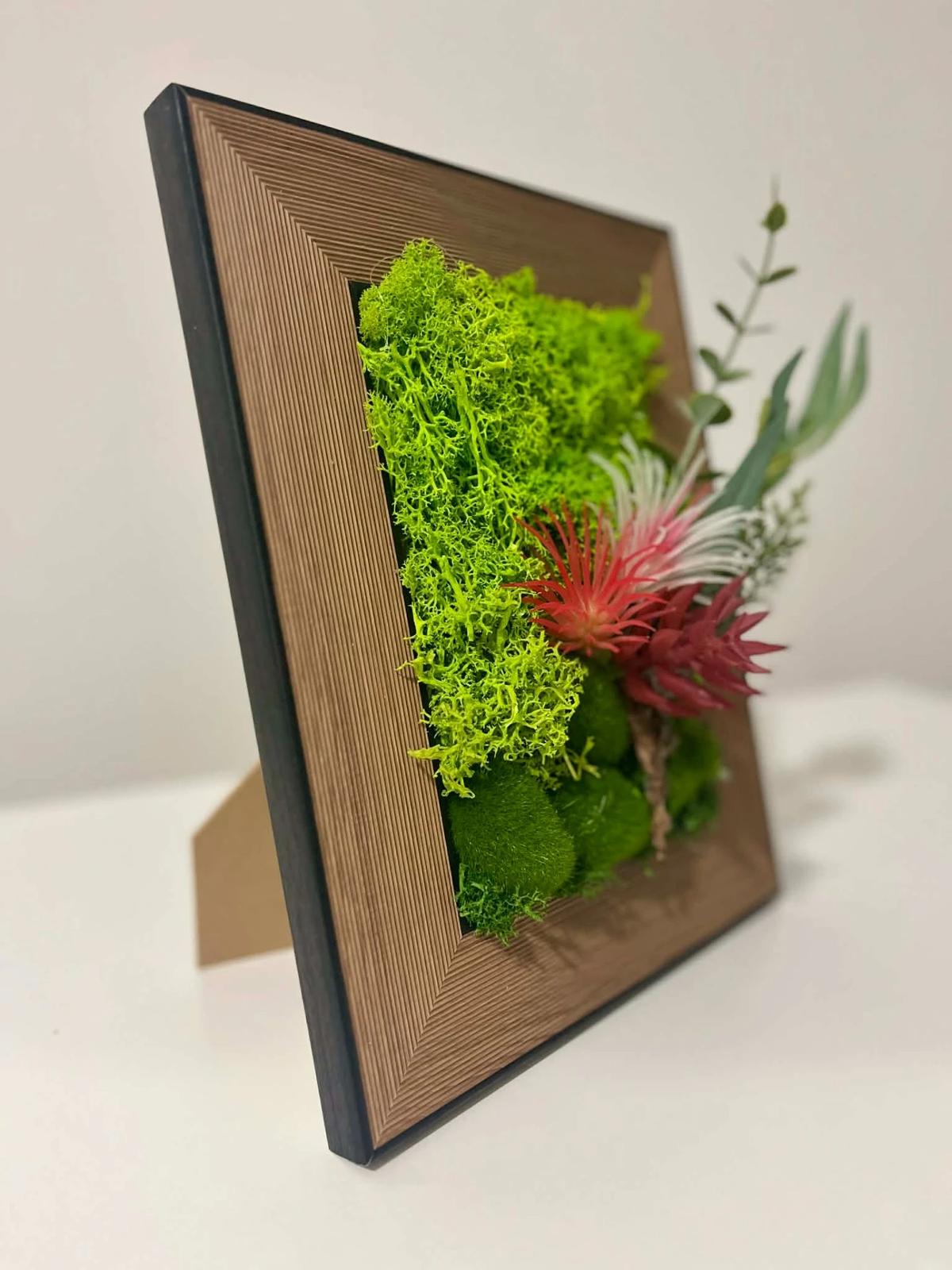 Machový obraz "Lesný rámček" o rozmere 25 × 20 cm je ručne vyrábaná interiérová dekorácia, ktorá prepája moderný dizajn s prírodnou eleganciou. Použitý stabilizovaný mach sa vyznačuje dlhou životnosťou, stálou farbou a príjemnou textúrou, vďaka ktorej pôsobí obraz sviežo a prirodzene.
