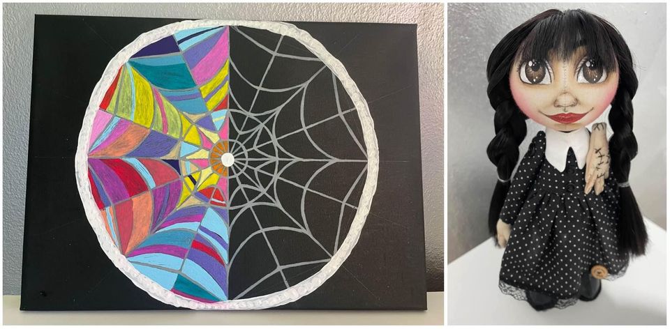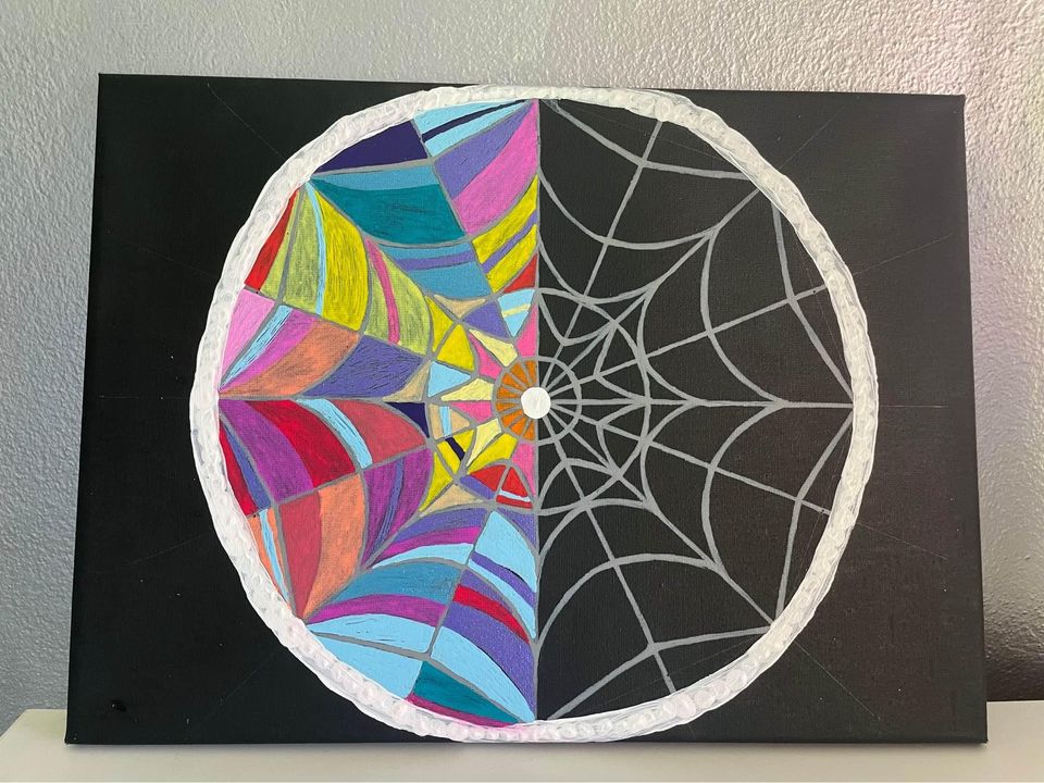 Ručne maľovaná mandala s motívom zo seriálu Wednesday. Akryl na plátne (2023). Rozmer: 40cmx30cm.