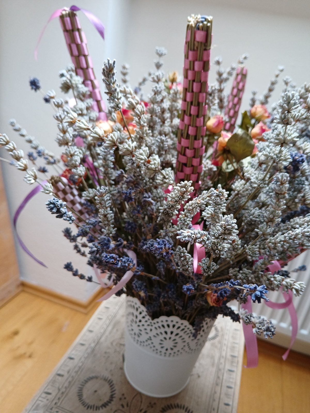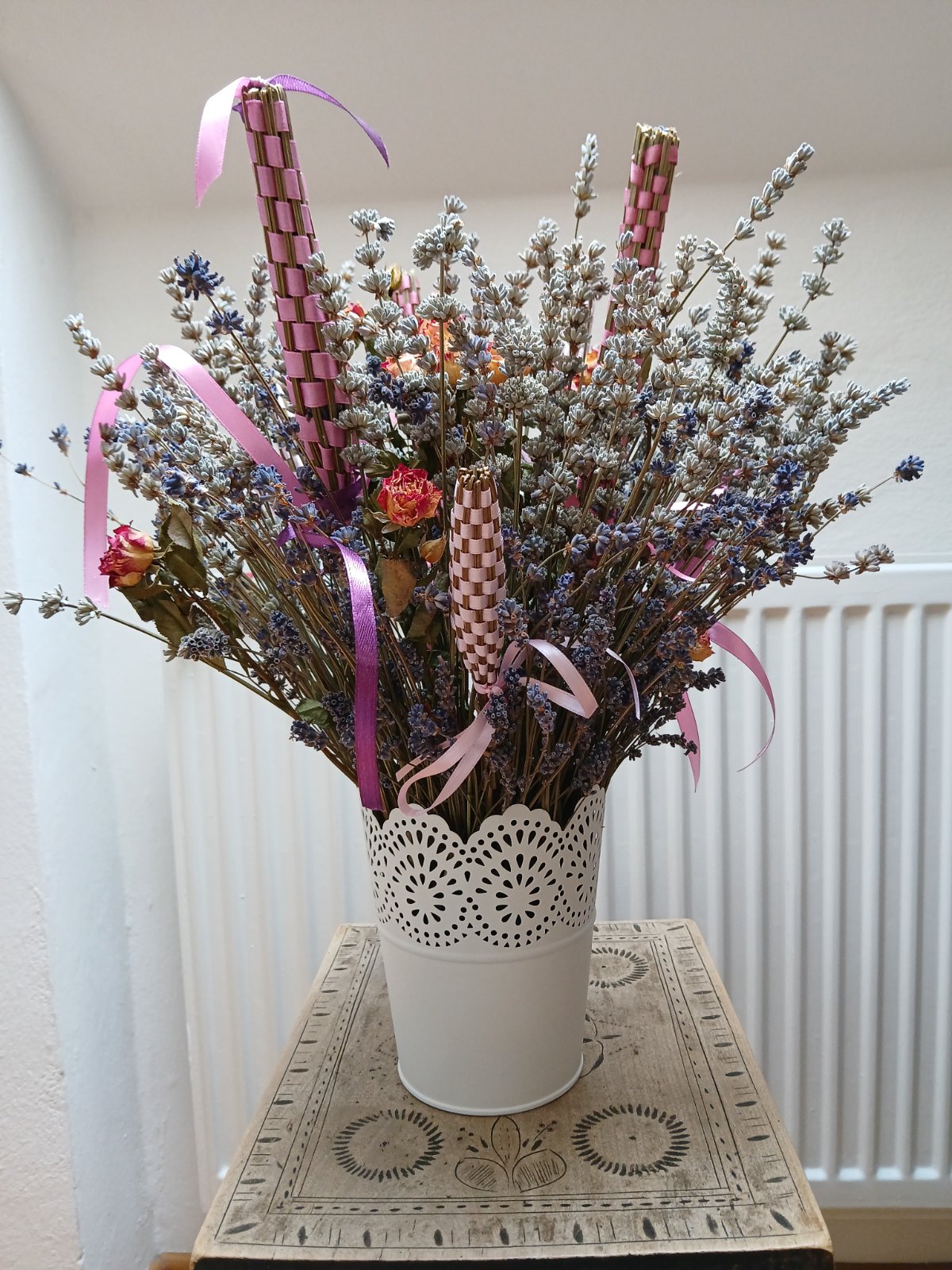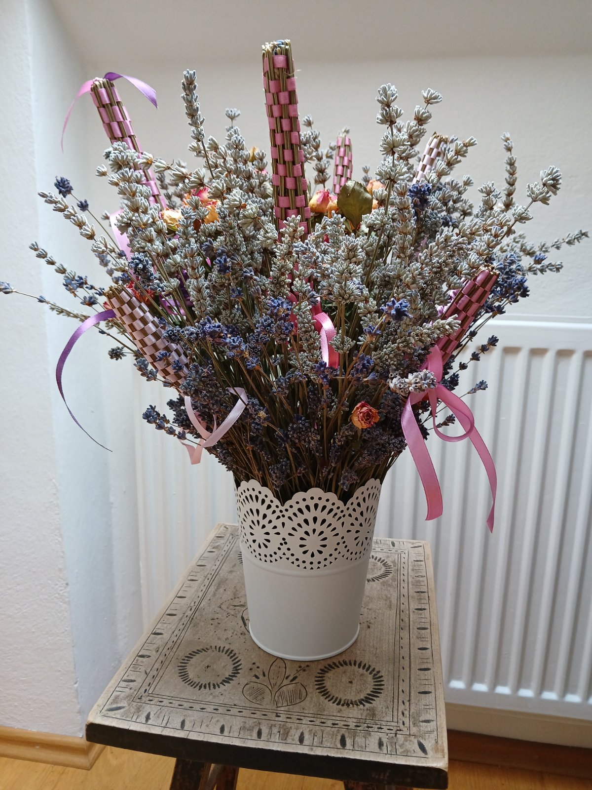 Aranžmán zo sušených kvetov a bylín, ktorý vnesie do každého priestoru harmonickú, upokojujúcu atmosféru cez farby, tvary a vône letnej prírody. Jednoduché sušené rastliny sú naaranžované v bielej plechovej nádobe s "čipkou", doplnené levanduľovými paličkami v odtieňoch ružovej.