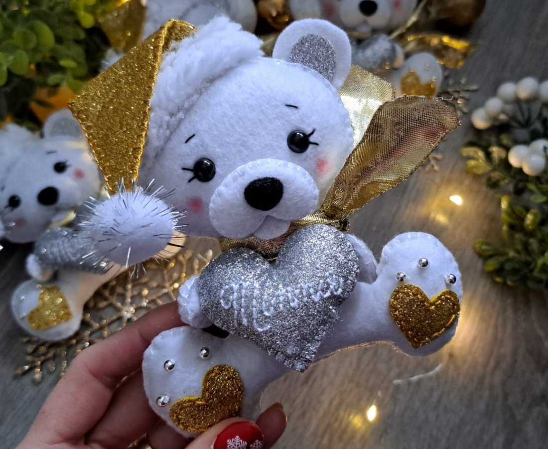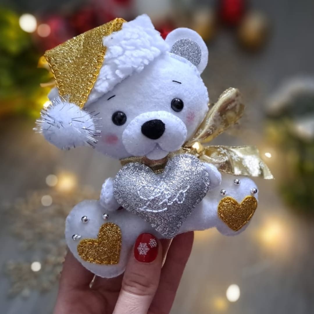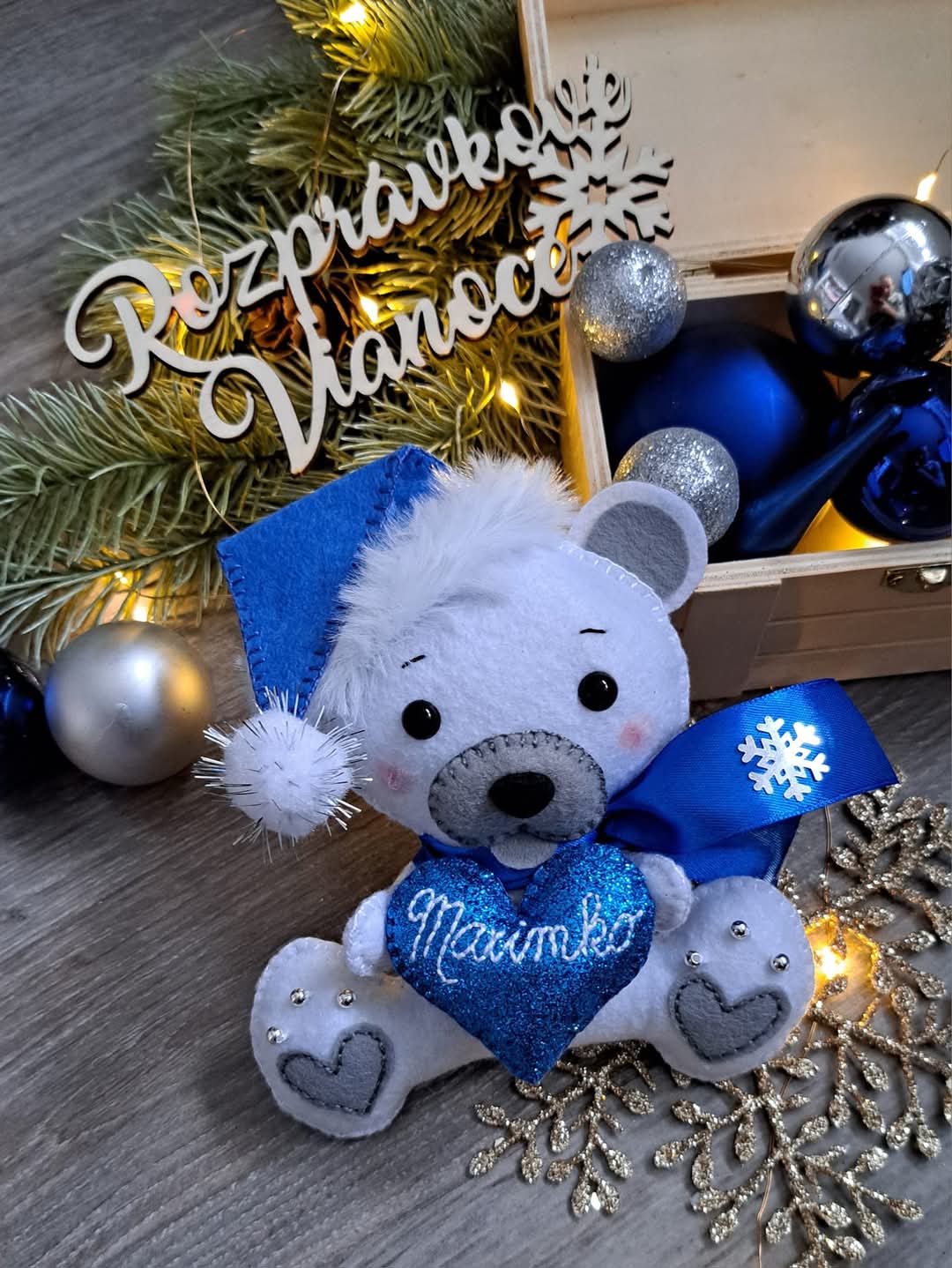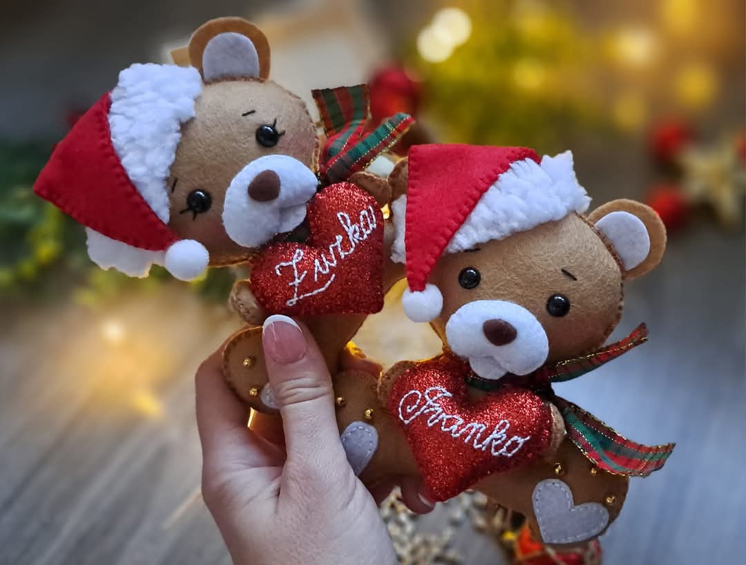 Rucne sity macko so srdieckom s menom, da sa zavesit na stromcek, rovnako ako sobik. Macko ma s ciapkou 18cm. Cena 14e/ks