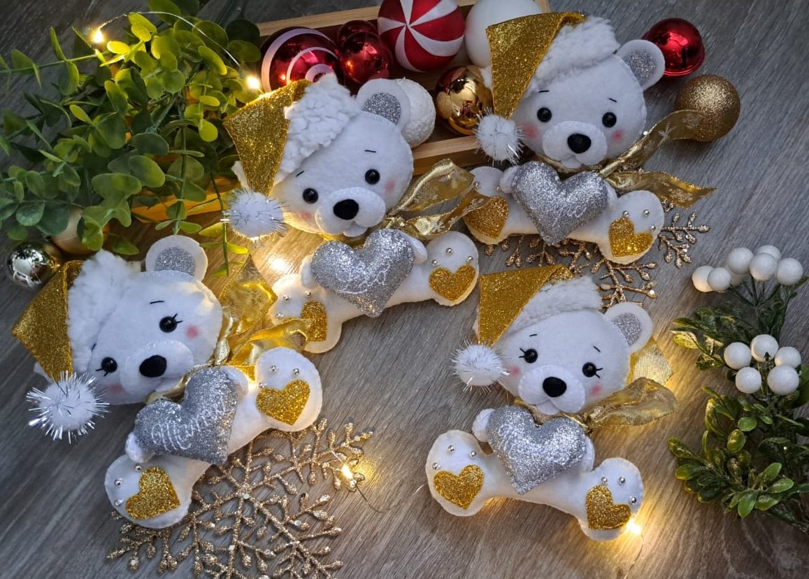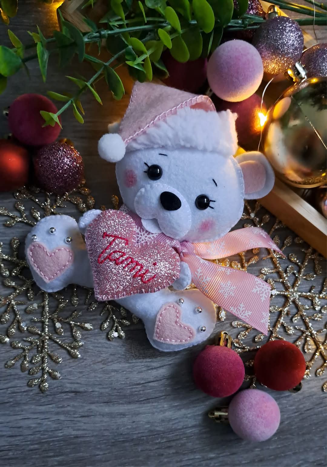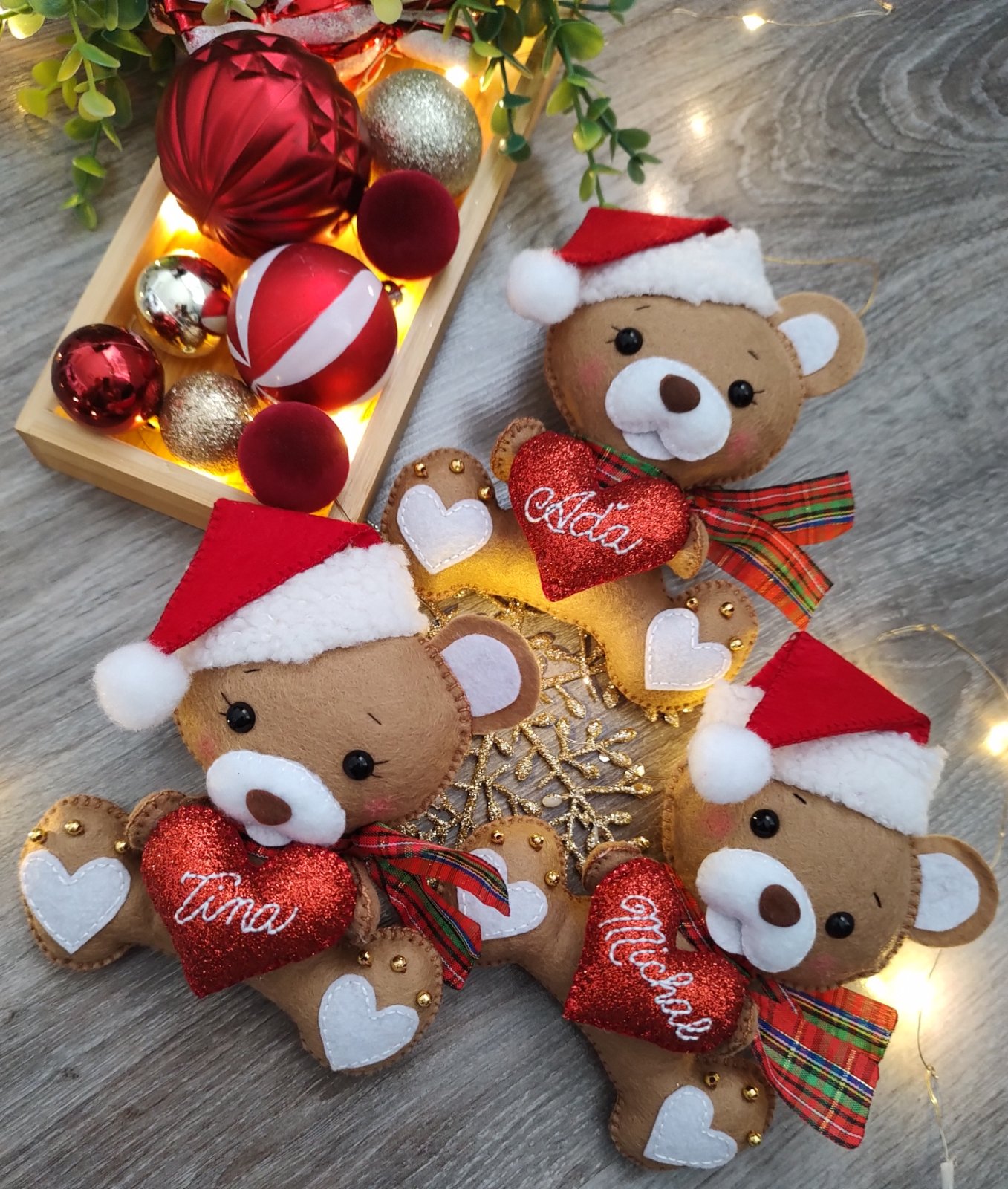 Rucne sity macko so srdieckom s menom, da sa zavesit na stromcek, rovnako ako sobik. Macko ma s ciapkou 18cm. Cena 14e/ks
