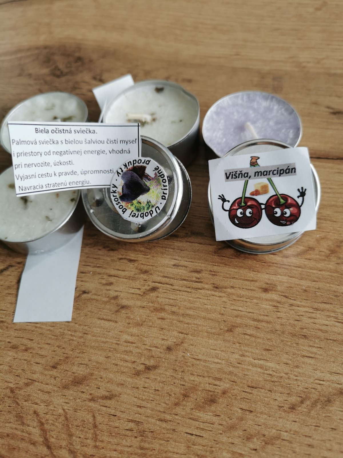 Čierna sviečka cena 3,50€, biela očistná rituálna so soľou, bez soli a zelená posilňujúca sviečka cena 1,50€, čajové sviečky 6 kusov za 1,80€, gélové sviečky v skle kus 3€. Posielam cez packetu. V prípade záujmu mám k dispozícii aj mydlá a liečivé krémy.
