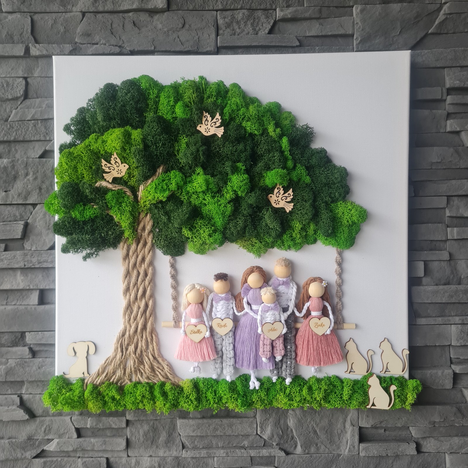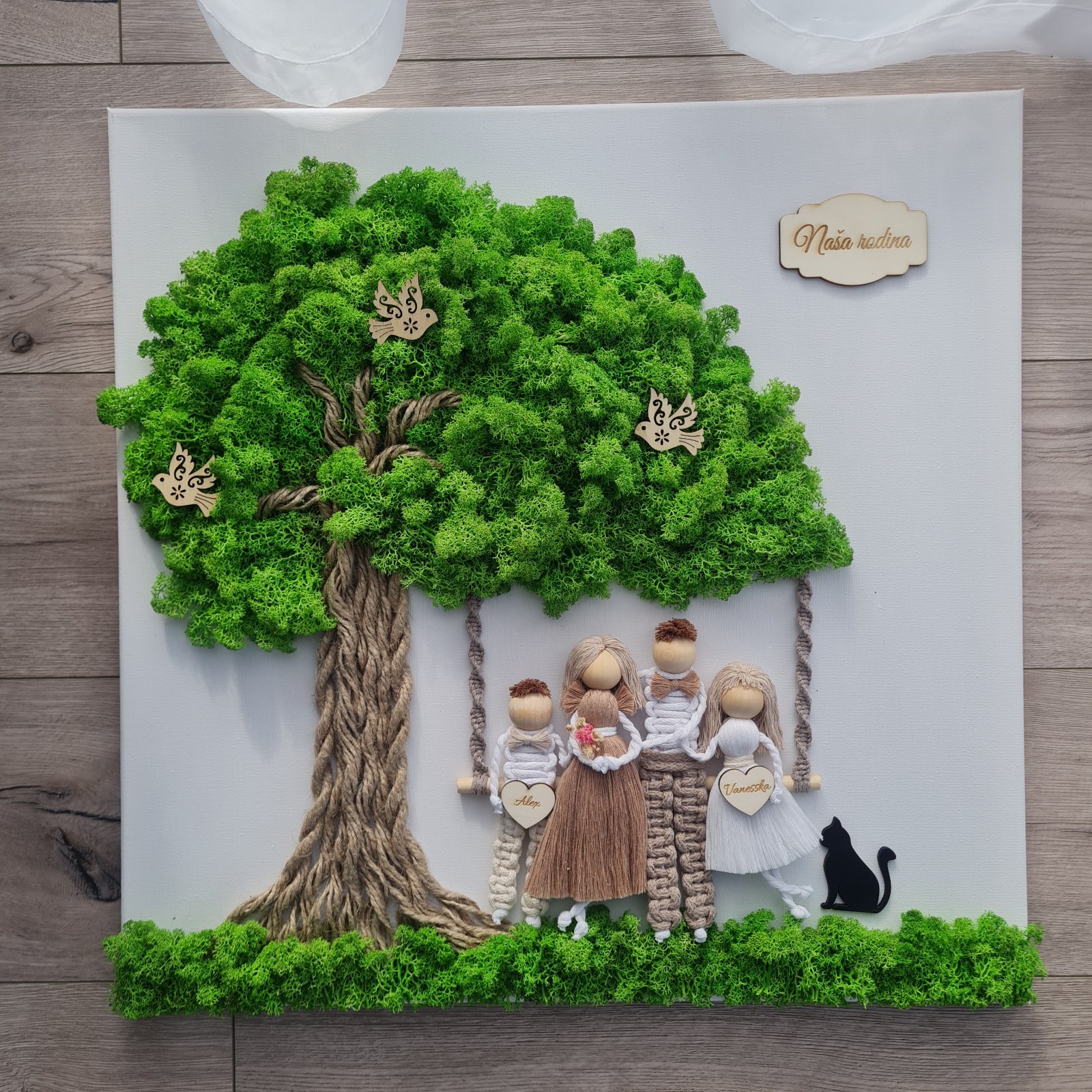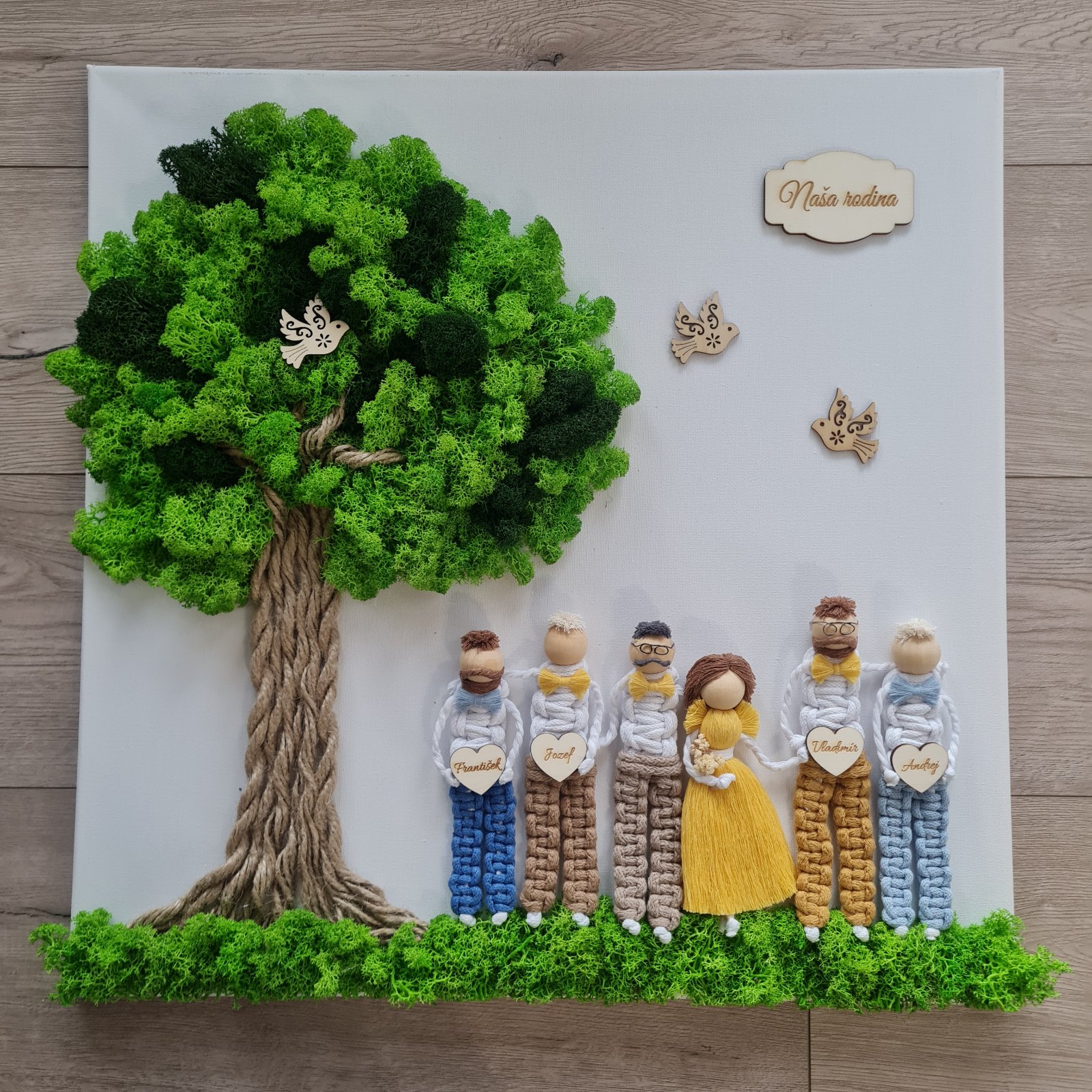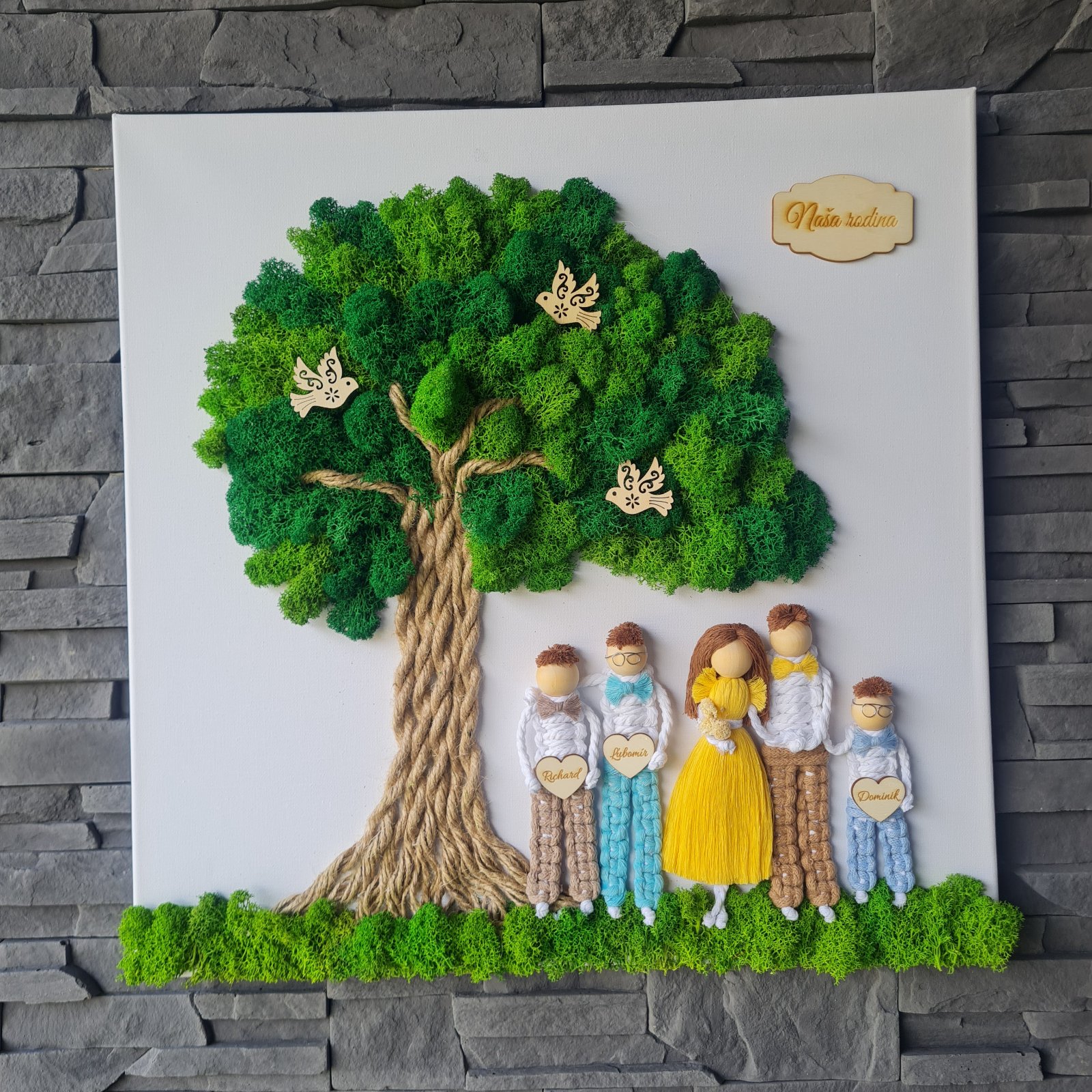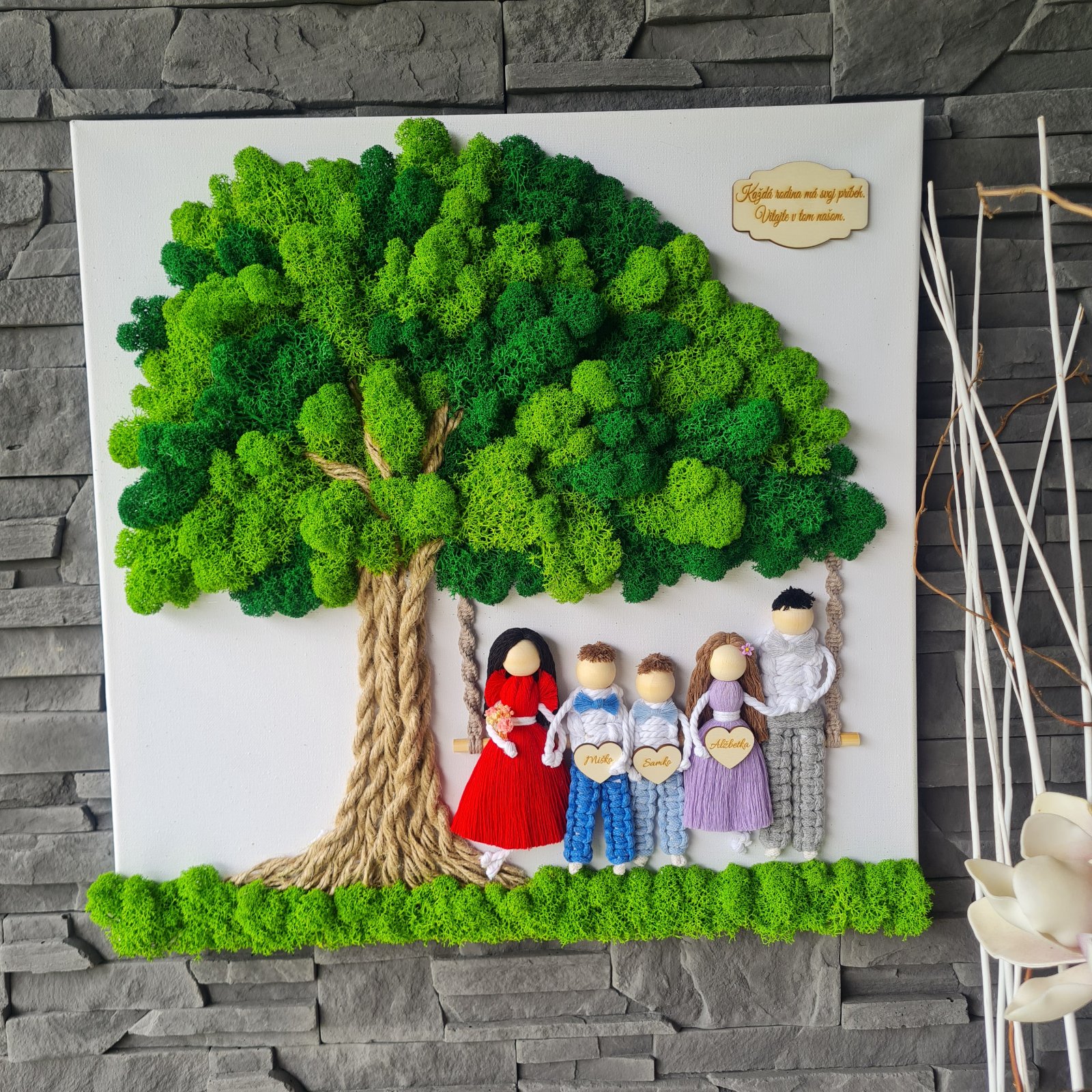 Kombinácia obrazu zo stabilizovaného machu - strom života a macrame rodinky podľa vašich fotiek.