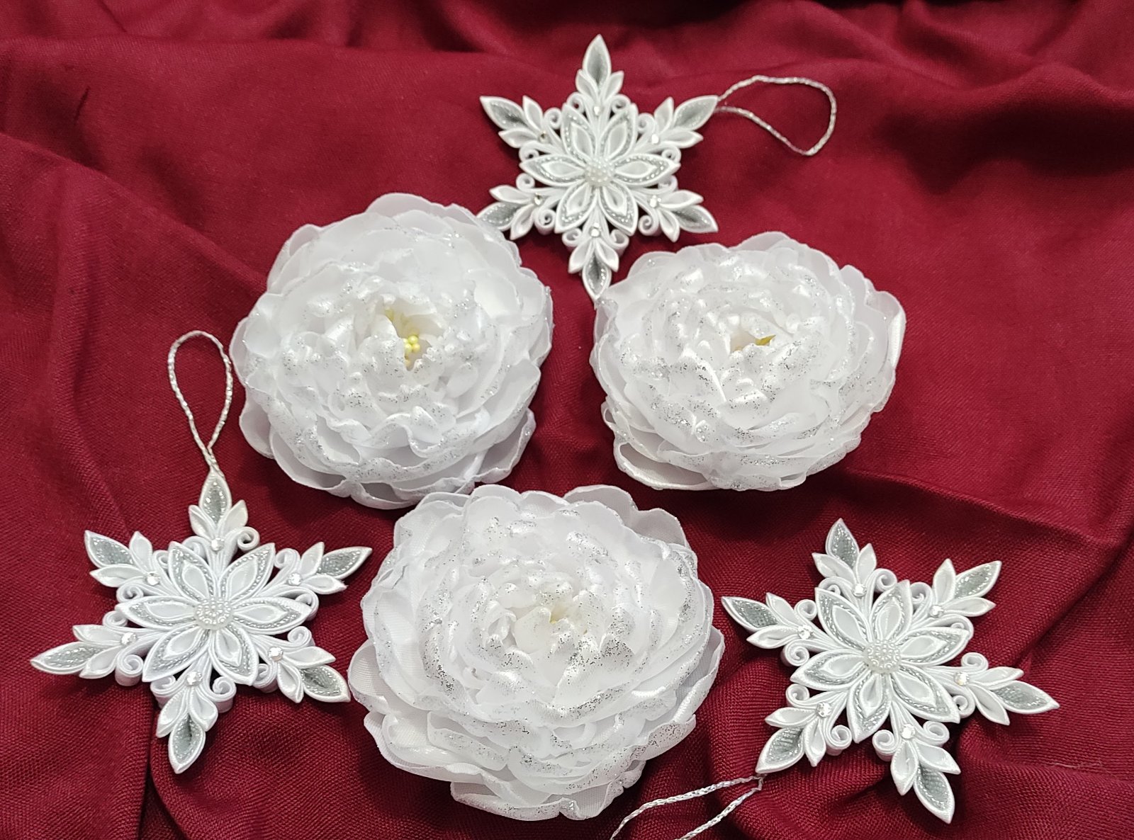 Saténová pivonka s bohatými lupienkami, jemne zasnežená umelým snehom, prinesie do vašich sviatočných dekorácií pravú zimnú atmosféru.