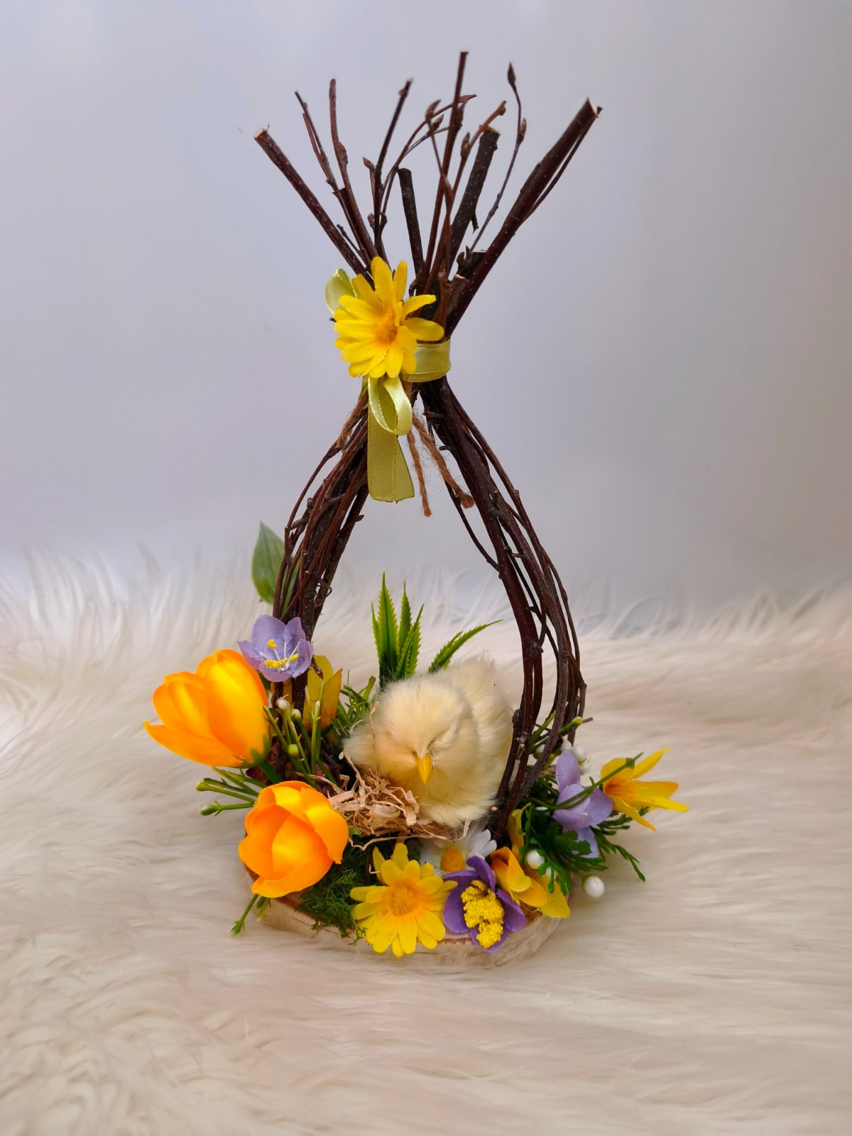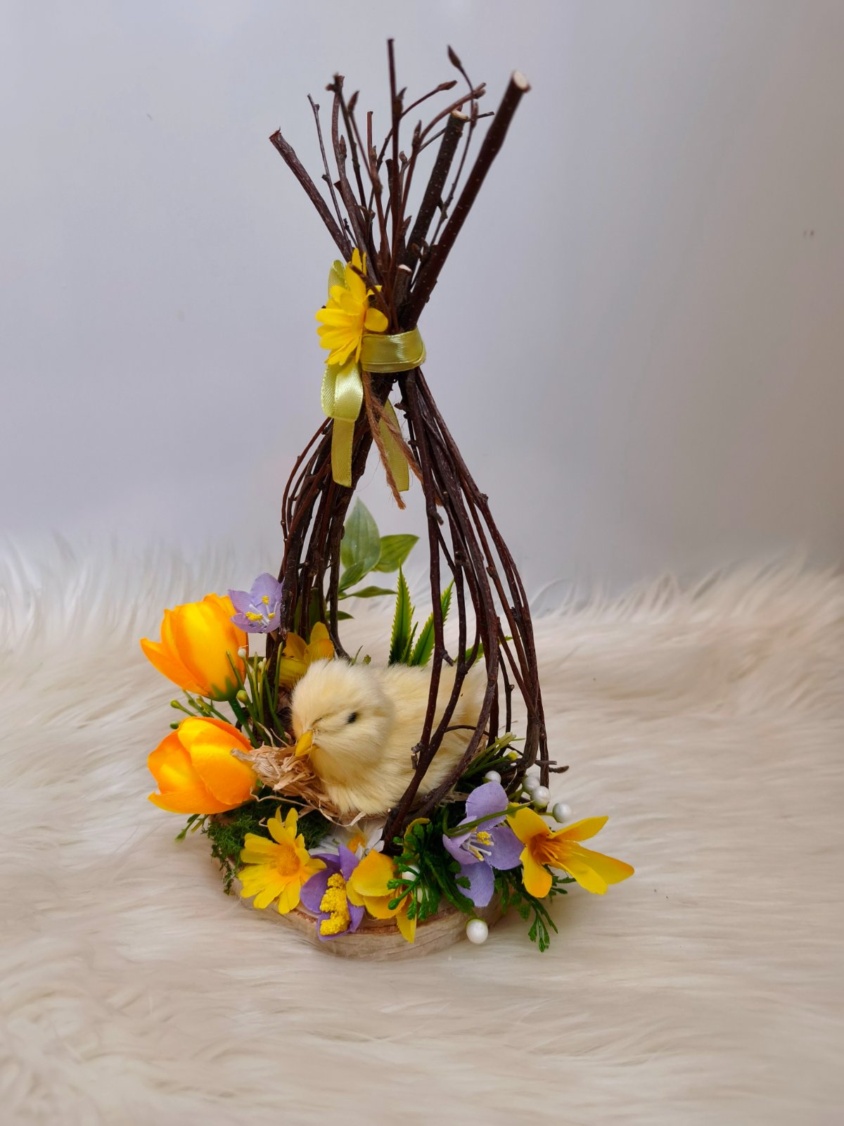 Dekorácia s kuriatkom, spojenie prírodného a umelého materiálu.