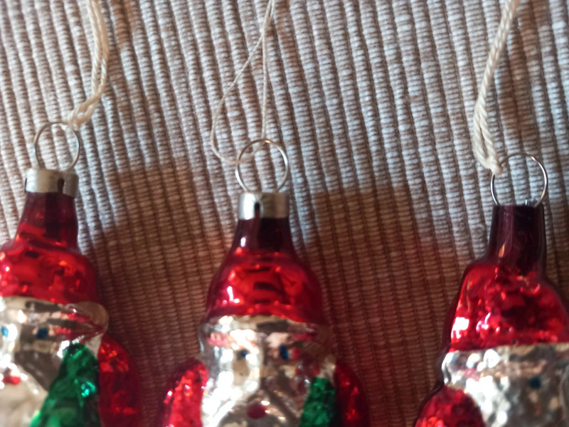Vypratané z ozdôb po rodičoch, nájdené len tieto 3 kusy v pomerne krásnom stave tak zrejme nie často používané, alebo len mamou dobre opatrované. Poškodenia nevidieť, len na 1 kuse chýba vrchná korunka. Závesné očko ide rovno z ozdoby. Všetky 3 kusy sú však plne funkčné a zo skla. Nechávam ich v plne nálezovom stave aj so starými šnúrkami, ako to ostalo po rodičoch. Rozmer výška 7 cm x šírka 3,5 cm x hrúbka 2,5 cm
