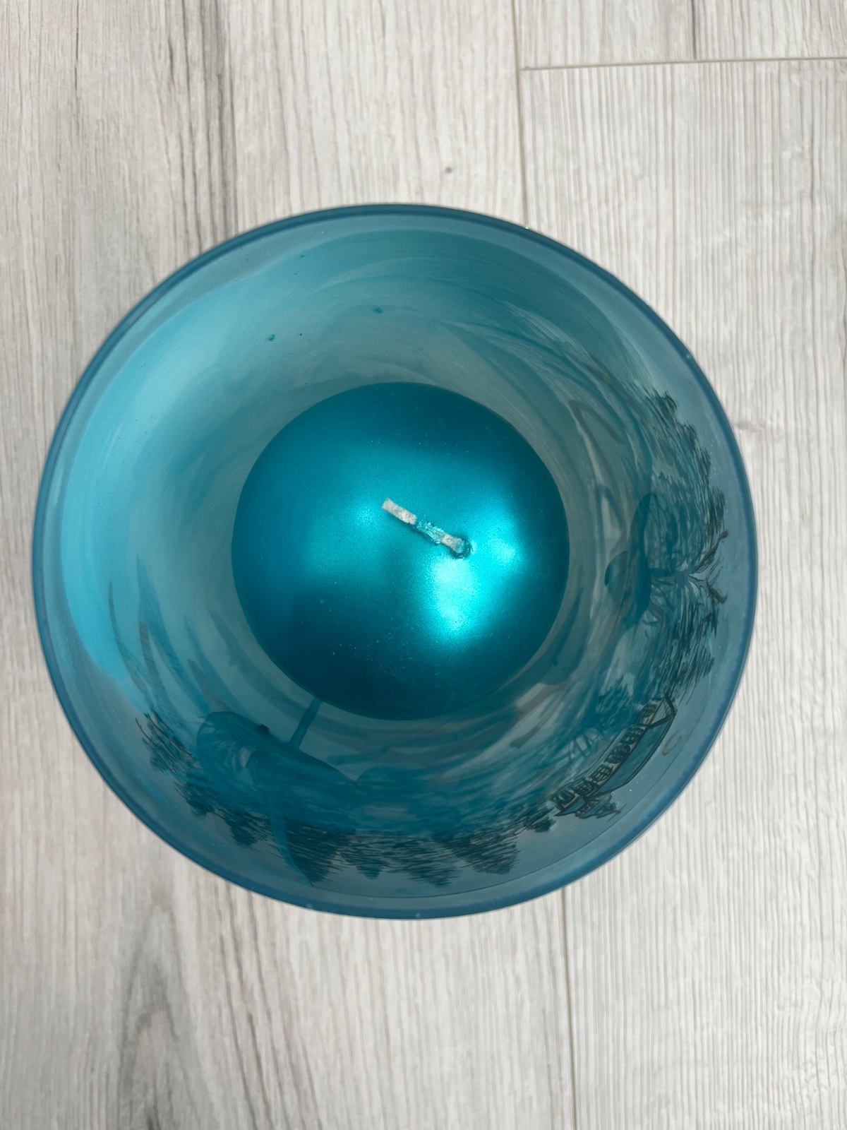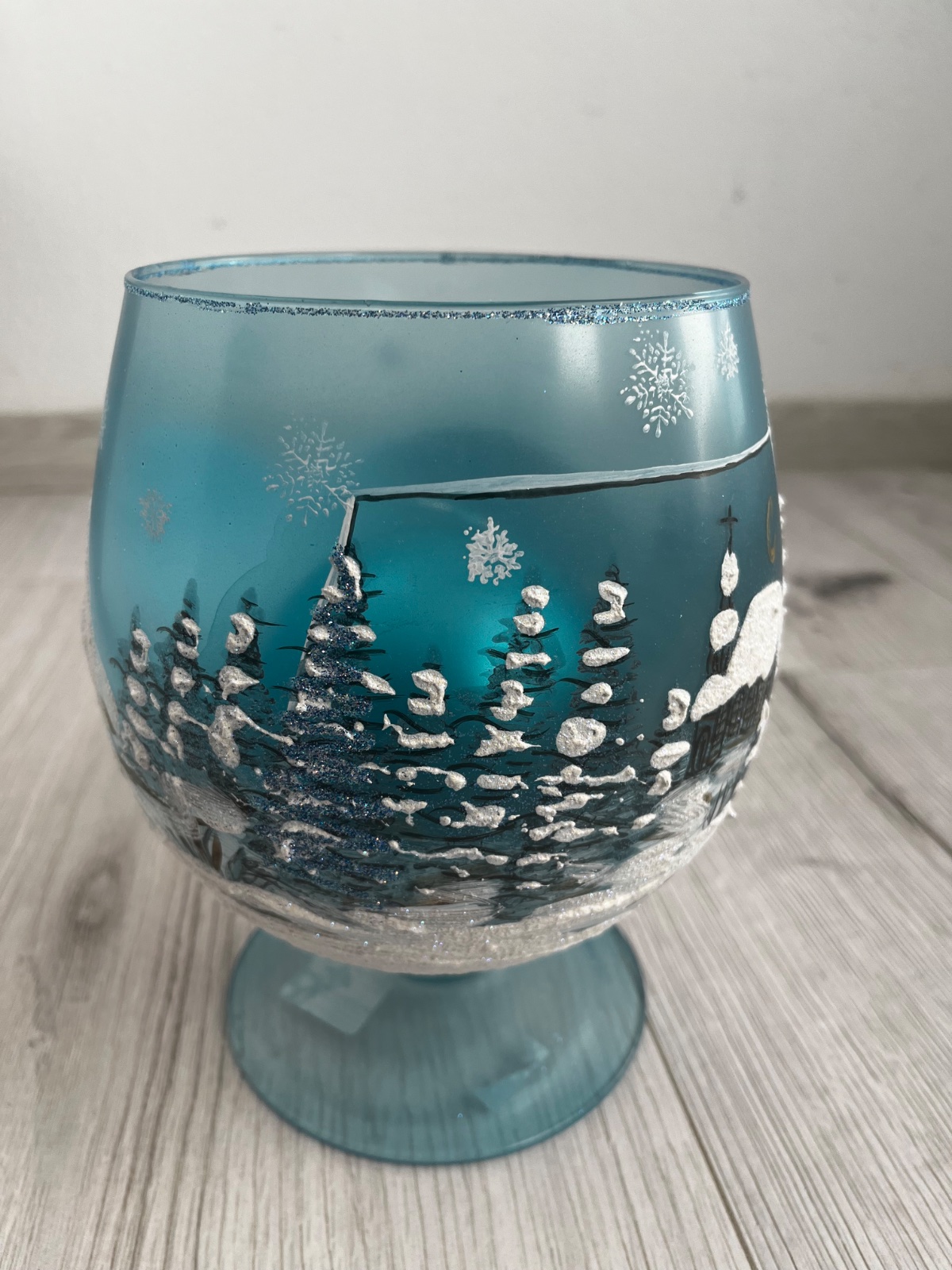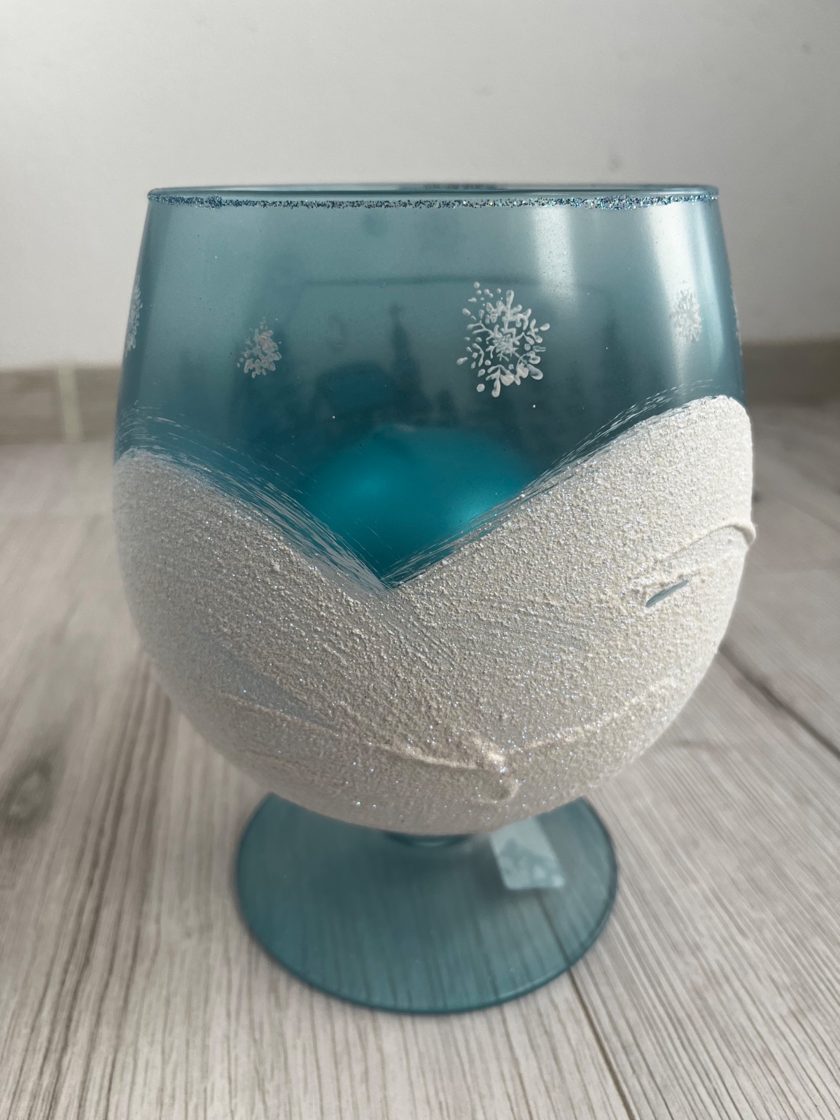 Predám nádhernú vianočnú dekoráciu z malovaneho skla v tvare pohára tyrkysovej farby. Vo vnútri sa nachádza sviečka v tvare gule. Výška: 20 cm, priemer: cca 15 cm