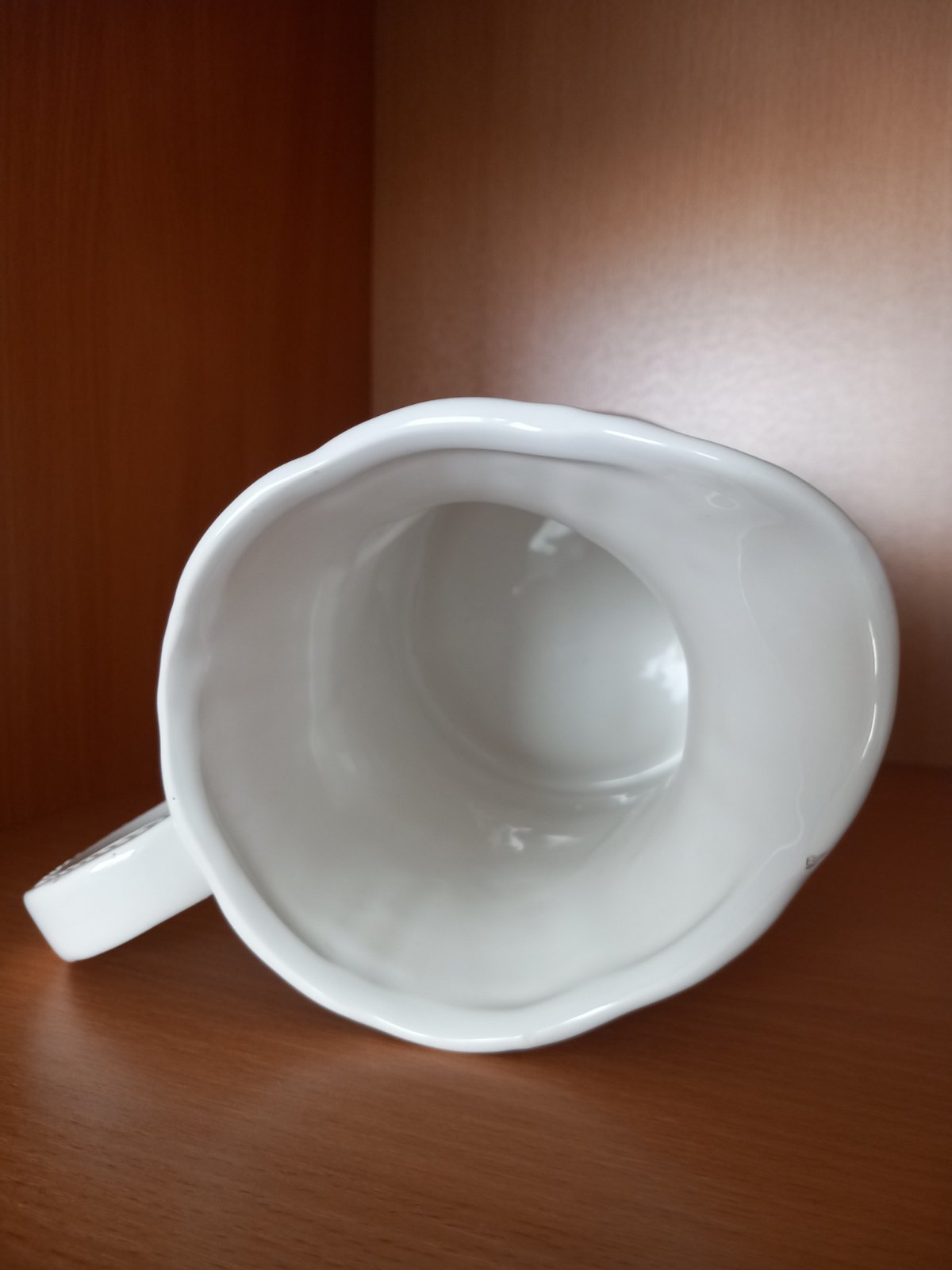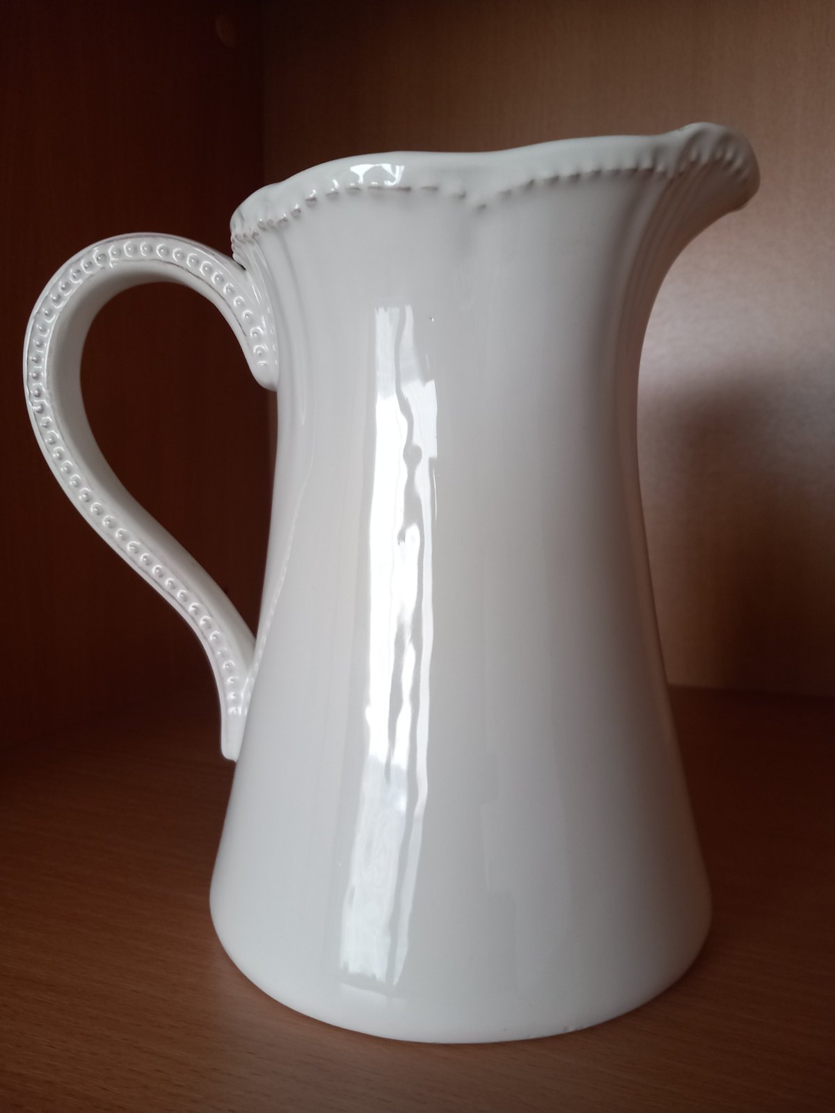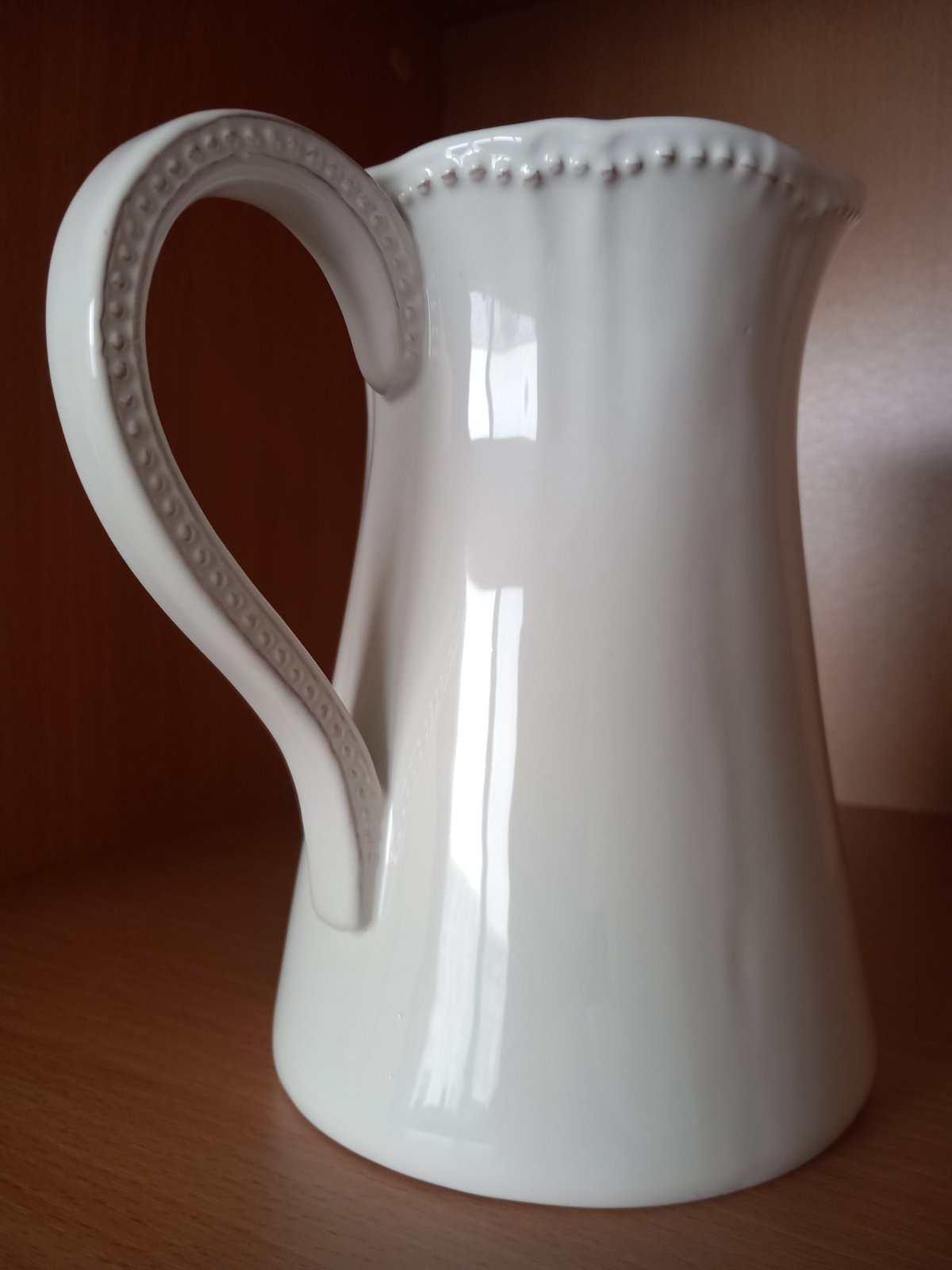 Starší a váhovo ťažší džbán s motívom srdca, keramika/kamenina s lesklou úpravou. Farba biela/jemne do krémovej. Rozmer 19x18,5 cm