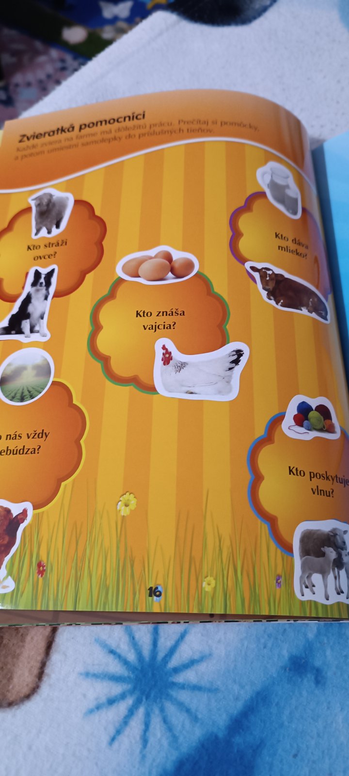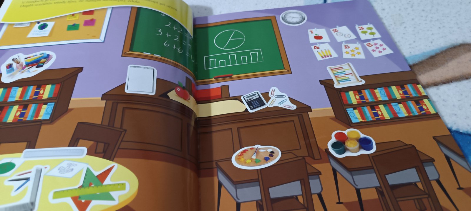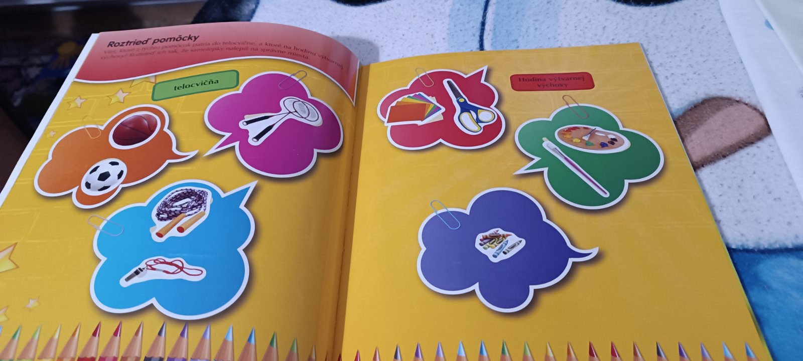 Nálepky nalepené, určené na učenie slov pomocou obrázkov.