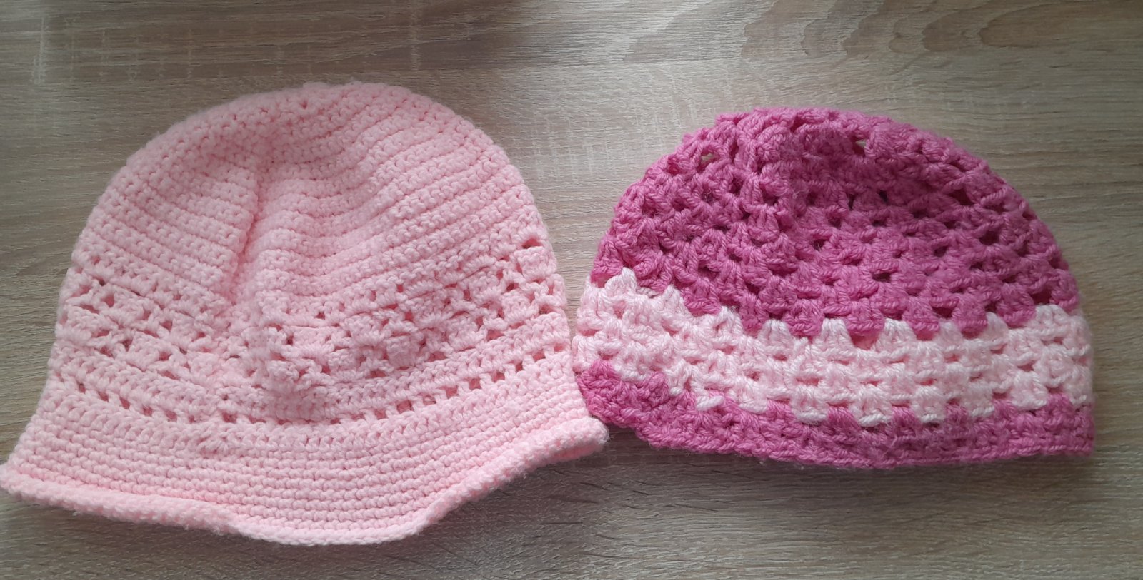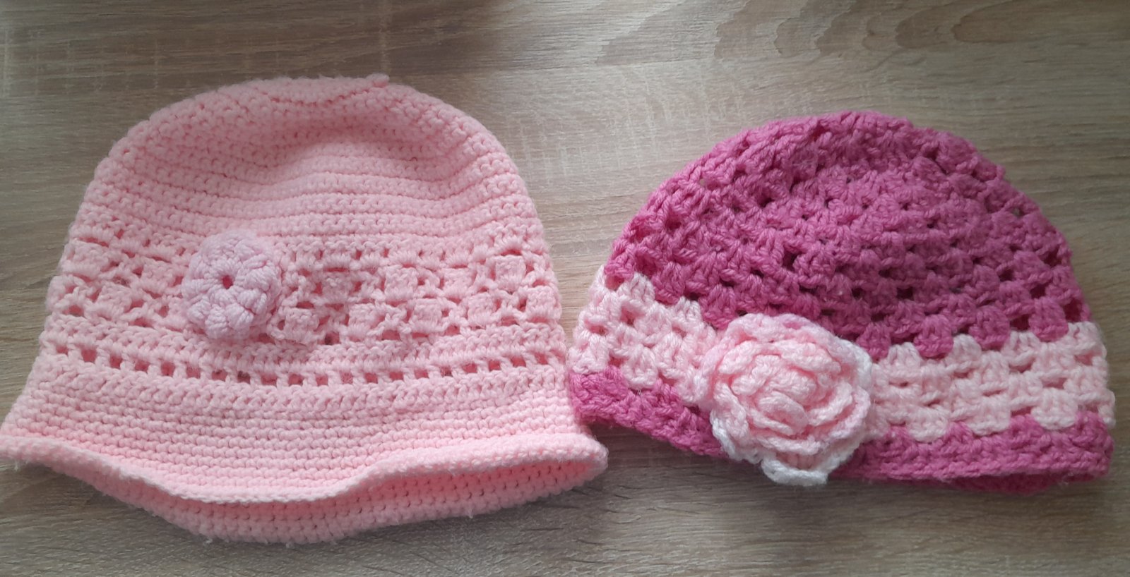 Háčkované čiapočky pre dievčatká vlastnej výroby, rôzne veľkosti a vzory. Niektoré čiapočky sú háčkované z priadze - vhodné na leto, niektoré z vlny.