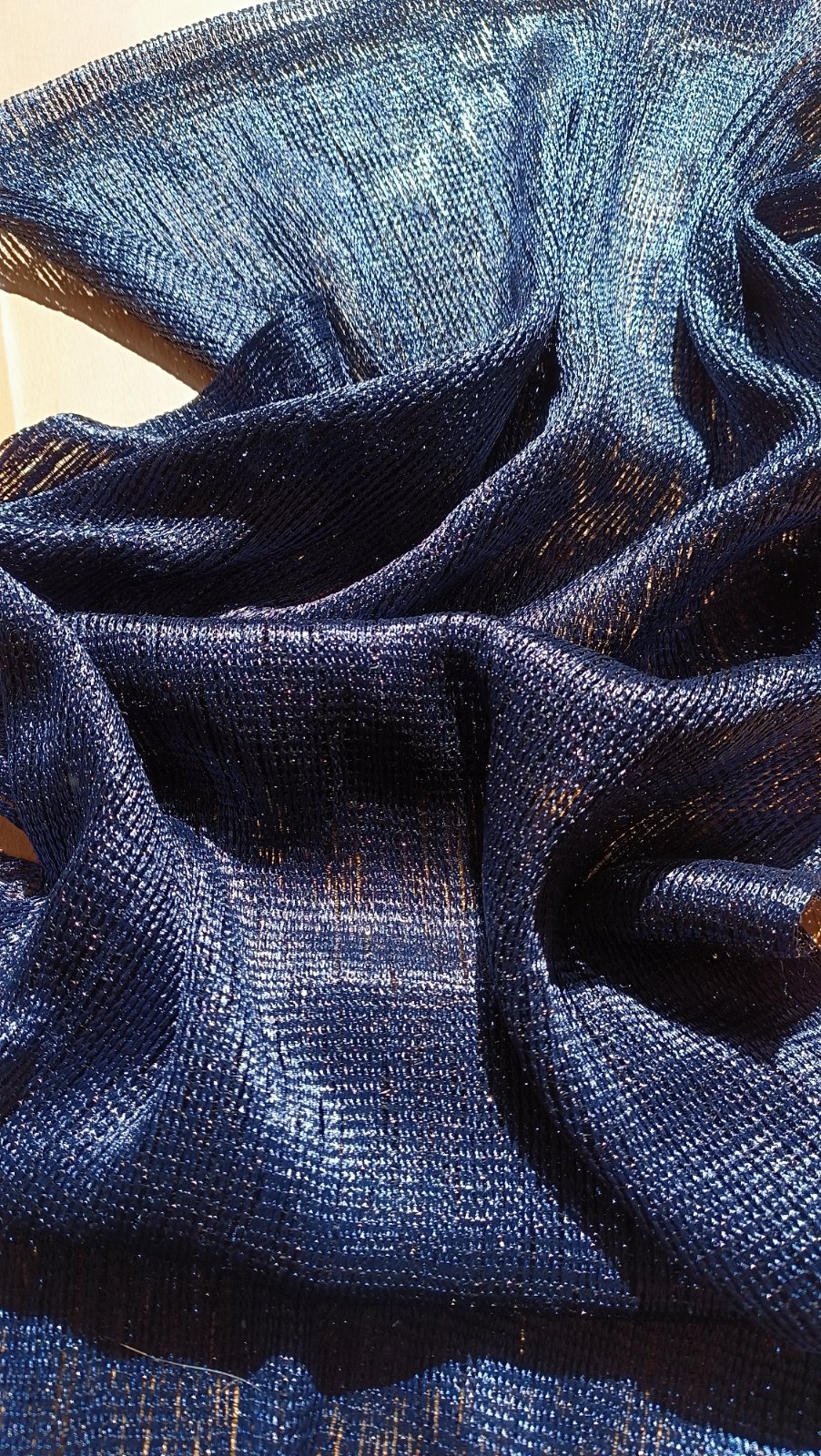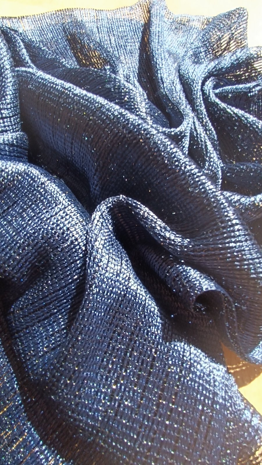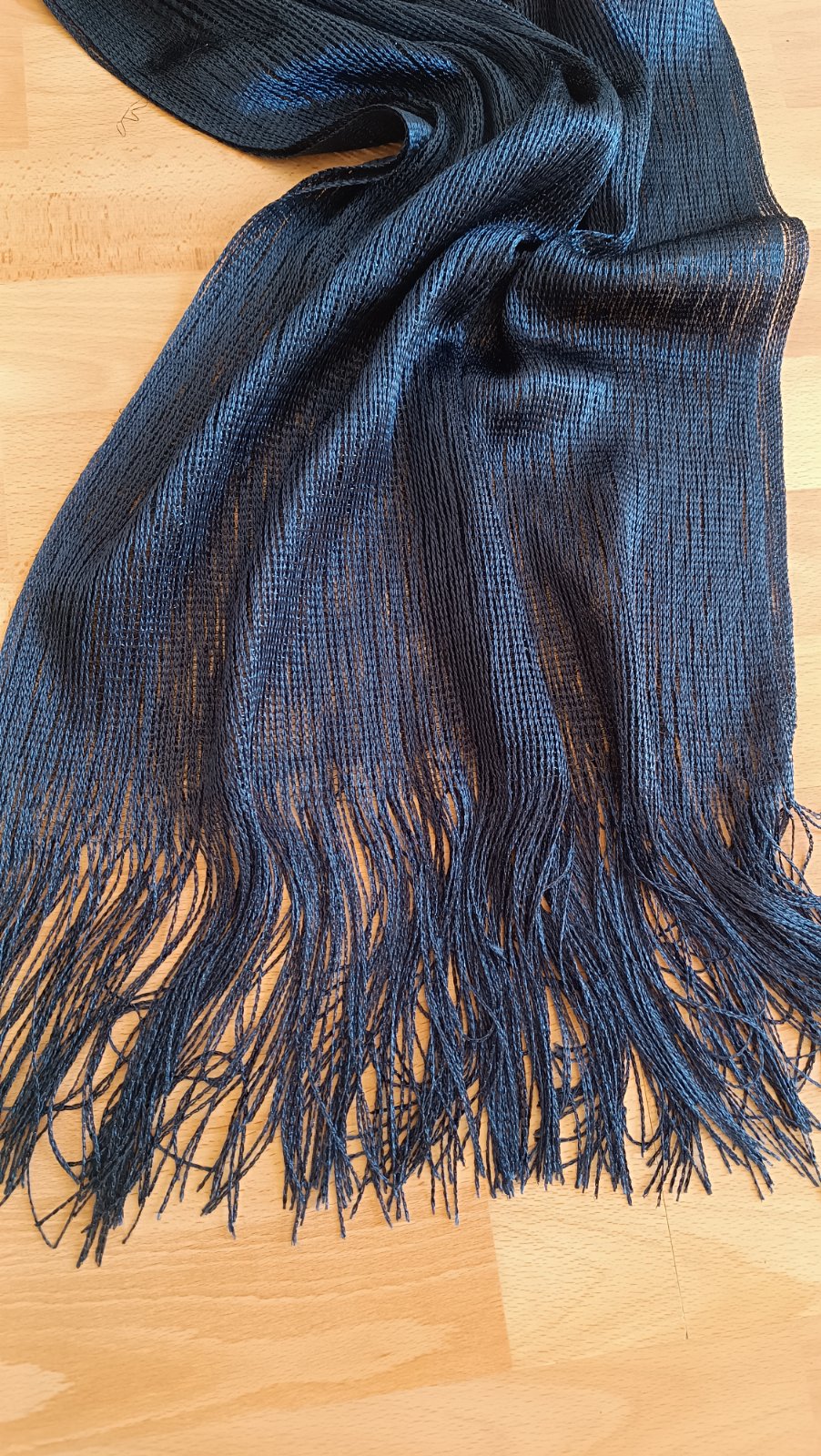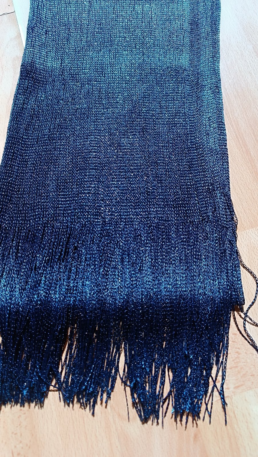 Metalický šál vhodný na slávnostnú príležitosť, šírka 44cm, dĺžka 215 cm, lesklé metalické vlákno, tmavomodrý, raz použitý na prehoz na plecia na šaty, pôvodná cena 25€