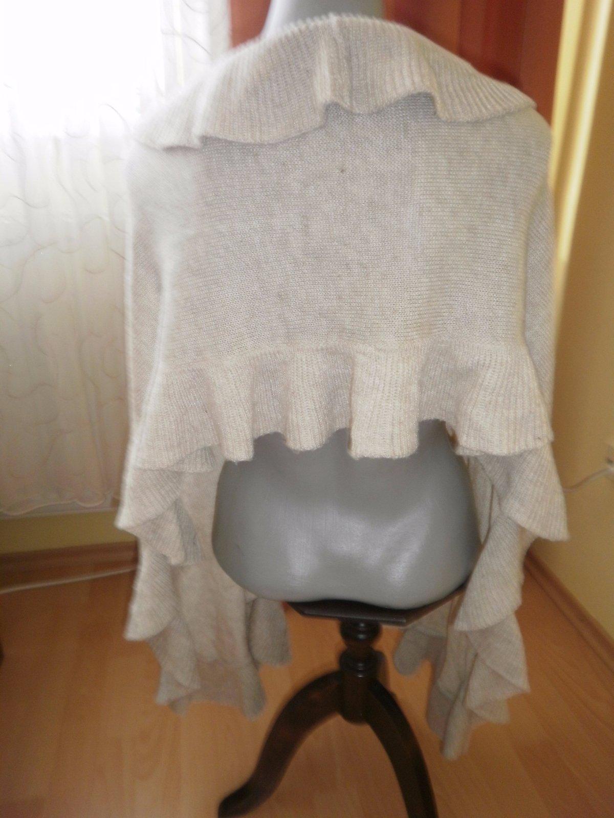 šál alebo prehoz, štítky odstrihnutý, takže neviem určiť materiál, béžová farba, 26 cm široký + z každej strany 9 cm volánik, dlhý je 190 cm aj s volánom. Brošňa nie je predmetom predaja.