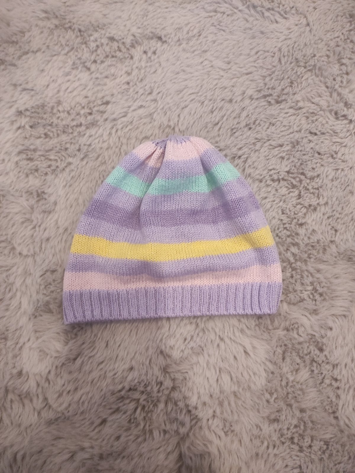 Minimálne nosená čiapka na prechodné obdobie či teplú zimu. Je mentolovej farby so striebornou nitkou. Veľkosť uvedená 92-104 ale skôr tá 104.