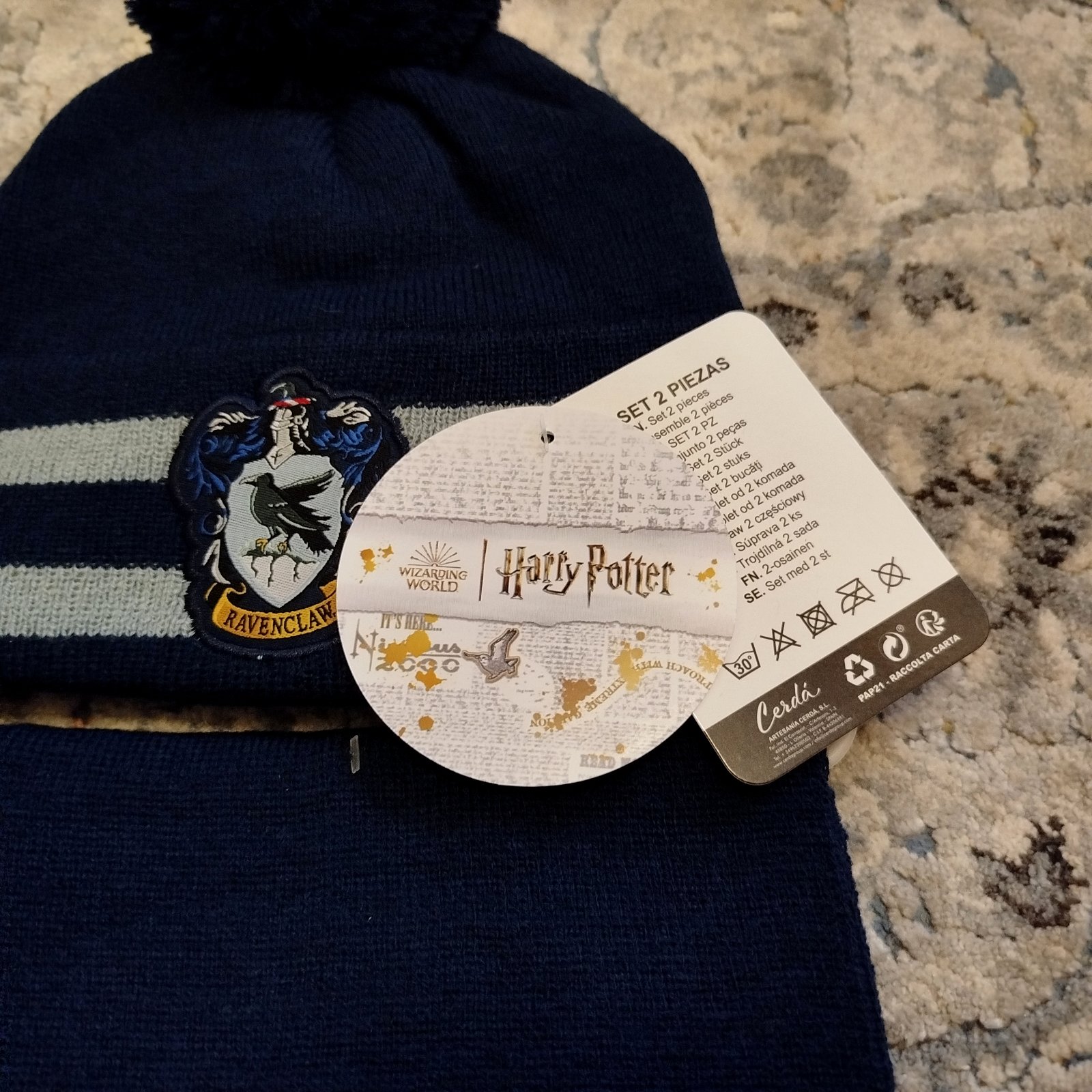 Zimný set čiapka a šál Harry Potter, nový s visačkou. Na vek od 6 do 12 rokov. Šírka čiapky na spodku v kľude je 22cm a natiahne sa až do 28cm, je elastická. Výška čiapky bez brmbolca je 20cm. Cena + pošta.