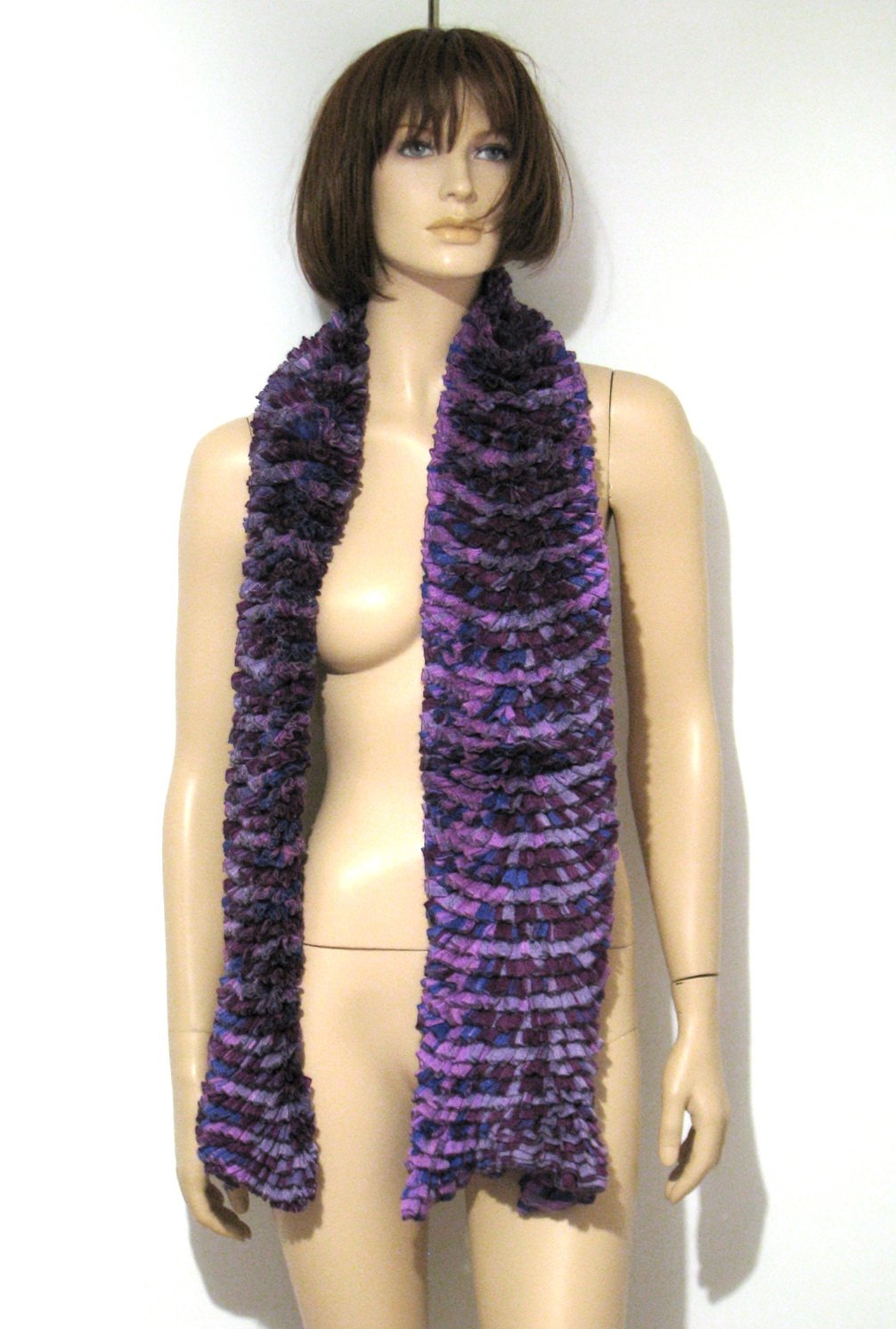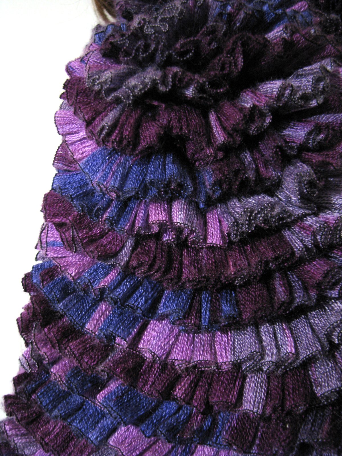 Pekný, zaujímavý "strapatý" volánikový dlhý teplejší šál v odtieňoch fialovej farby. Výborne zachovalý, bez poškodení.