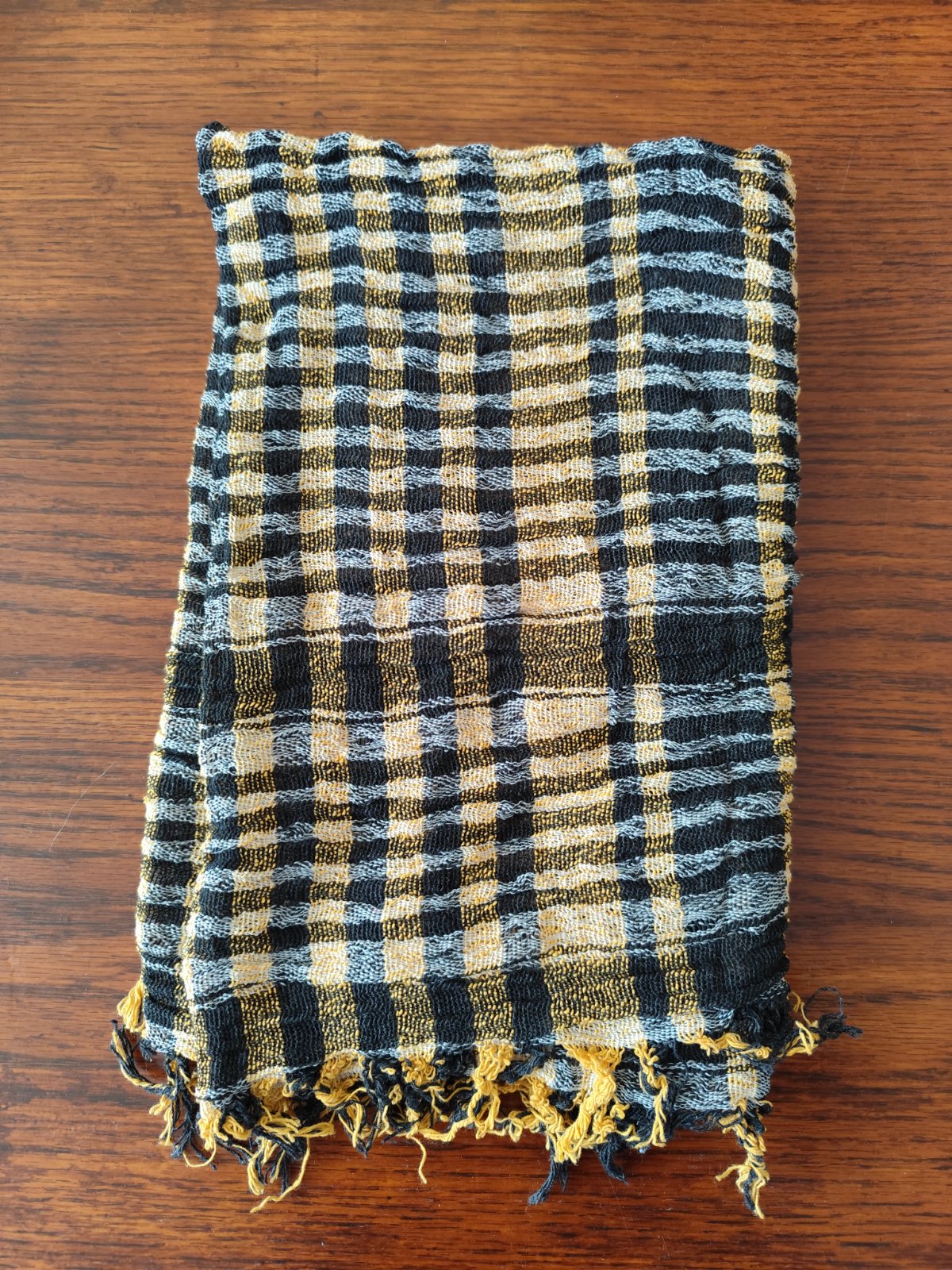 Obdĺžniková elastická šatka, rozmer v kľude 85 z 70 cm. Čierno-horčicová farba. Darujem na vyžiadanie k ľubovoľnému nákupu.