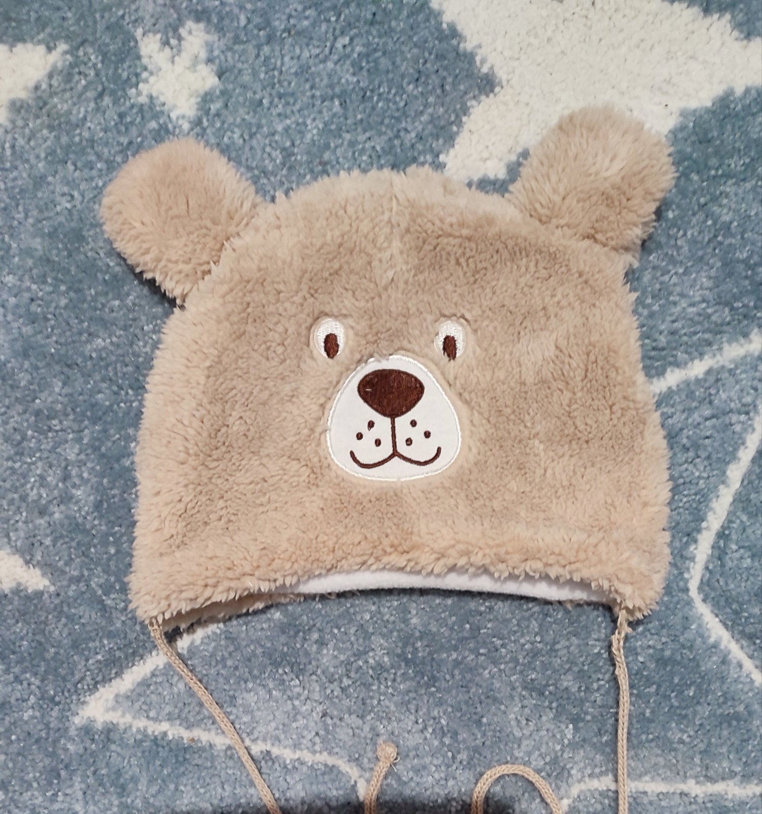 Čiapka je nenosená,po kúpe som si všimla ze uväzovanie je labilne,preto zohľadnené na cene,viď foto.Obvod 43-45cm