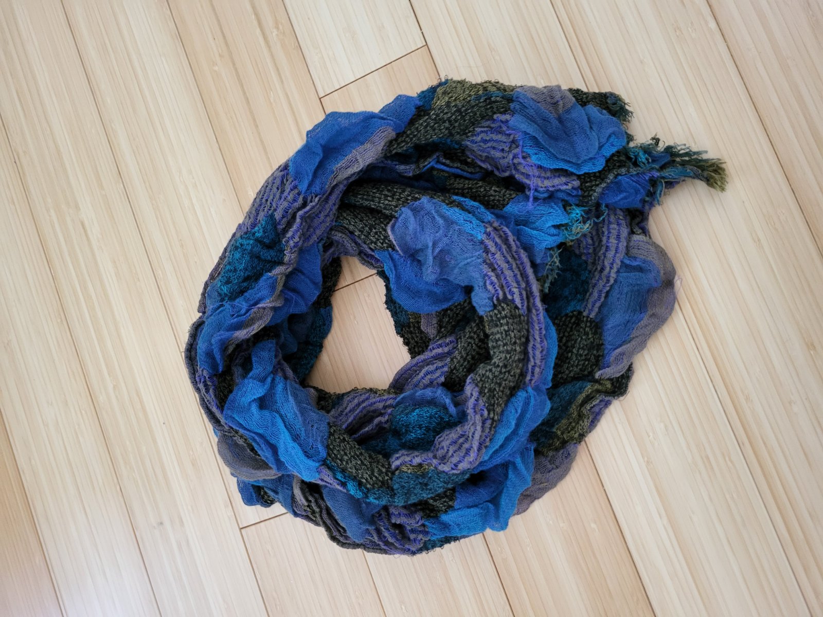 Modro-bordovy maxi šál,krásne vyzerá na krku,a naozaj zahreje,niekto využite určite častejšie ako ja🙂
