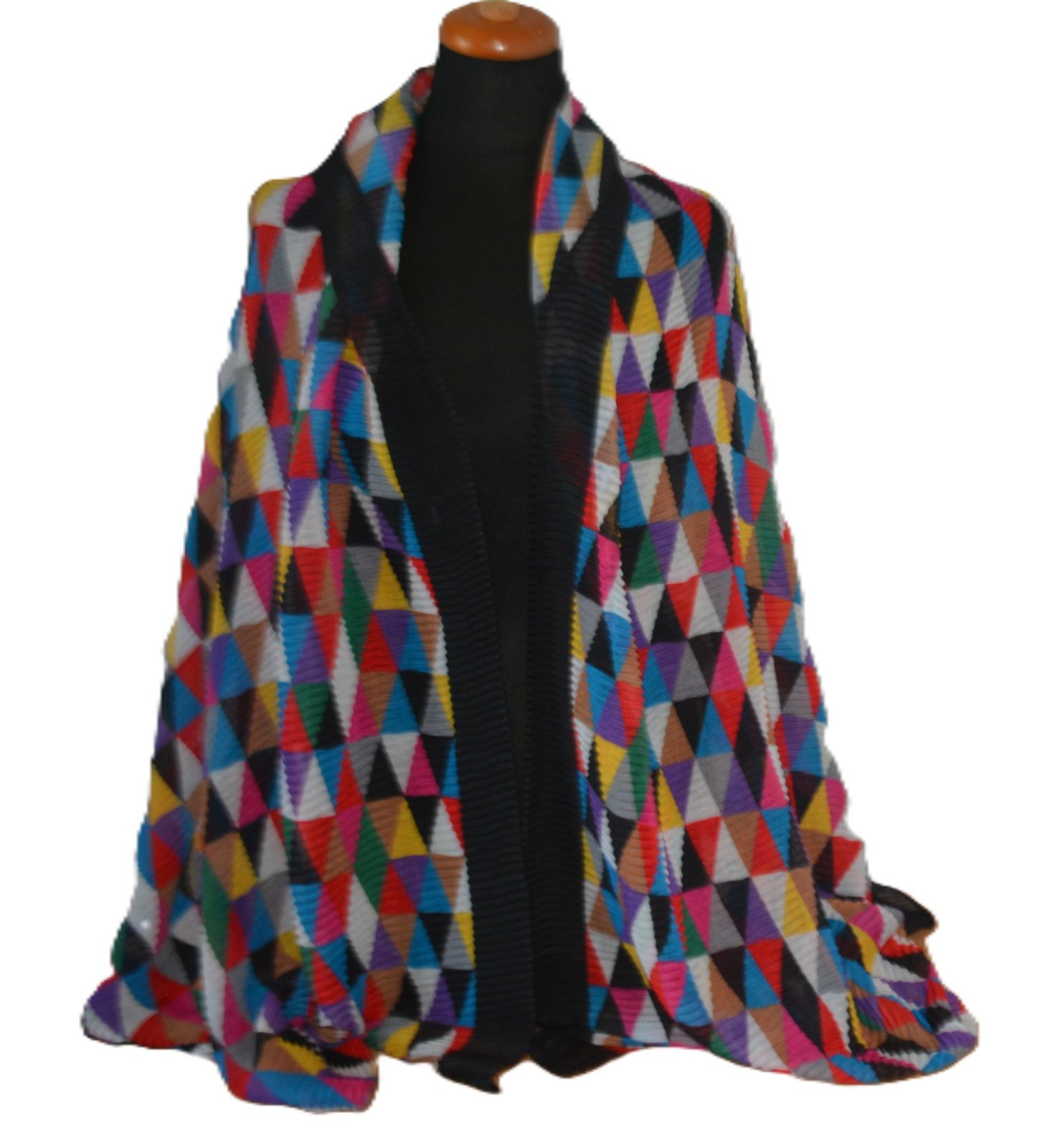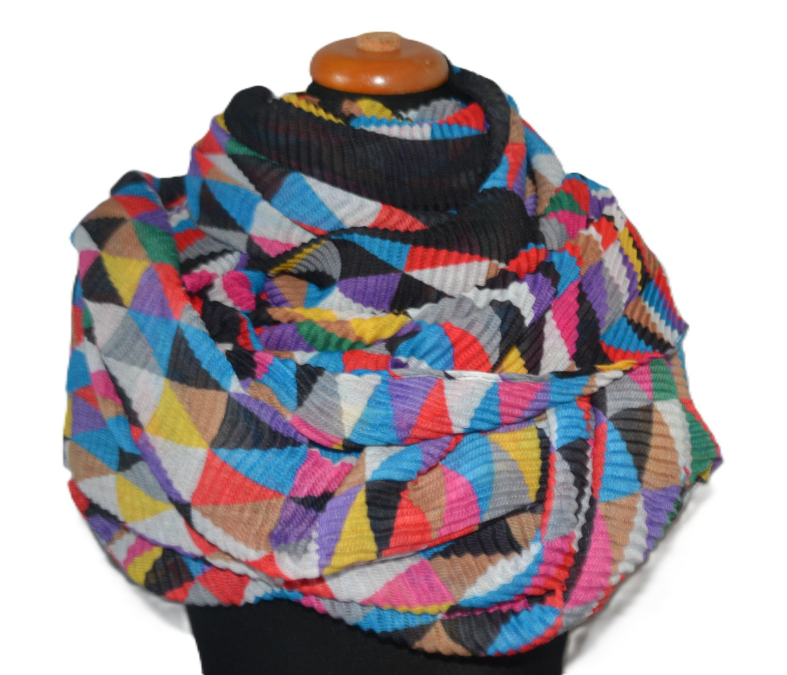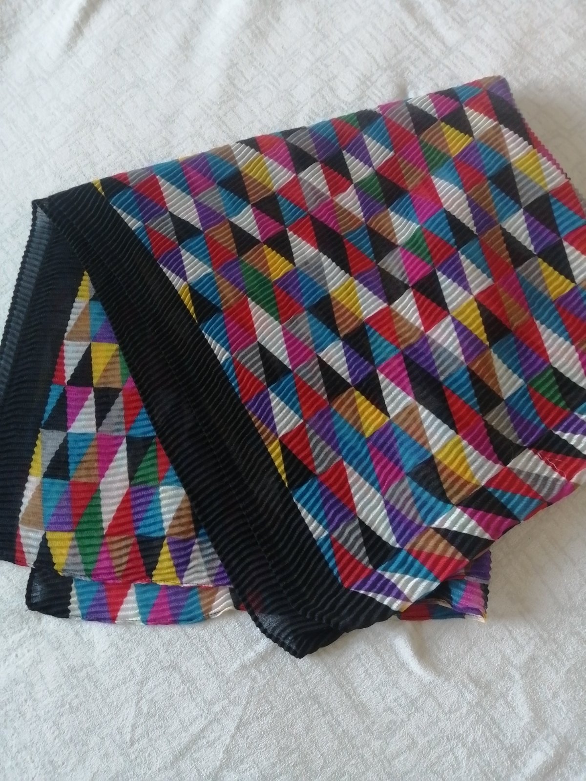 Šatka má žiarivú, celoplošnú geometrickú potlač a skladanú, jemne plisovanú štruktúru.