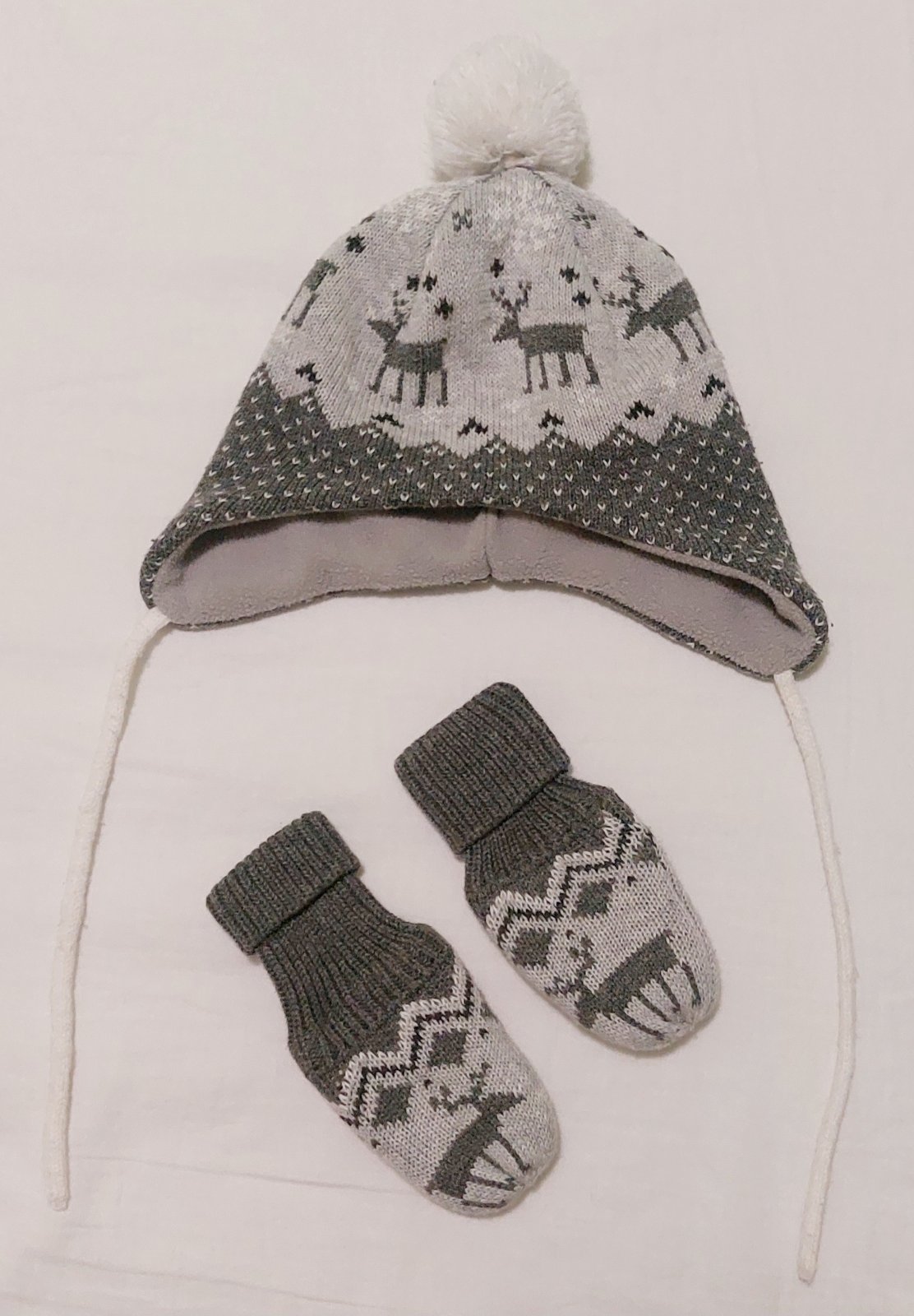 Pletená čiapka podšitá flísom s brmbolcom, zakrýva uši, na šnúrky. K tomu rukavičky. Severský vzor. Bez vád, TOP stav.
