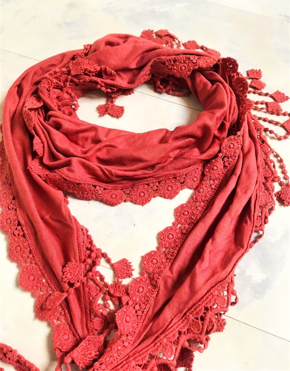 zaujímavá bavlnená šatka - tenká tričkovina,s krásnymi detailami - lemovaním,jemne strihaná do trojuholníka,farba vyblednutá - tehlovo paradajková