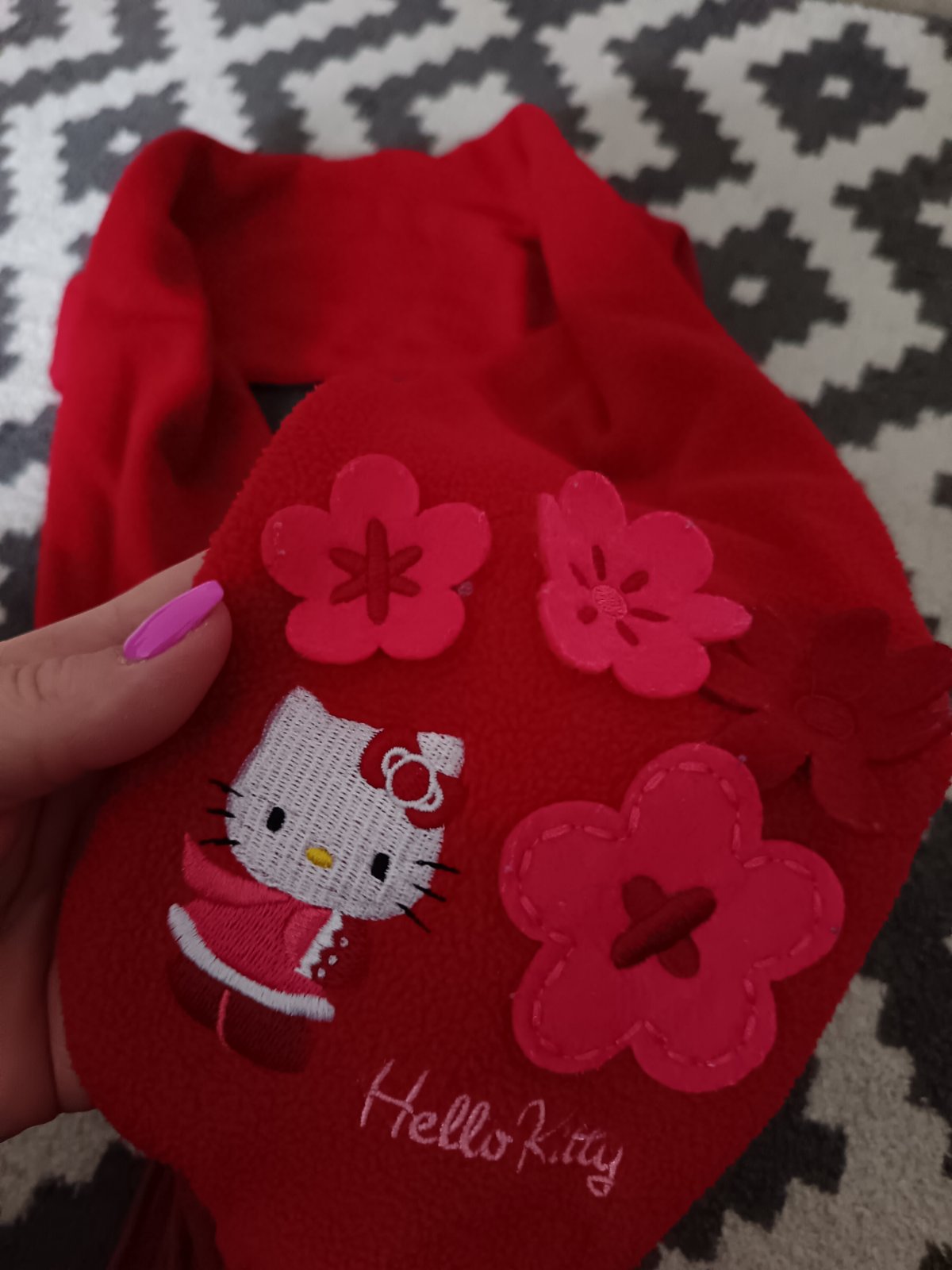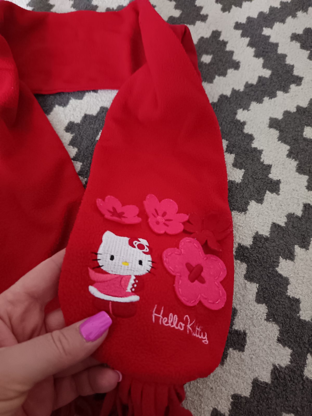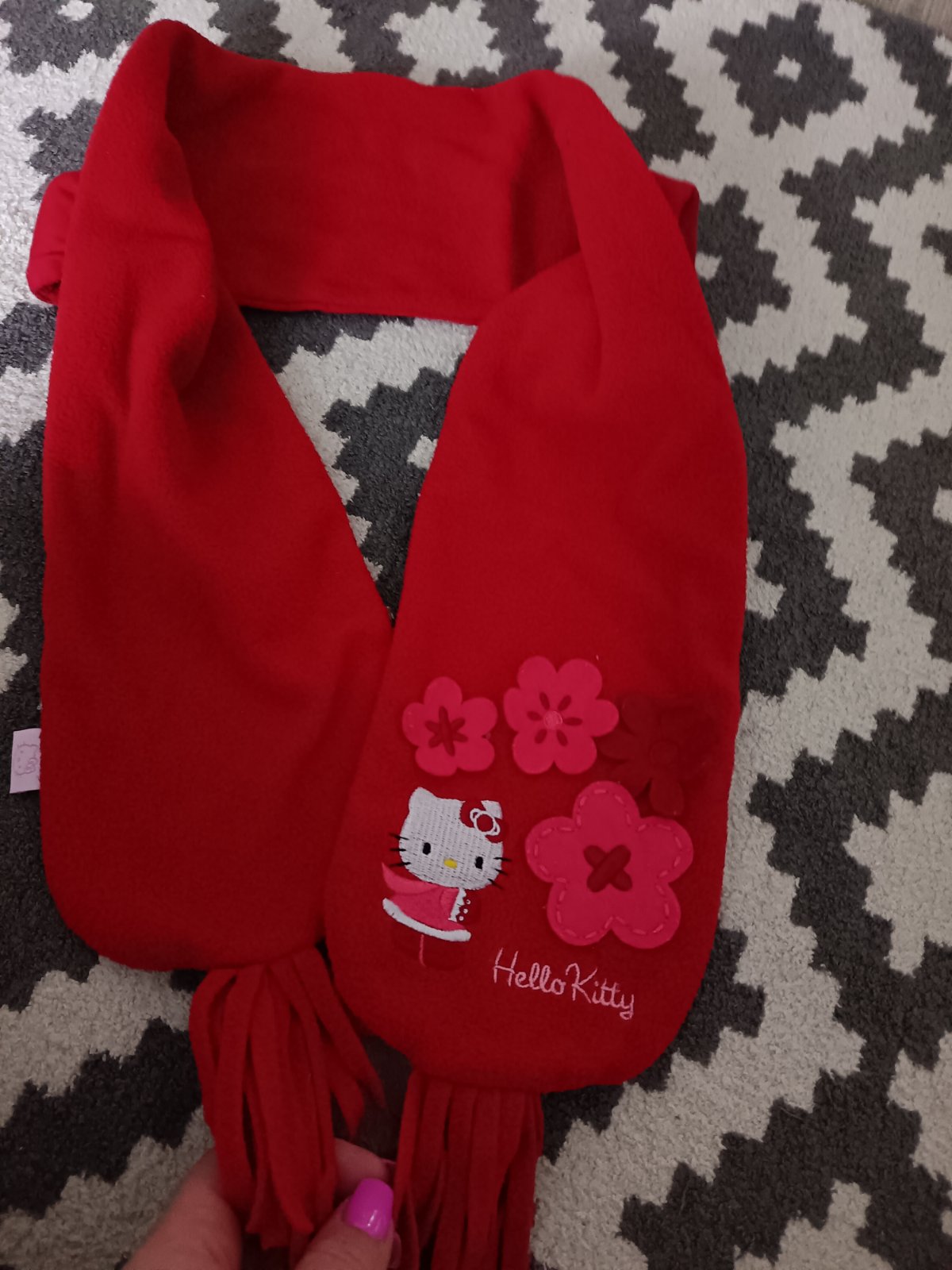 Vyšívaná Hello Kitty postavička, 3 D kvietky a vkusné strapce na dolnom kraji šáliku.