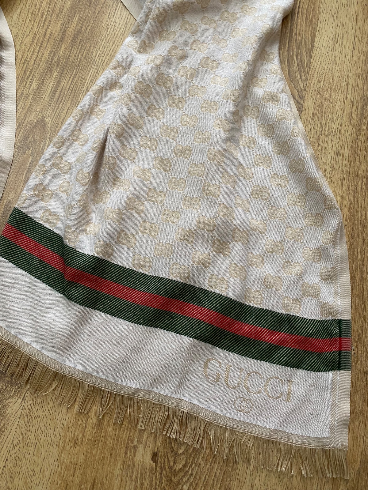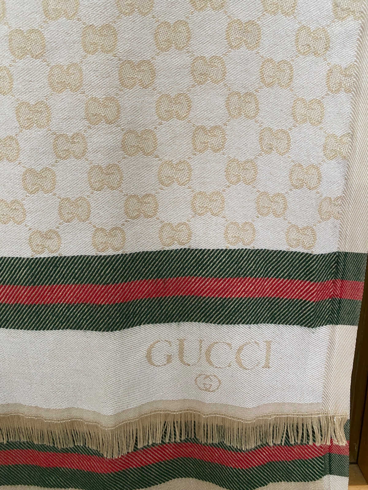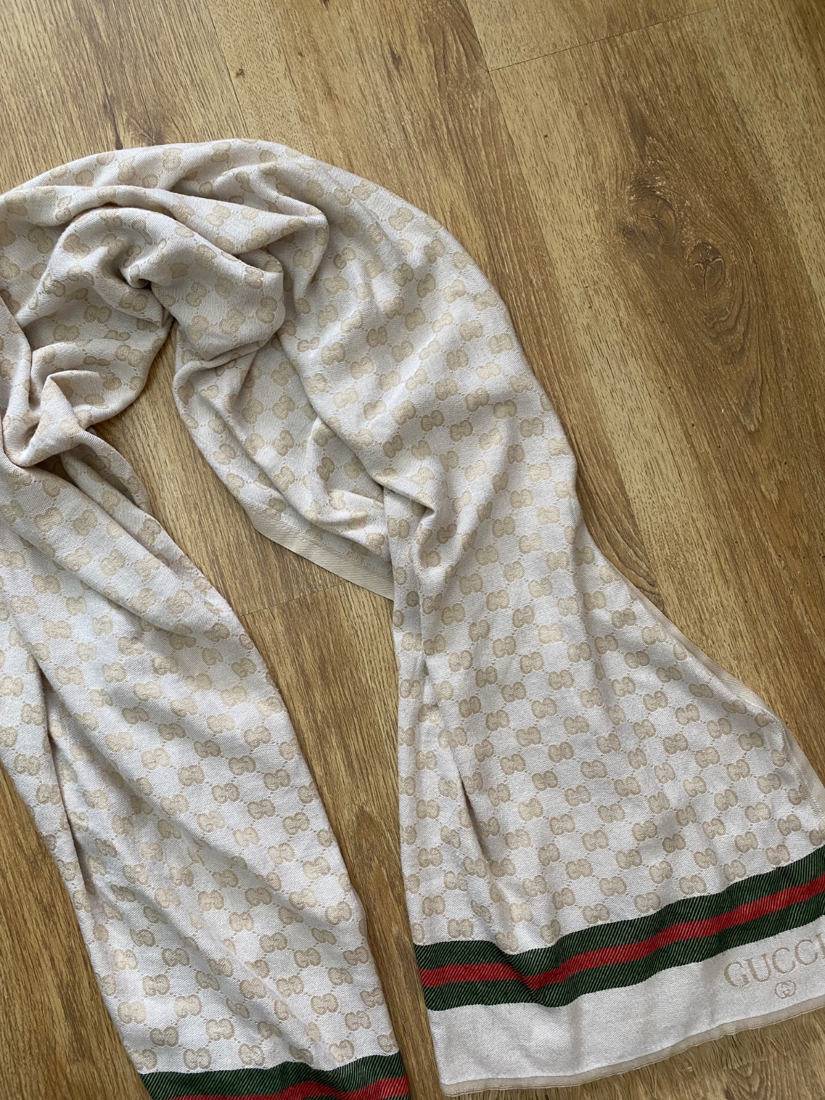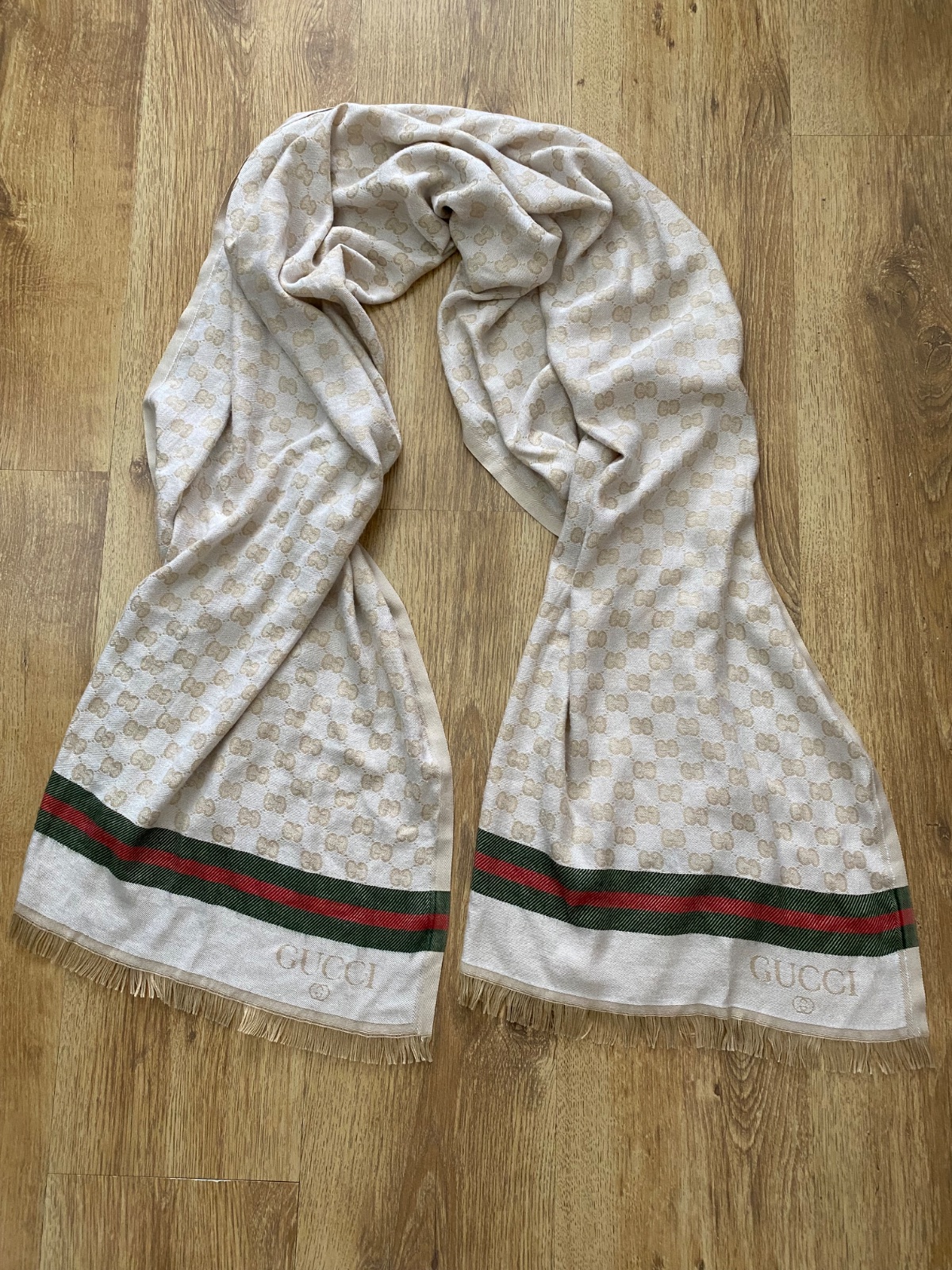 Pekny krémovo-bežovy sal s napisom gucci príjmy teply material