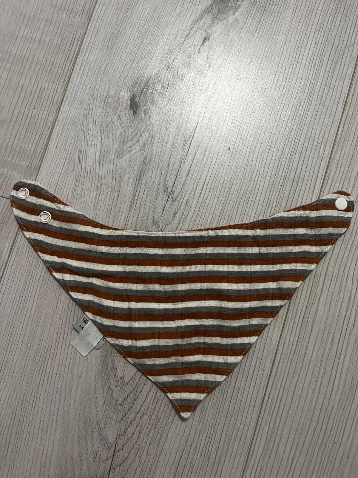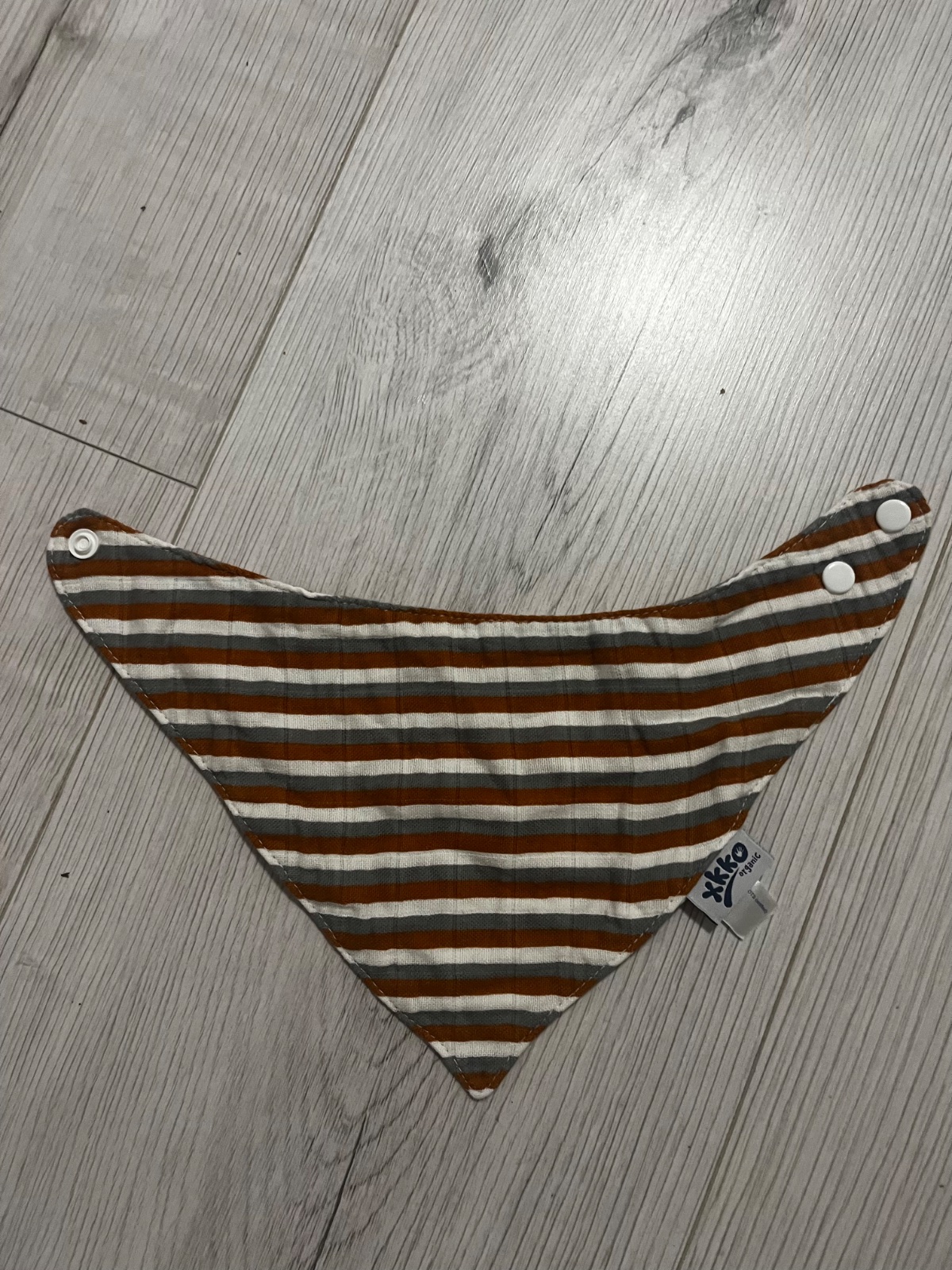 Predám pásikavý (biela/horcicova/šeda) slintáčik/šatku, ktorý je vyrobený z dvoch vrstiev so zapínaním na cvocky. Značka: XKKO, použitie od cca 6 mesiacov do 4 rokov