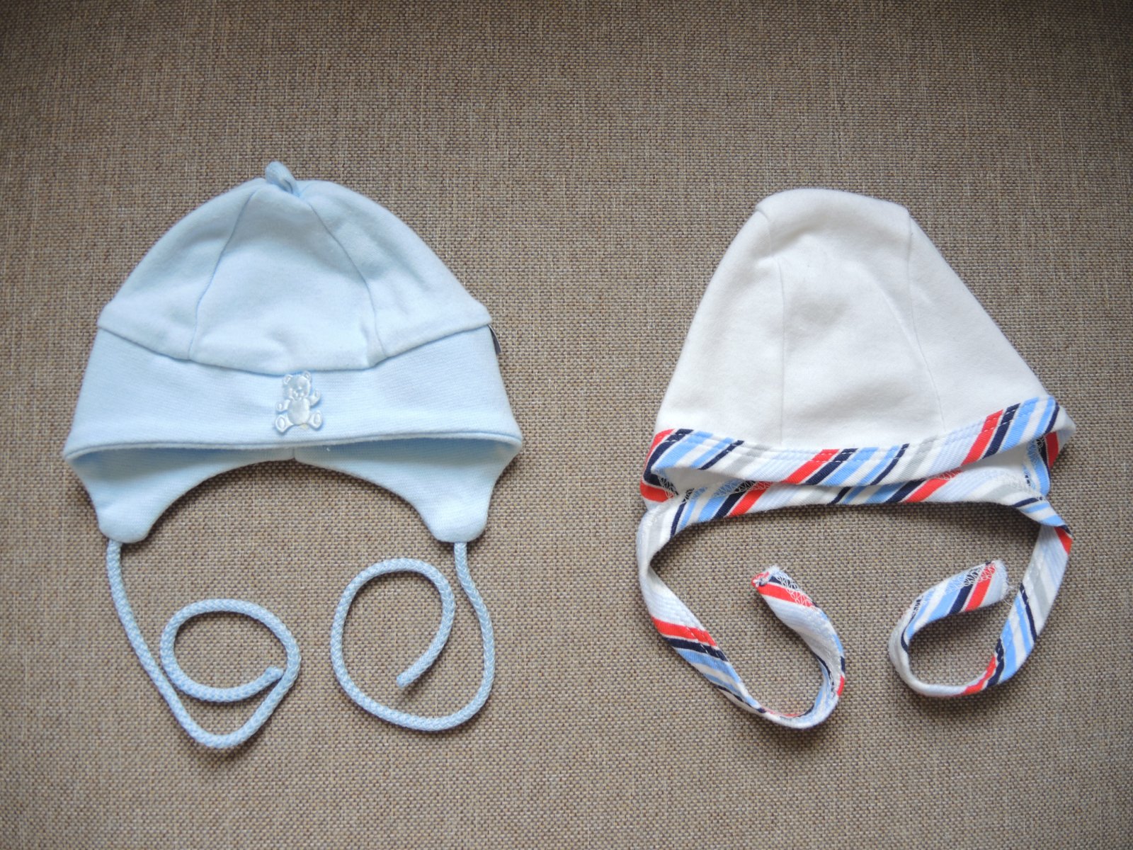Predám krásne najmenšie čiapočky. Bez žmolkov. Čiapočky len raz opraté. Drobec mal väčšiu hlavičku. Vhodné tak na predčasniatko, alebo maličké bábätko max veľkosť 50. Slovenská značka obe. Štítok má len modrá čiapočka s mackom Lady Ann. Tá biela je myslím že značky Richelieu. Pekne sedia na uškách. Cena za obe čiapočky.