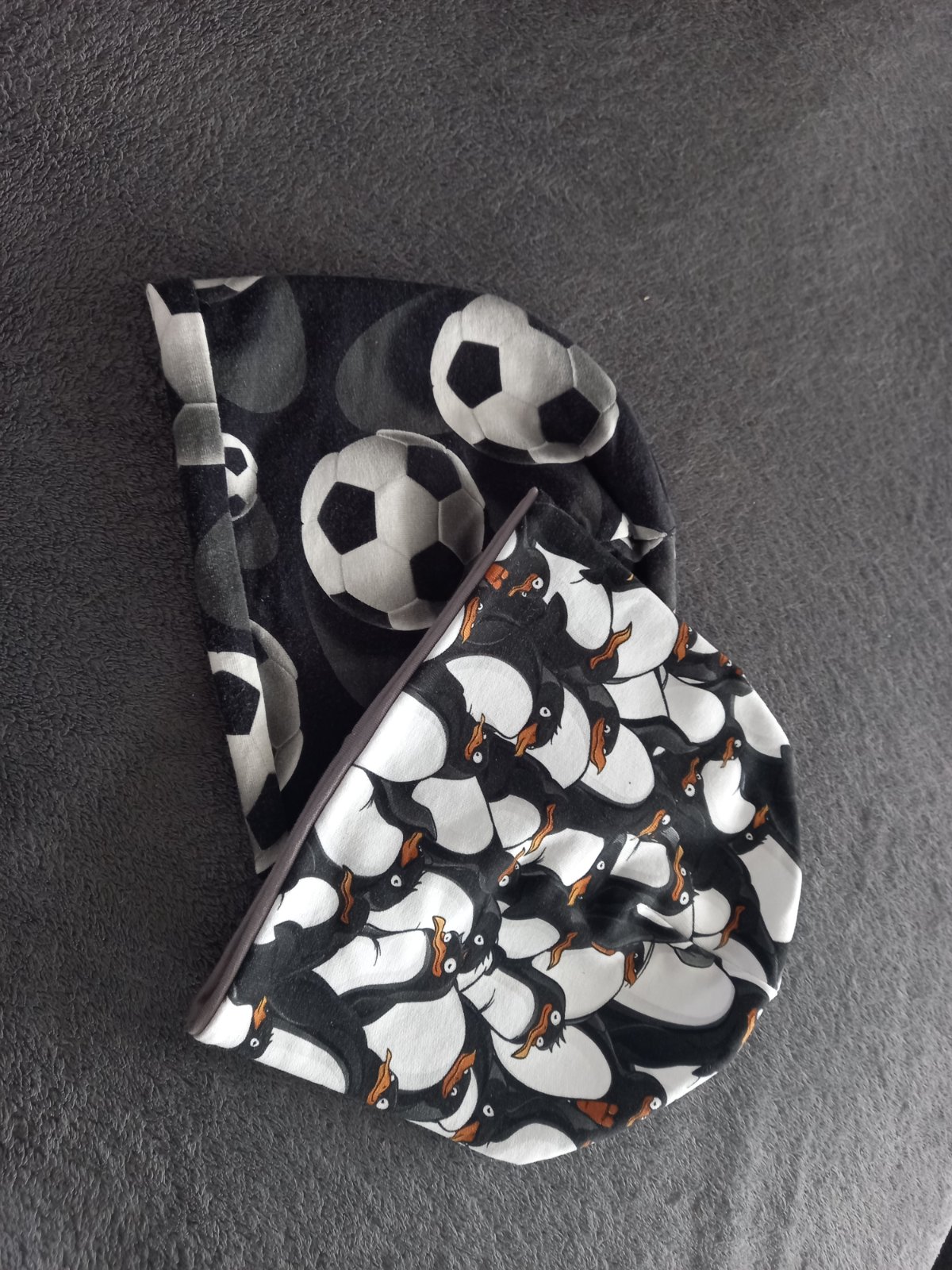 Predam čiapky na prechod, dvojvrstvove. Čiapka s tučniakmi nenosena obvod hlavy 43cm. Čiapka s futbalovymi loptami par x oblecena - obvod hlavy 40-42 cm.