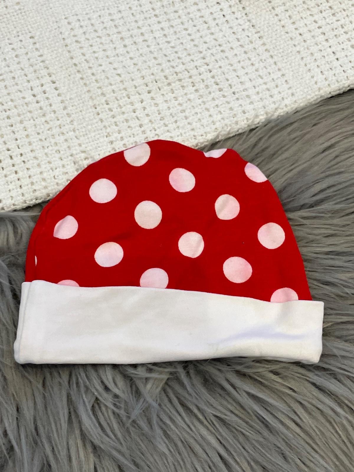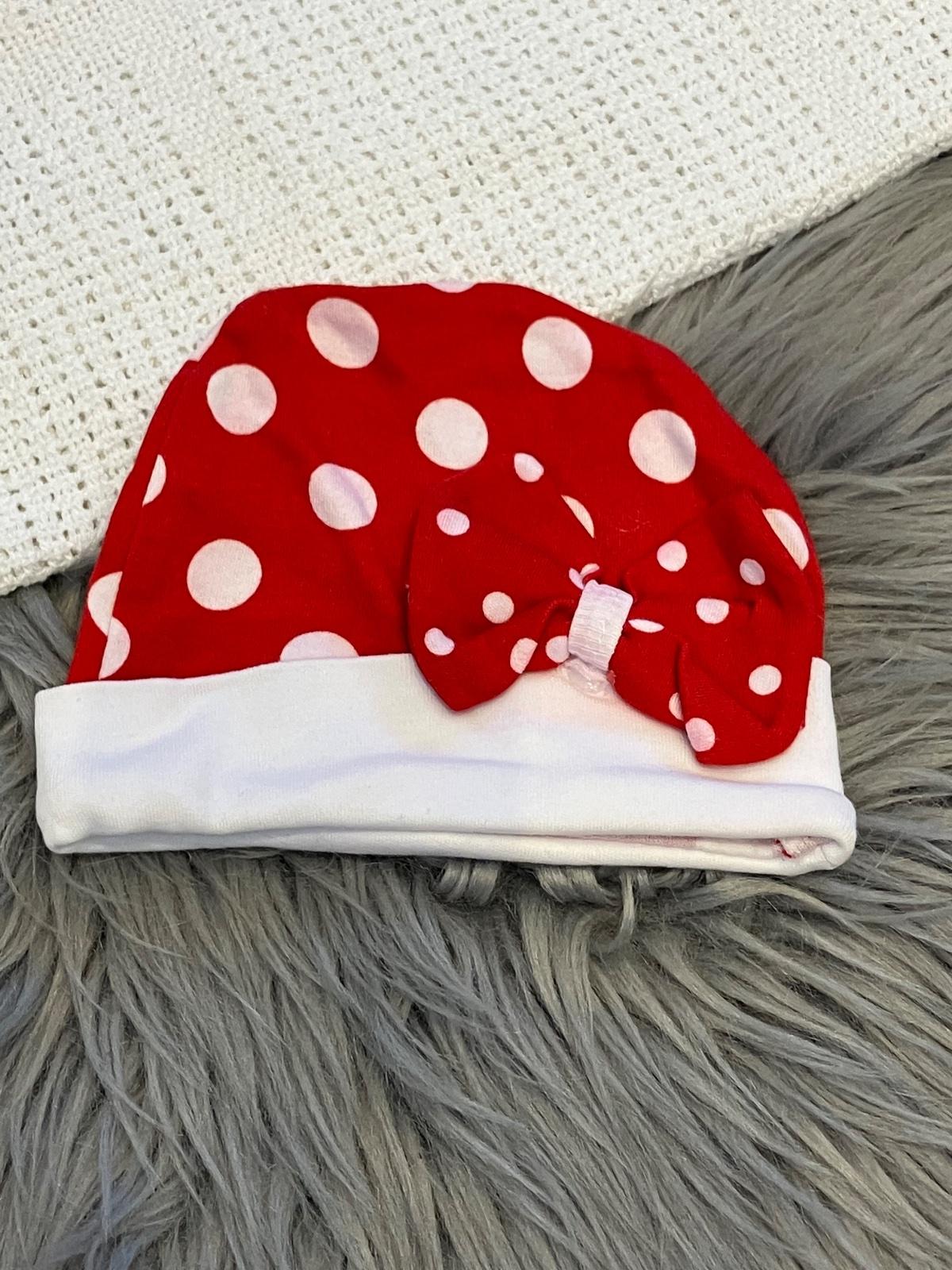 Dievčenská čiapka bodkovaná s mašličkou, tenká, elastická, farba červeno biela, veľkosť cca 68.